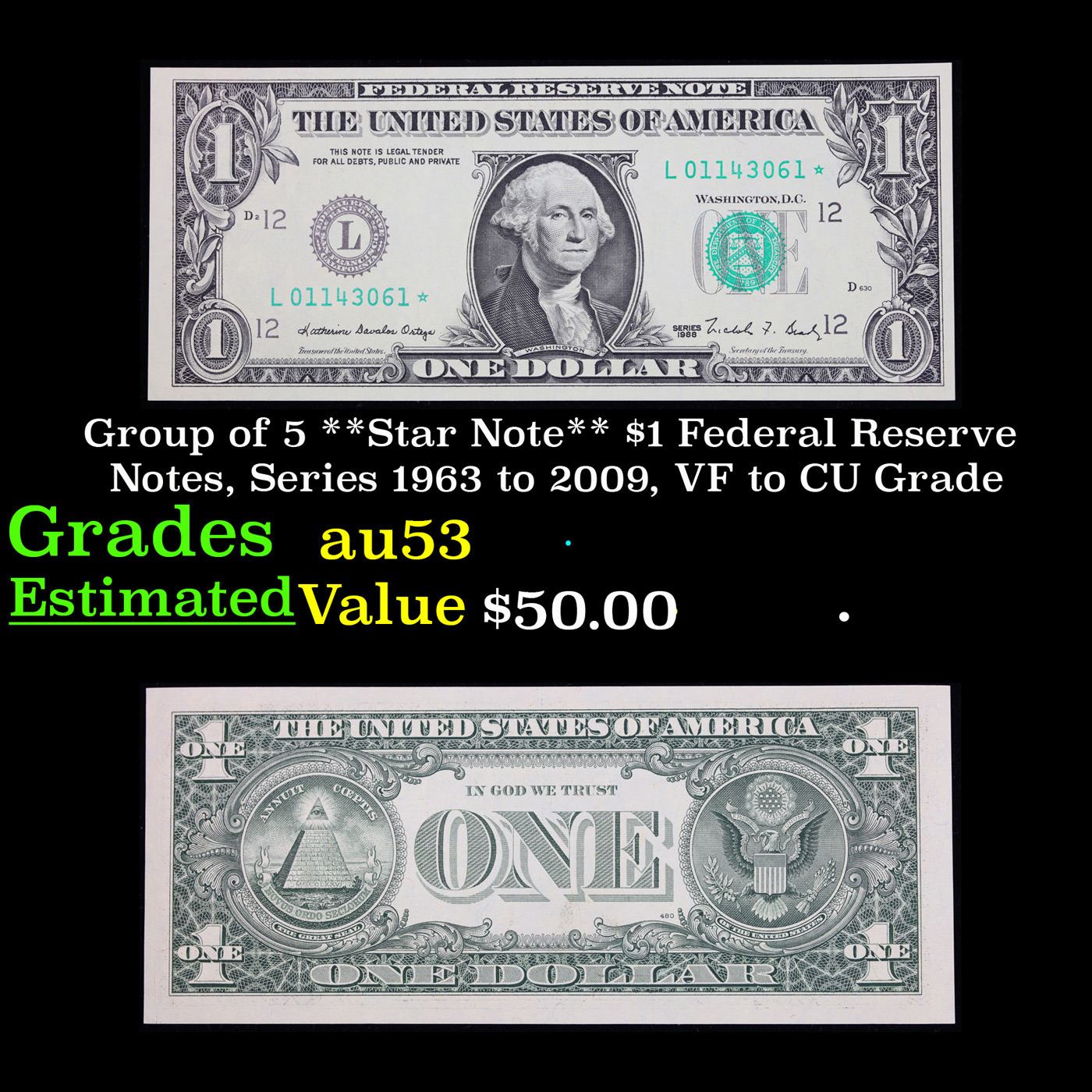 Group of 5 **Star Note** $1 Federal Reserve Notes, Series 1963 to 2009, VF to CU Grade Grades Select