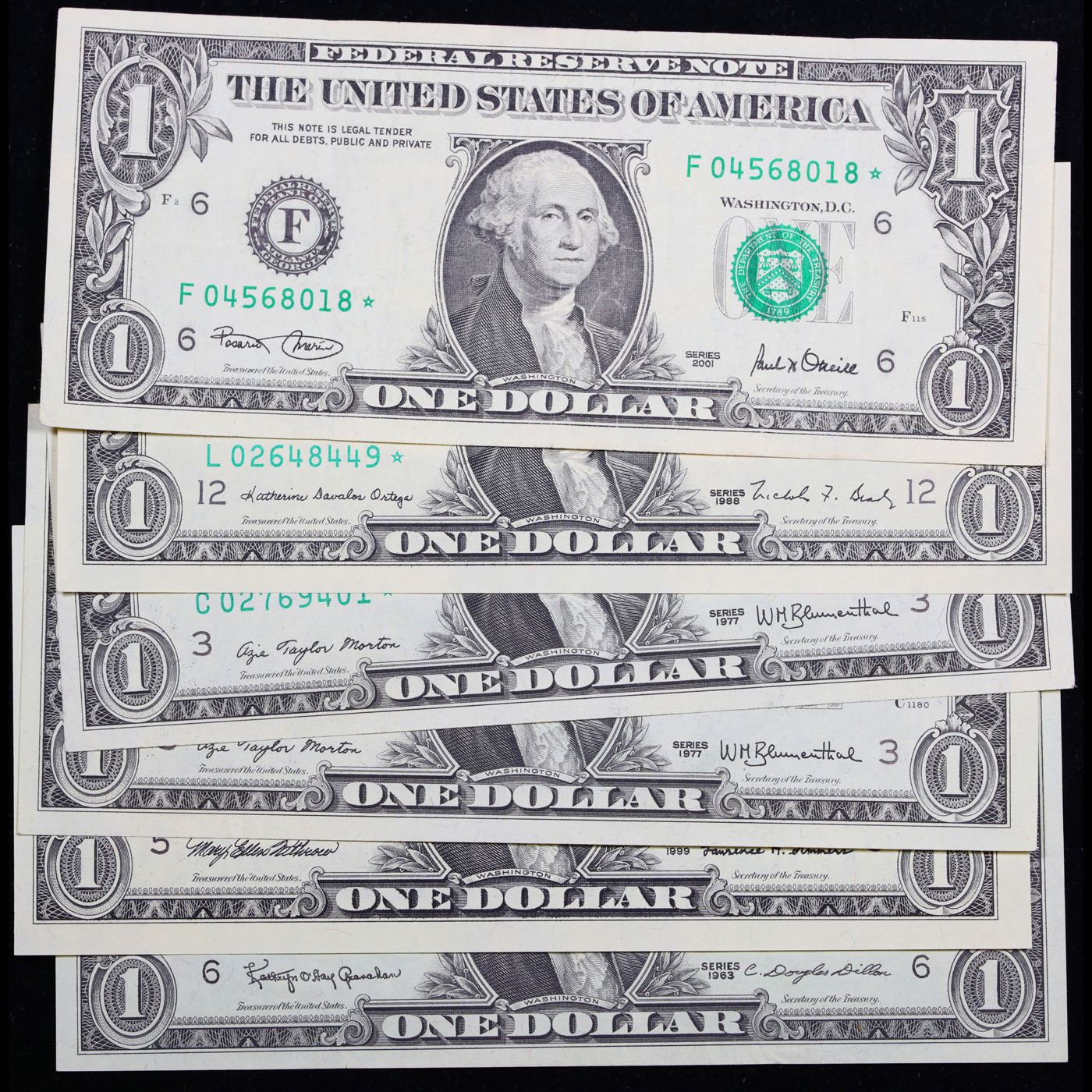 Group of 5 **Star Note** $1 Federal Reserve Notes, Series 1963 to 2009, XF to AU Grade Grades Select