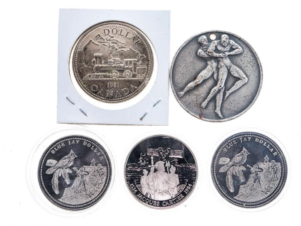 Group of 5 Trade Dollars, Blue Jay Dollars,and Medallion