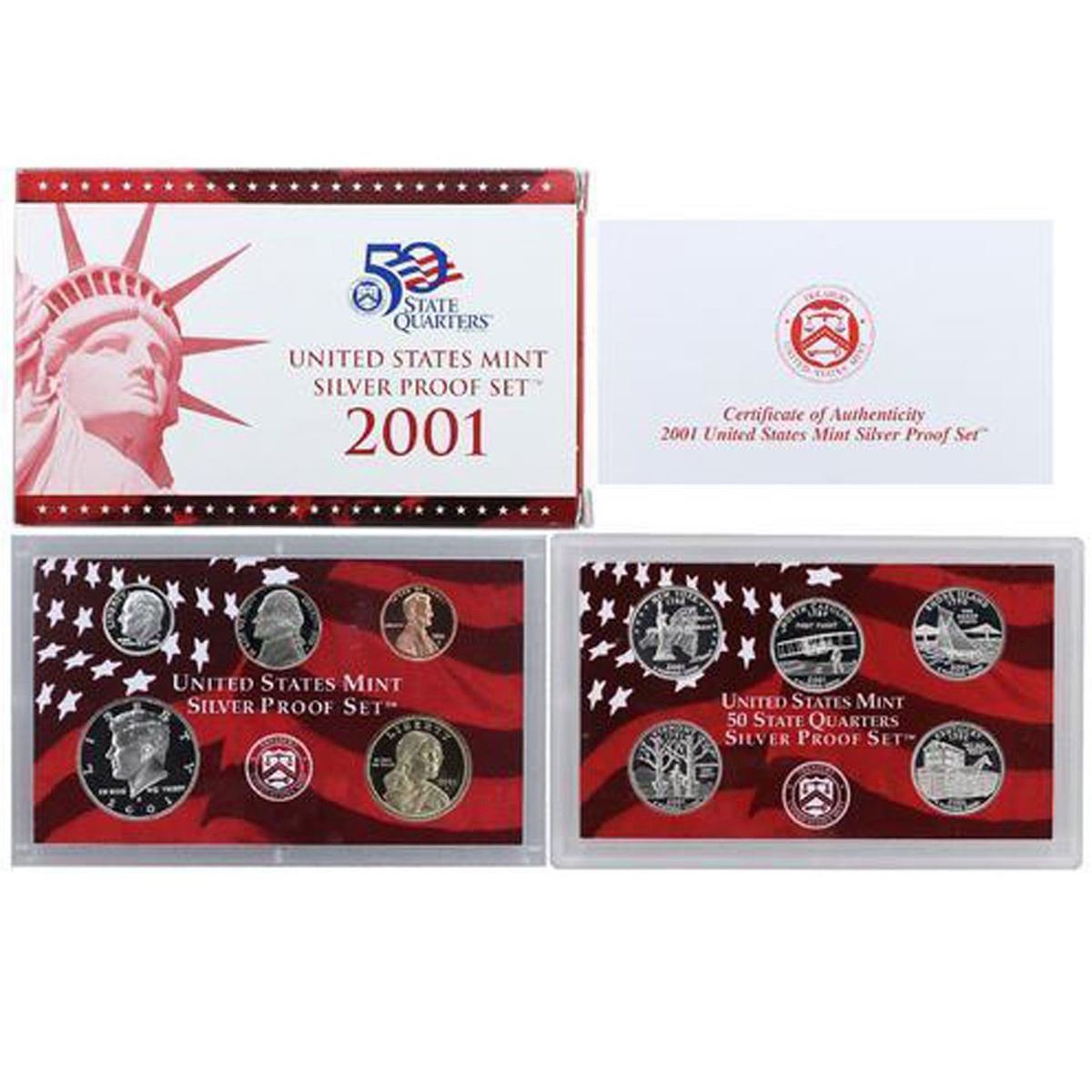 Group of 5 United States Mint Silver Proof Set 2000-2004 51 coins. All Sets contains 5 90% Silver Proof State Quarters, a 90% Silver Proof Half Dollar, a 90% Silver Proof Dime, as well as 3 additional Proof coins Including the Sacagawea Proof Dollar coin. The 2004 set has an additional Jefferson nickel as it has both Westward Journey coins. Complete with Original Packaging and COA. Note* Each set contains about 1 1/2 Ounces of Pure Silver. Approximately 7.5 ounces of silver.