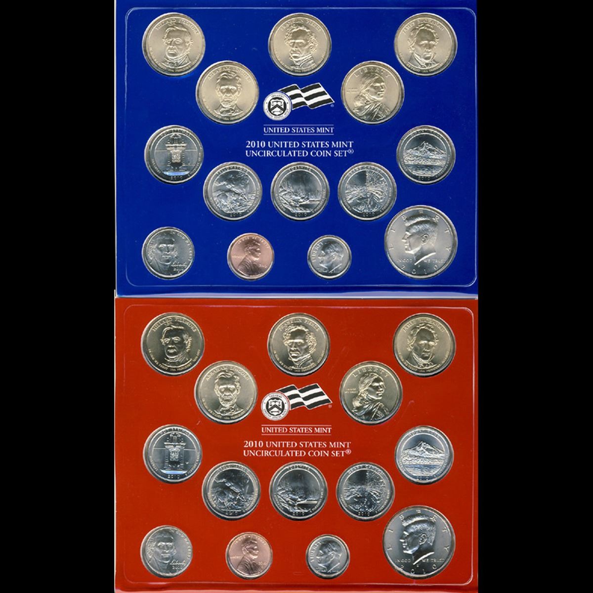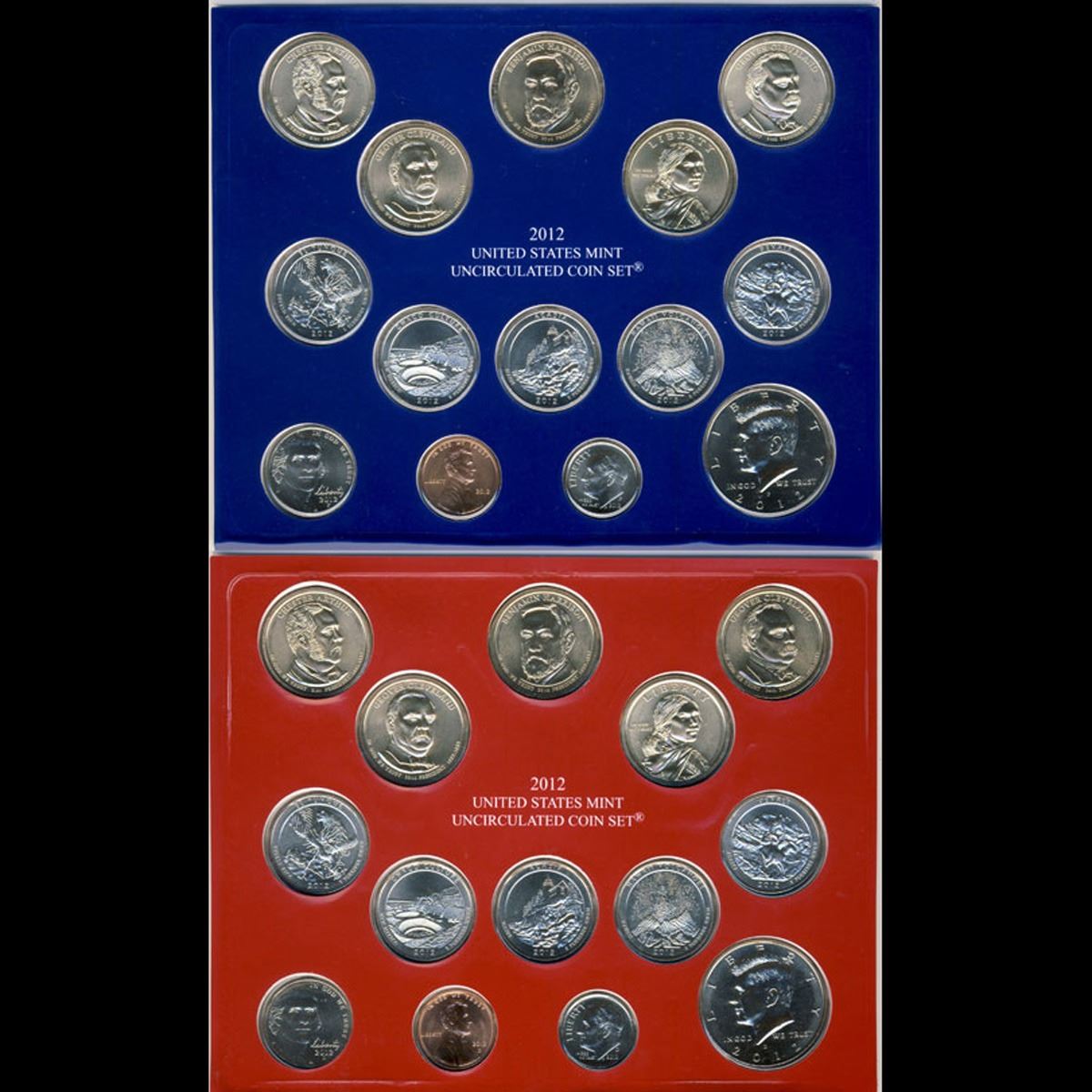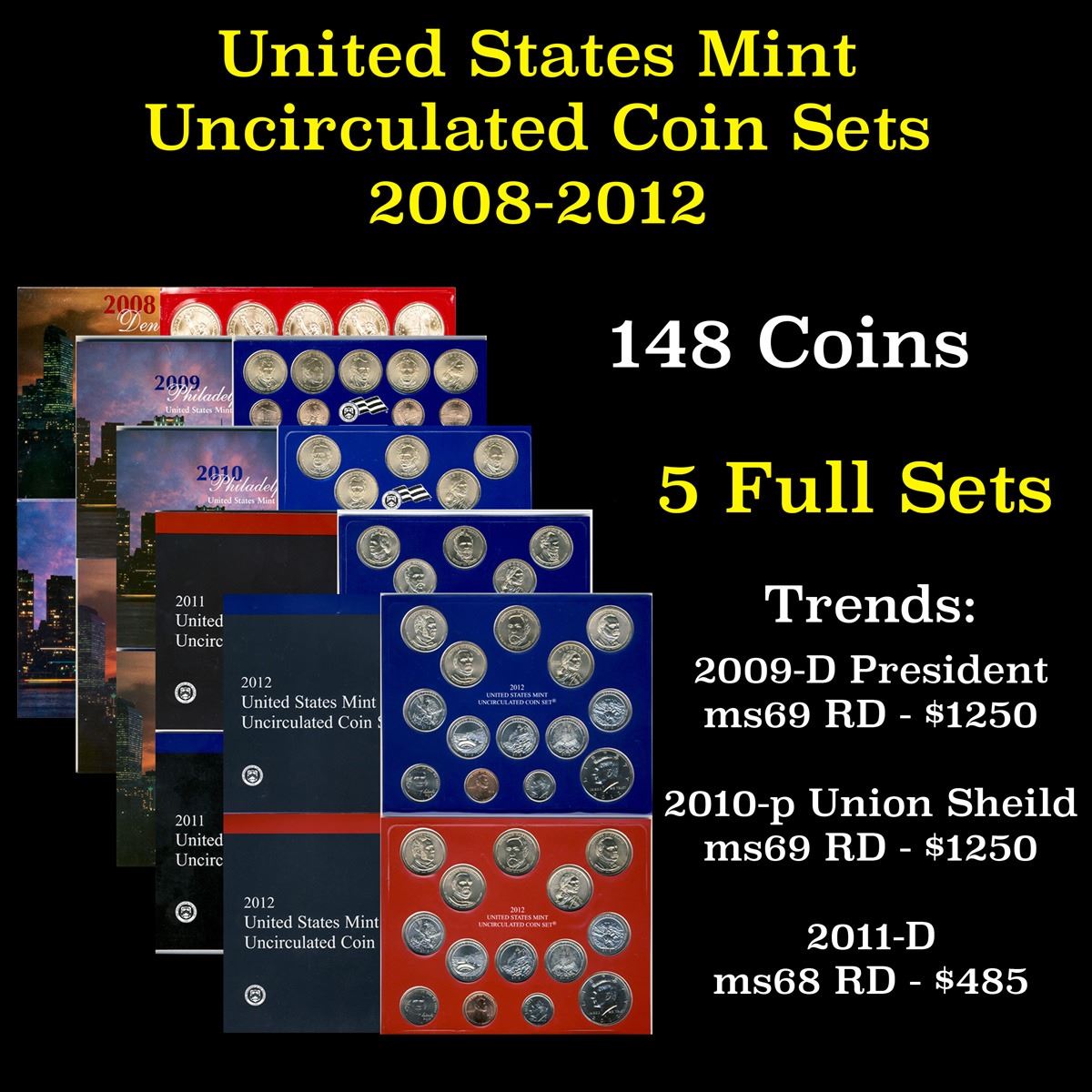 Group of 5 United States P & D Mint Uncirculated Coin Sets 2008-2012 In Original Government Packaging 148 coins. Group of 5 United States P & D Mint Uncirculated Coin Sets. Dates range from 2008-2012. The 2008, 10, 11, 12 sets all have the same coins. They contain both the Philadelphia and Denver minted Lincoln cent, Jefferson nickel, Roosevelt dime, five (5) statehood or American the Beautiful quarters, a Kennedy Half dollar, a Native American dollar, and 4 Presidential dollar coins. The 2009 set has all the same coins, but has a few extra's. It has all 4 of the Life on Lincoln cents and it has an extra quarter as this 2009 set was District of Columbia and the territories. A total of 148 coins.