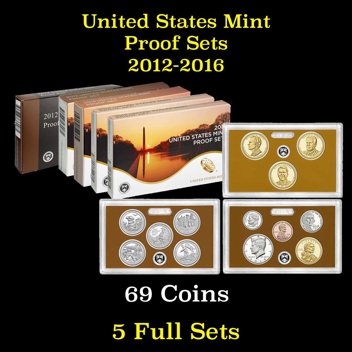 Group of 5 United States Proof Sets 2012-2016 69 coins. Group of 5 United States Proof Sets. Dates range from 2012-2016. The 2012 United States Mint Proof Set includes coins in the America the Beautiful Quarters Program, now in its third year. The quartersÕ reverse designs honor El Yunque National Forest (Puerto Rico), Chaco Culture National Historical Park (New Mexico), Acadia National Park (Maine), HawaiÕi Volcanoes National Park (Hawaii) and Denali National Park and Preserve (Alaska). The set also includes Presidential $1 Coins honoring Chester Arthur, Grover Cleveland Ð first and second terms Ð and Benjamin Harrison; a new Native American $1 Coin; and the Kennedy halfÐdollar, Jefferson 5Ðcent, Roosevelt dime, and Lincoln oneÐcent coins. The 2013 set Includes Lincoln Cent, Jefferson Nickel, Roosevelt Dime, Kennedy Half Dollar, Native American "Golden" Dollar, five America the Beautifulª Quarters representing White Mountain National Forest, Perry's Victory and International Peace Memorial, Great Basin National Park, Fort McHenry National Monument, and Mount Rushmore National Memorial (all Copper-Nickel Clad). It also includes four Presidential Dollars: William McKinley, Theodore Roosevelt, William Howard Taft, and Woodrow Wilson (Copper-Nickel Clad). The 2013 Native American Dollar within this set features a one-year-only design commemorating the first treaty ever between the United States and a Native American tribe, the Treaty with the Delawares in 1778. The 2014 set includes Lincoln Cent, Jefferson Nickel, Roosevelt Dime, Kennedy Half Dollar, Native American "Golden" Dollar, five America the Beautifulª Quarters representing Great Smokey Mountains National Park, Shenandoah National Park, Arches National Park, Great Sand Dunes National Park, and Everglades National Park (all Copper-Nickel Clad). It also includes four Presidential Dollars: Warren Harding, Calvin Coolidge, Herbert Hoover, and Franklin D. Roosevelt (Copper-Nickel Clad). The 2015 set includes the five America the Beautiful Quarters. This series will feature one National Park or Site in each of the 50 States, the District of Columbia, and the U.S. Territories. The places featured on the 2015 coins will include Homestead National Monument in Nebraska, Kisatchie National Forest in Louisiana, Blue Ridge Parkway in North Carolina, Bombay Hook National Wildlife Refuge in Delaware, and Saratoga National Historical Park in New York. Other highlights of the set include the increasingly rare 2015 Presidential Dollars, including Harry S. Truman, Dwight D. Eisenhower, John F. Kennedy, and Lyndon B. Johnson. The 2016 set includes America the Beautiful designs for Shawnee National Forest in Illinois, Cumberland Gap National Historic Park in Kentucky, Harpers Ferry National Historical Park in West Virginia, Theodore Roosevelt National Park in North Dakota, and Fort Moultrie at Fort Sumter National Monument in South Carolina. In addition, presidential dollars: Nixon, Ford, and Reagan. Also included are the Lincoln Cent, Jefferson Nickel, Roosevelt Dime, Kennedy Half-Dollar and Native American Dollar Ð all dated 2016. Each set will is housed in official U.S. Mint packaging and include an official COA from the U.S. Mint.