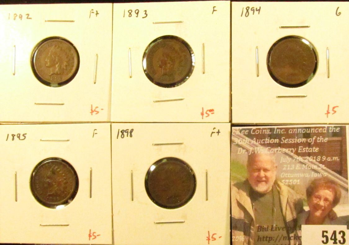 Group of 5 different Indian Head Cents – 1892, 1893, 1895, 1898, all F, 1894 (better date), G, group