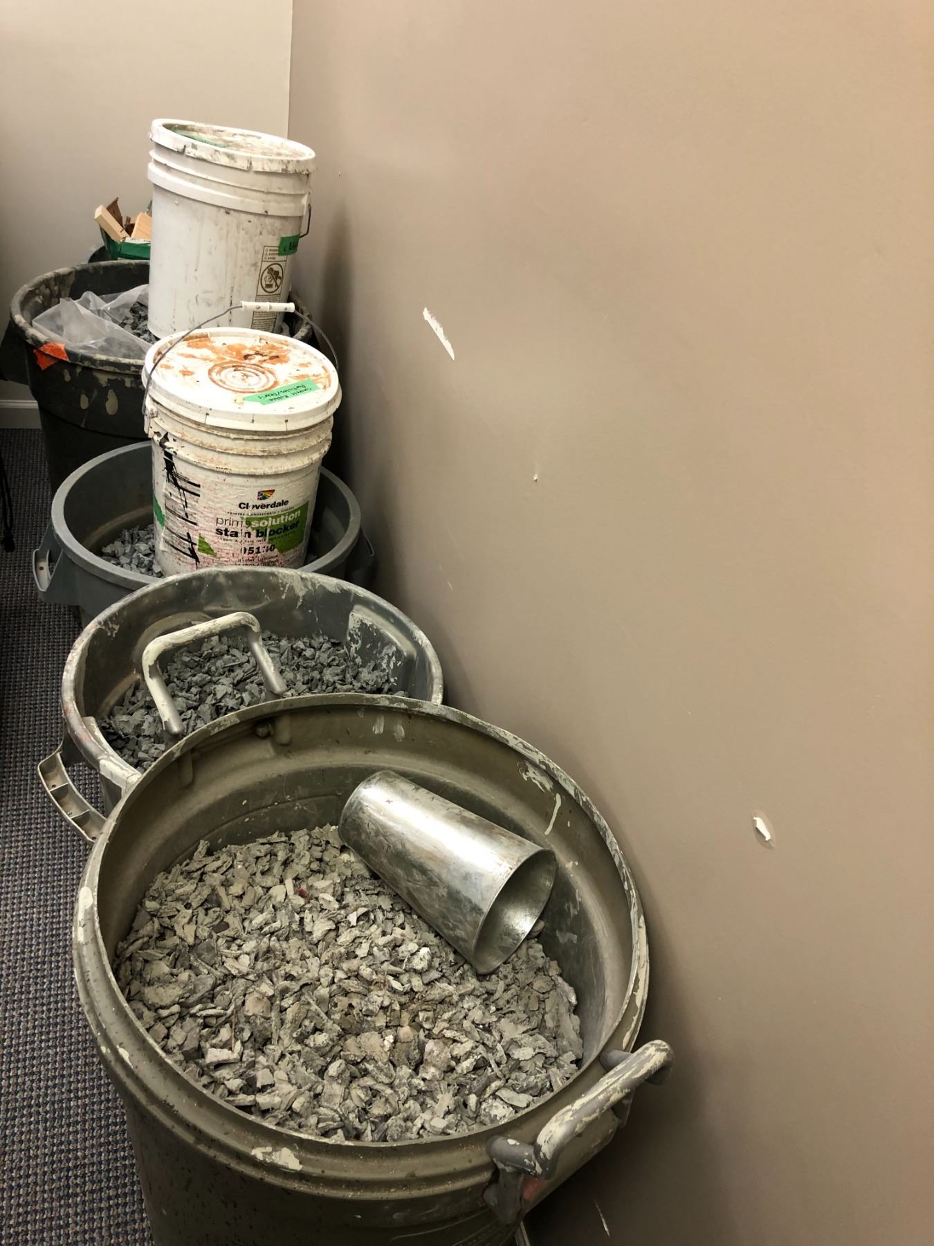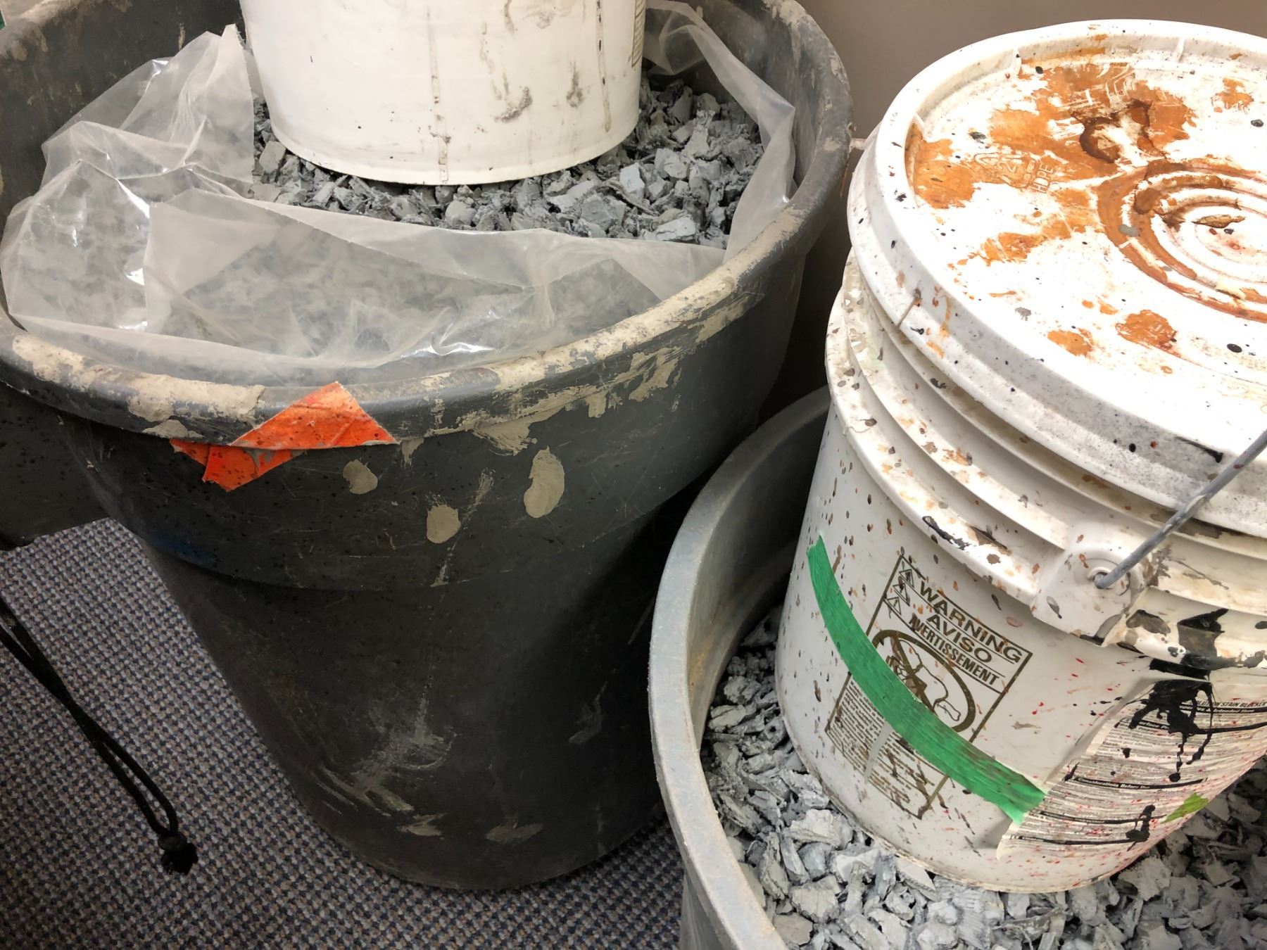 a group of 5 garbage cans filled with concrete rubble particles and debris plus 2 buckets of painted rocks from popular sci-fi series