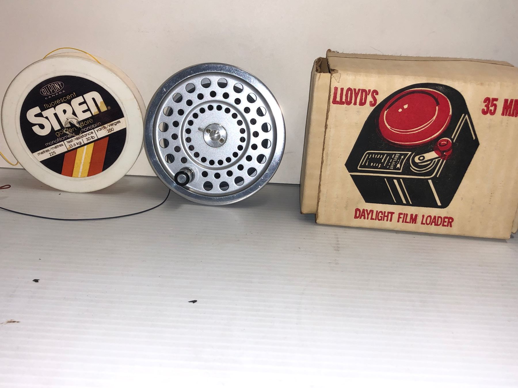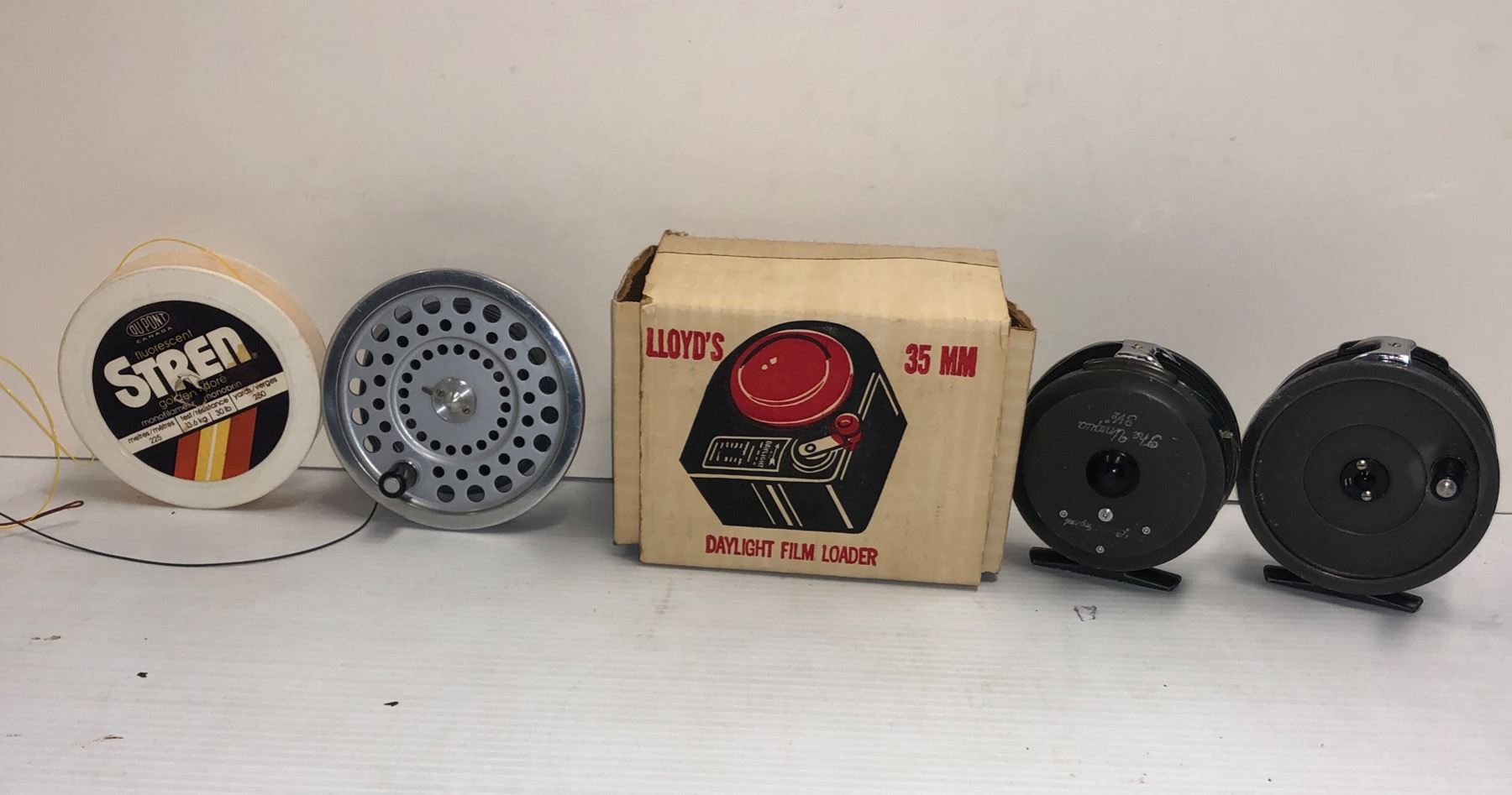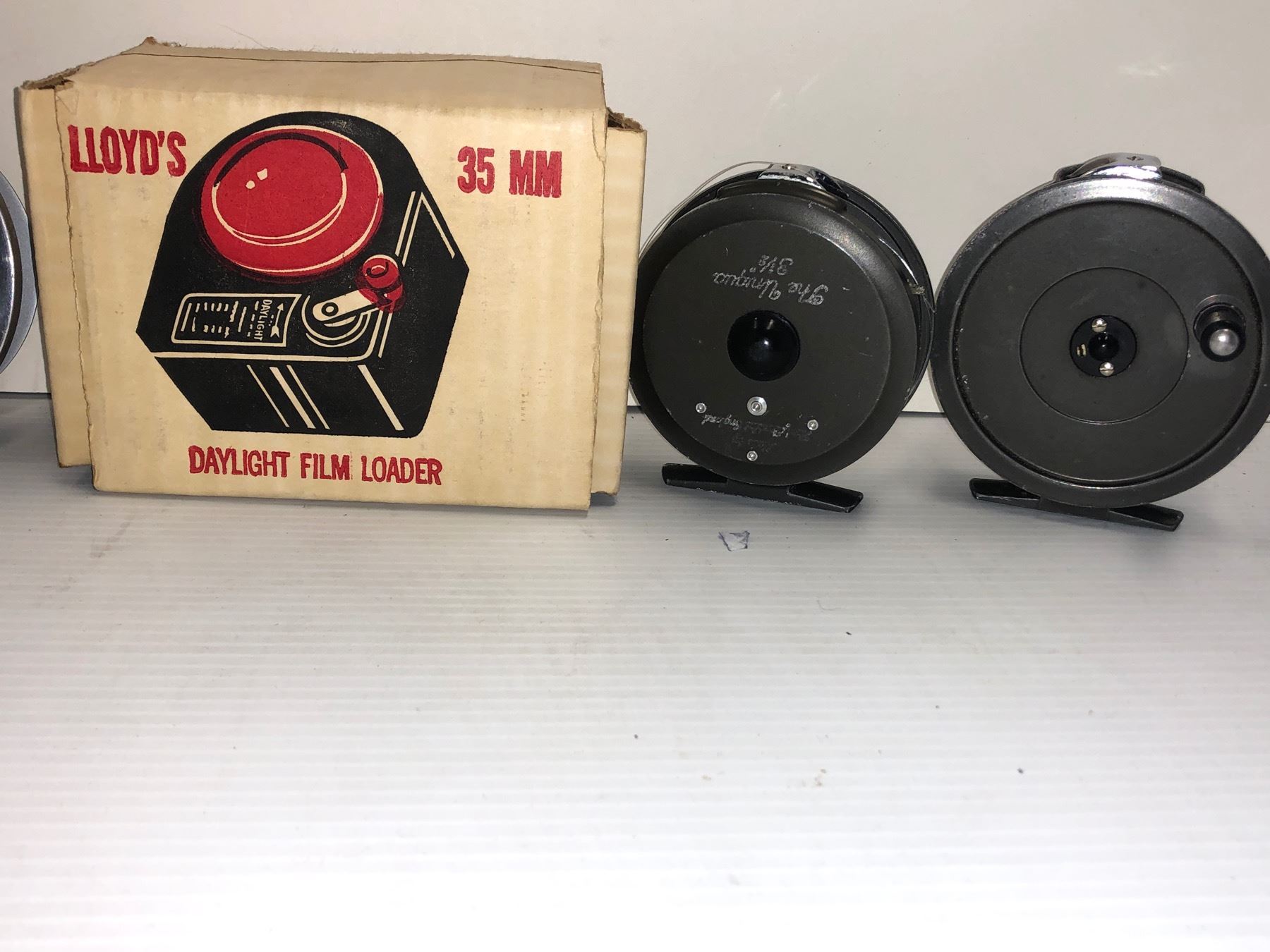 Group of 5 vintage fishing reels - includes 1 Lloyd's Daylight Film Loader in his original box, 1 Hardy The Unique 3 1/2, etc.