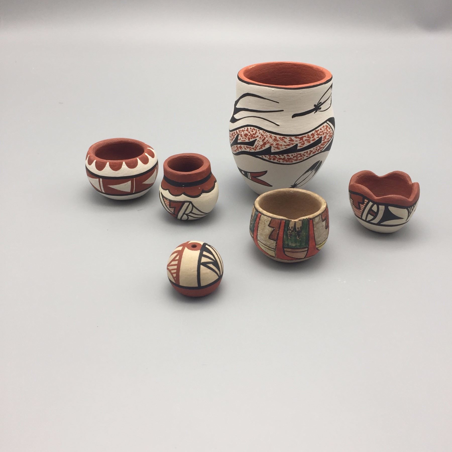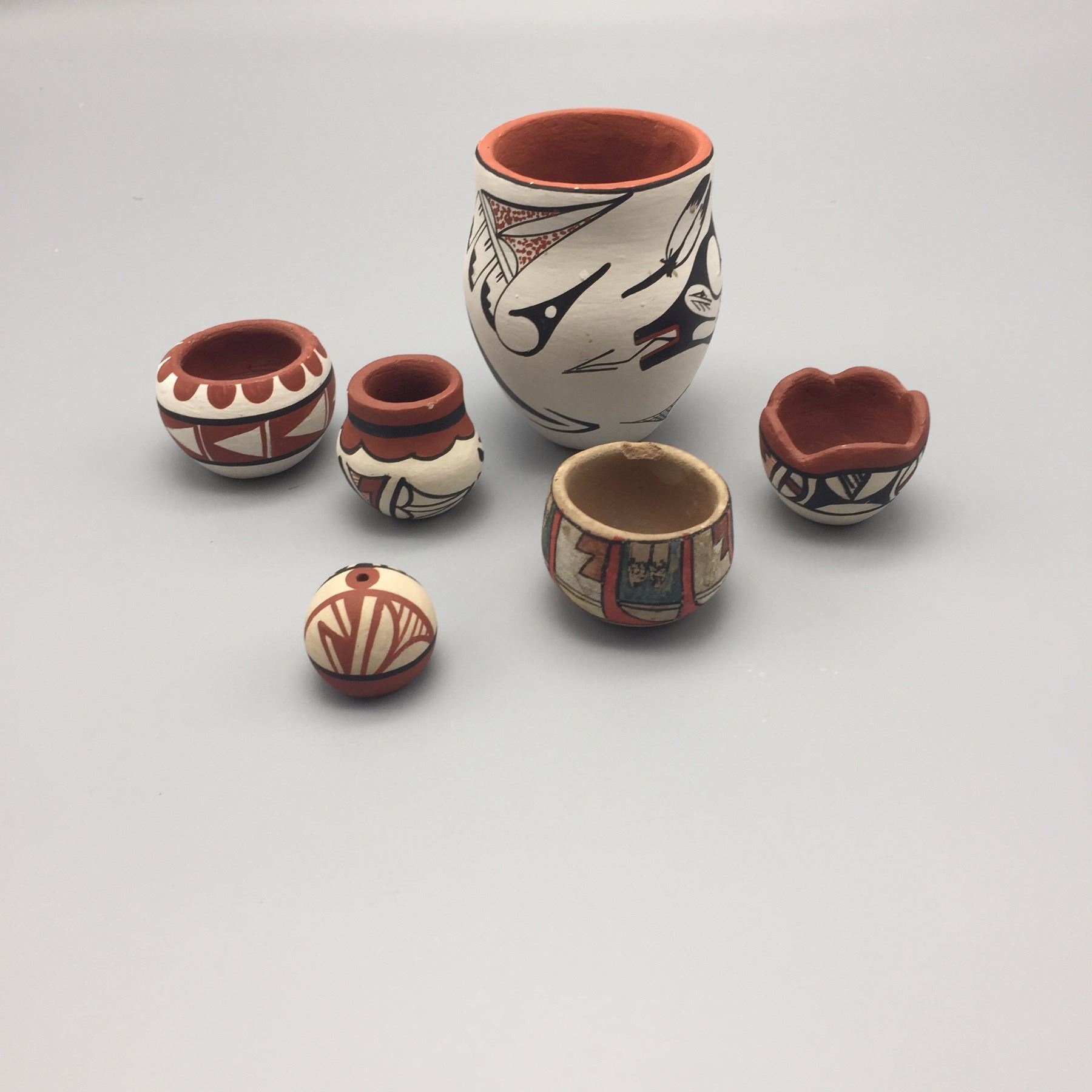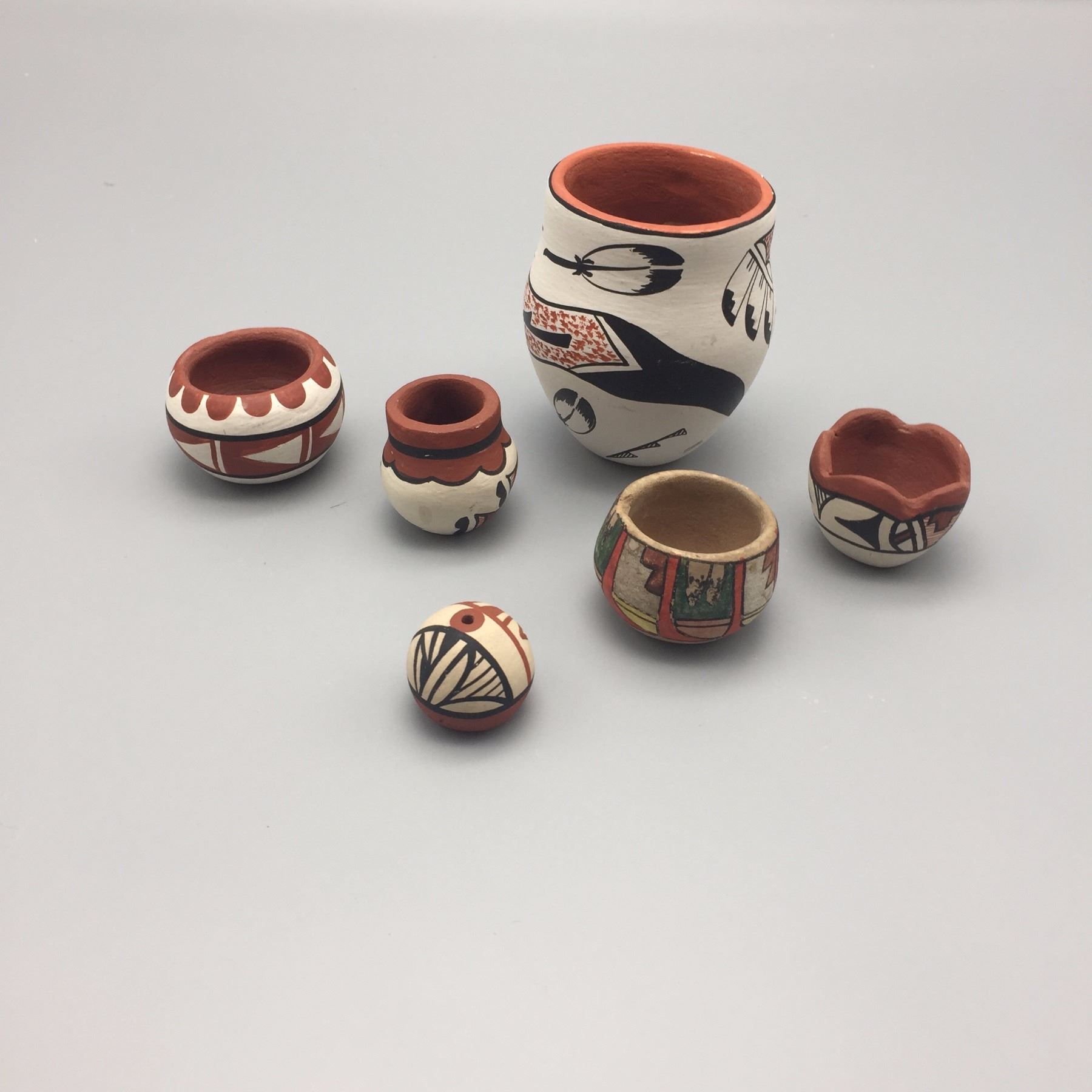 Maker: Unknown Jemez potter(s). Approx. Age: Fairly modern. Size: Pots range from 1 1/4” w to 2 1/2” w and 1” t to 3 1/2” t. Additional Info: Group of 6 Jemez handmade, mini pots. Condition: Good. Please look closely at the pictures - they are an important part of our description. Shipping: There will be a $7 handling / packaging fee for shipping this lot. The actual cost of postage will be added on top of that.