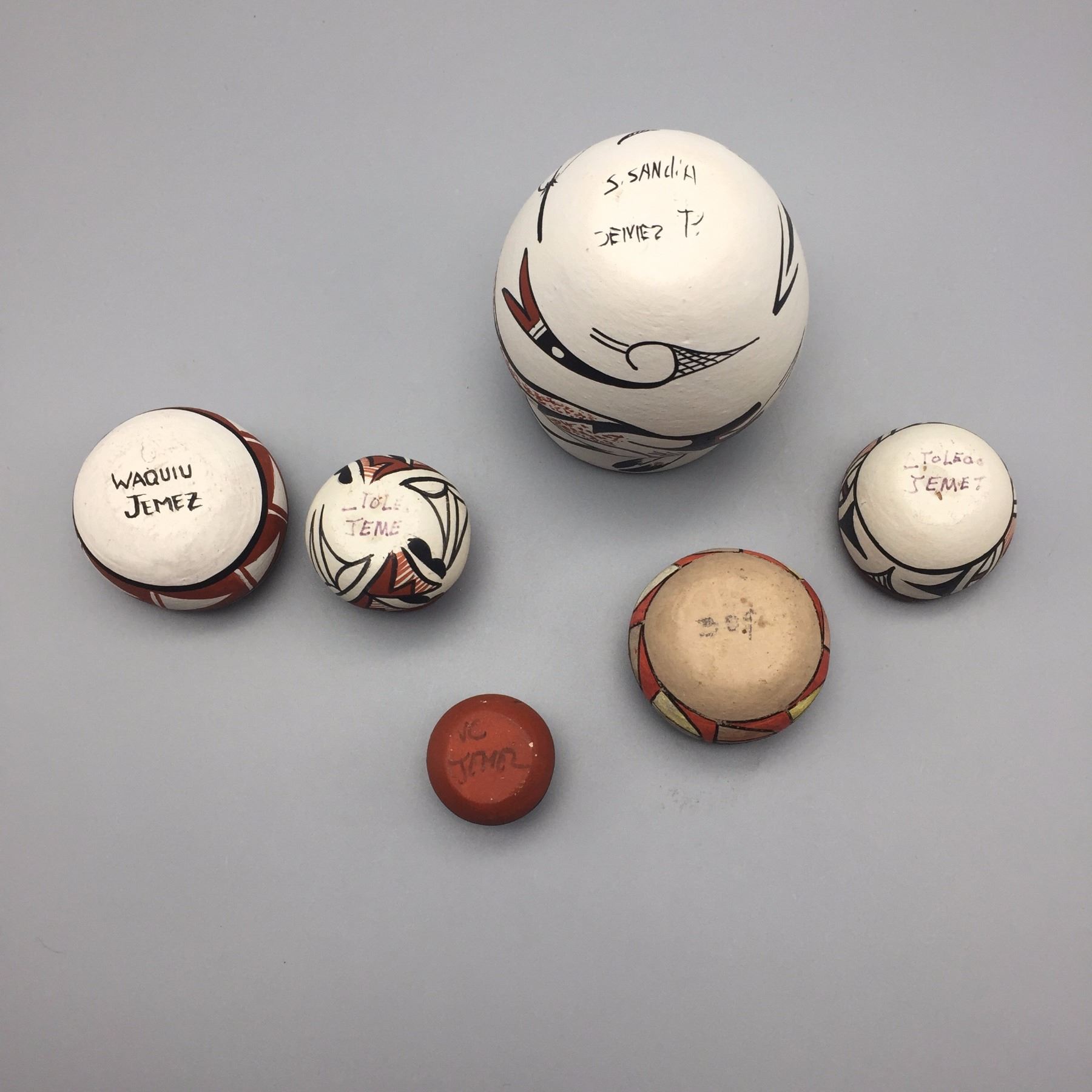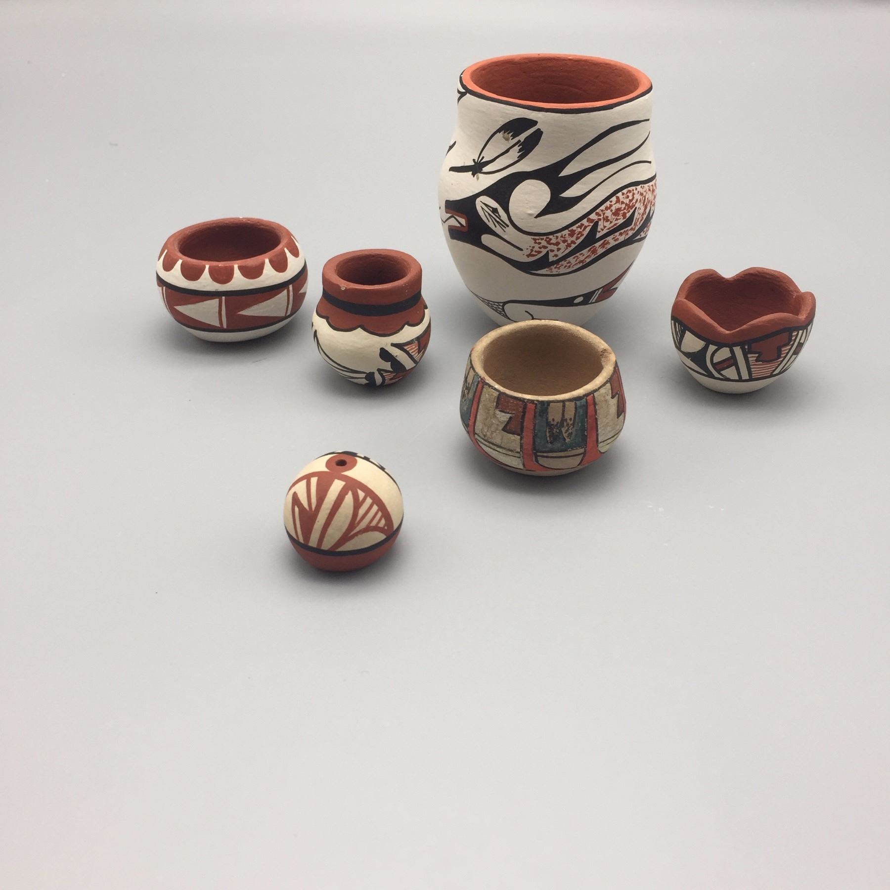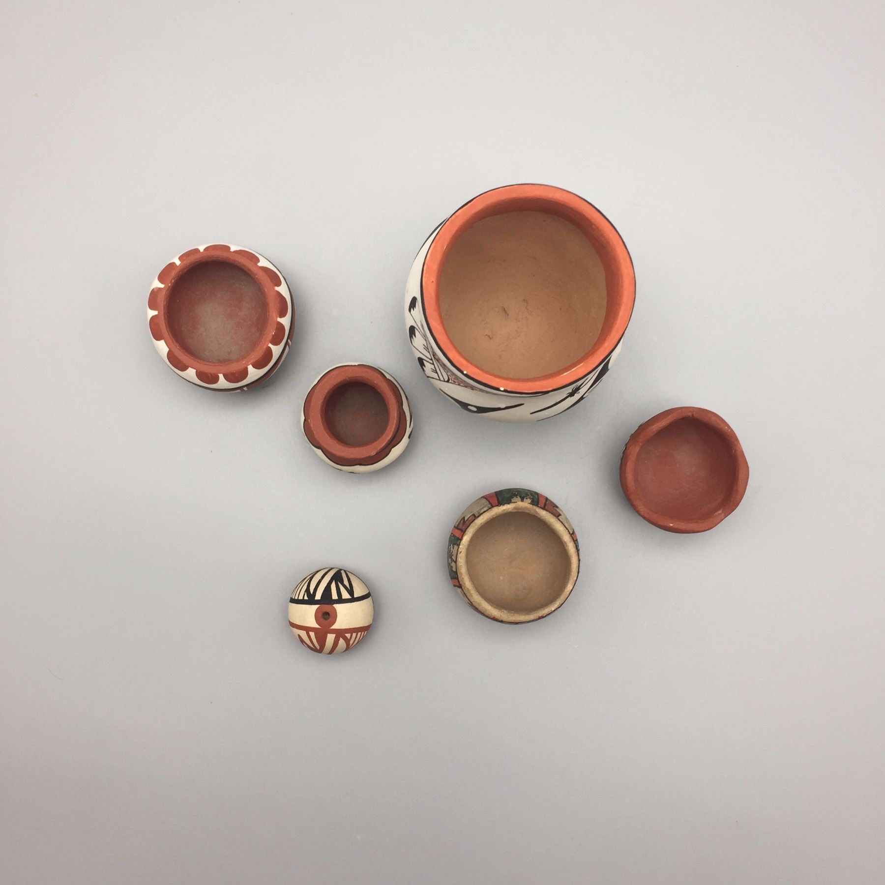 Maker: Unknown Jemez potter(s). Approx. Age: Fairly modern. Size: Pots range from 1 1/4” w to 2 1/2” w and 1” t to 3 1/2” t. Additional Info: Group of 6 Jemez handmade, mini pots. Condition: Good. Please look closely at the pictures - they are an important part of our description. Shipping: There will be a $7 handling / packaging fee for shipping this lot. The actual cost of postage will be added on top of that.