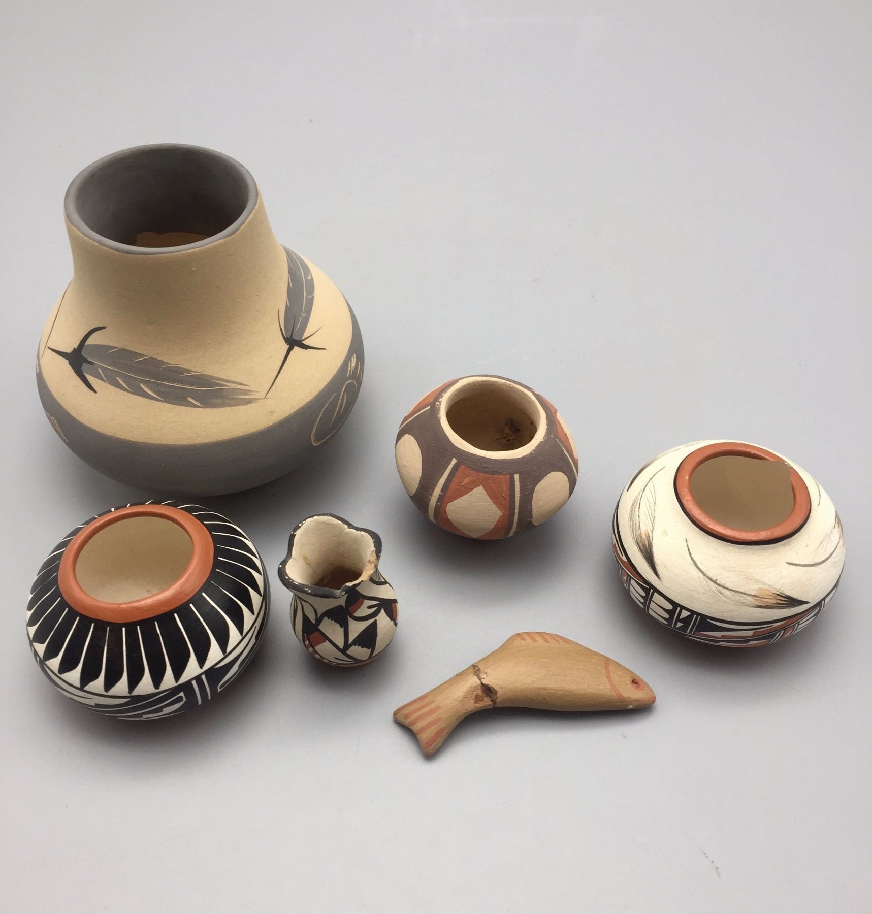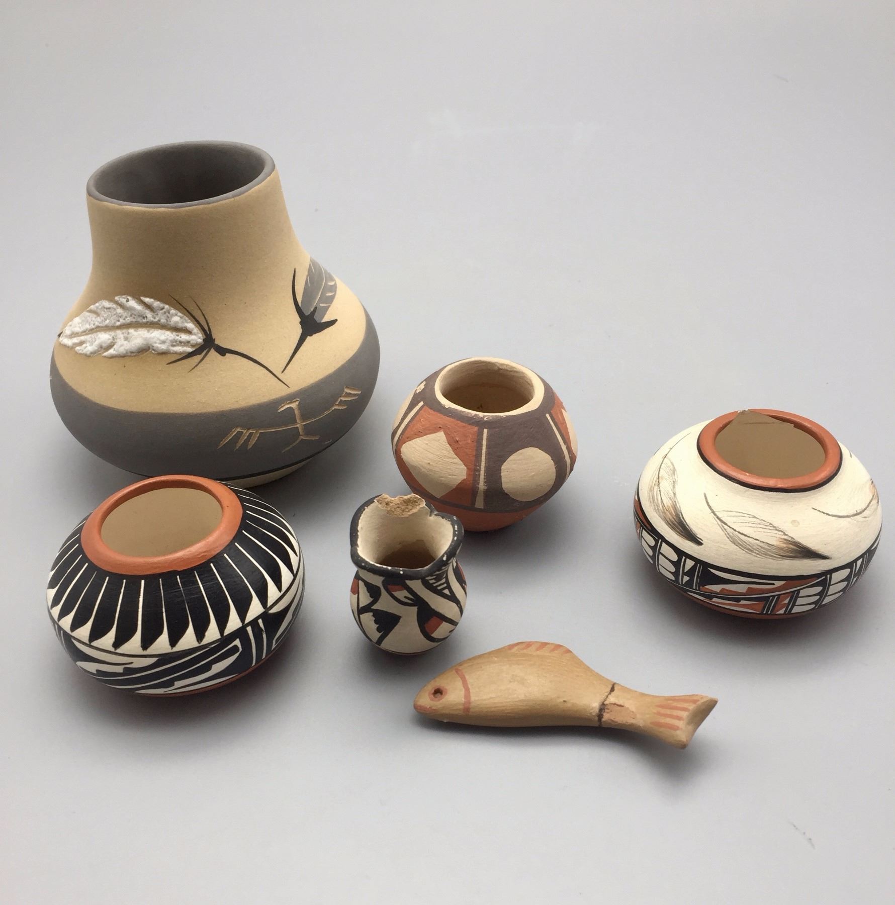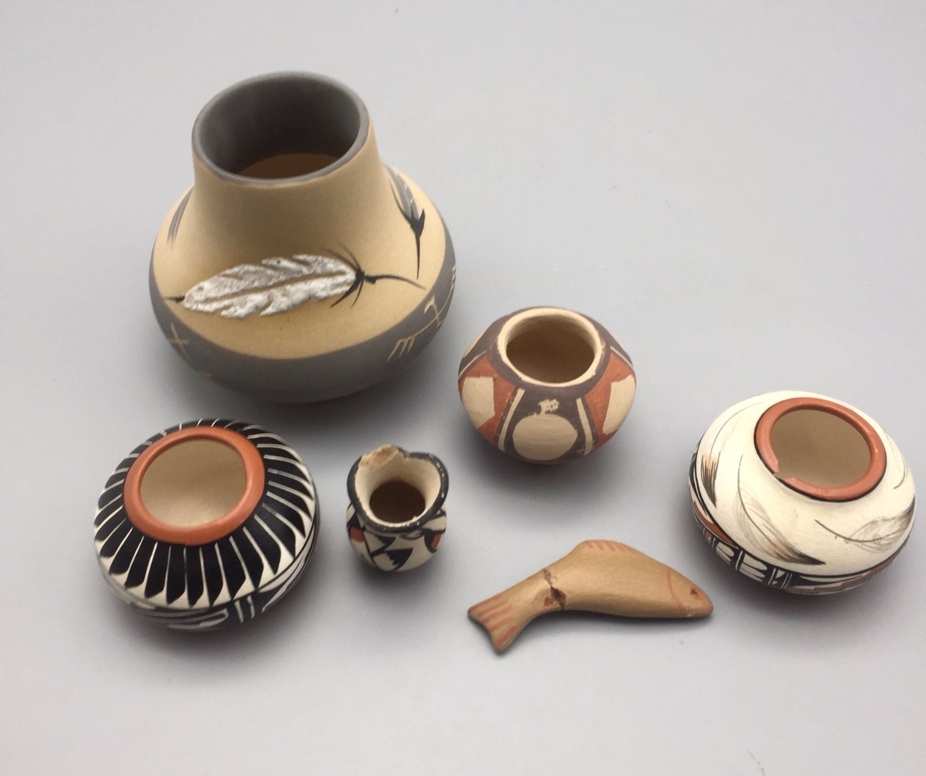 Maker: Various makers. Approx. Age: Vintage to fairly modern. Size: Pots measure 1” to 3 1/2” w x 1 1/4” to 3 1/2” h. Effigy measures 2 1/2” Additional Info: Group of 6 miniature pots. Condition: Pretty good for their age, normal wear expected and a repair on the fish and a chip on the rim of the little Jemez vase. Please look closely at the pictures - they are an important part of our description. Shipping: There will be a $7 handling / packaging fee for shipping this lot. The actual cost of postage will be added on top of that.