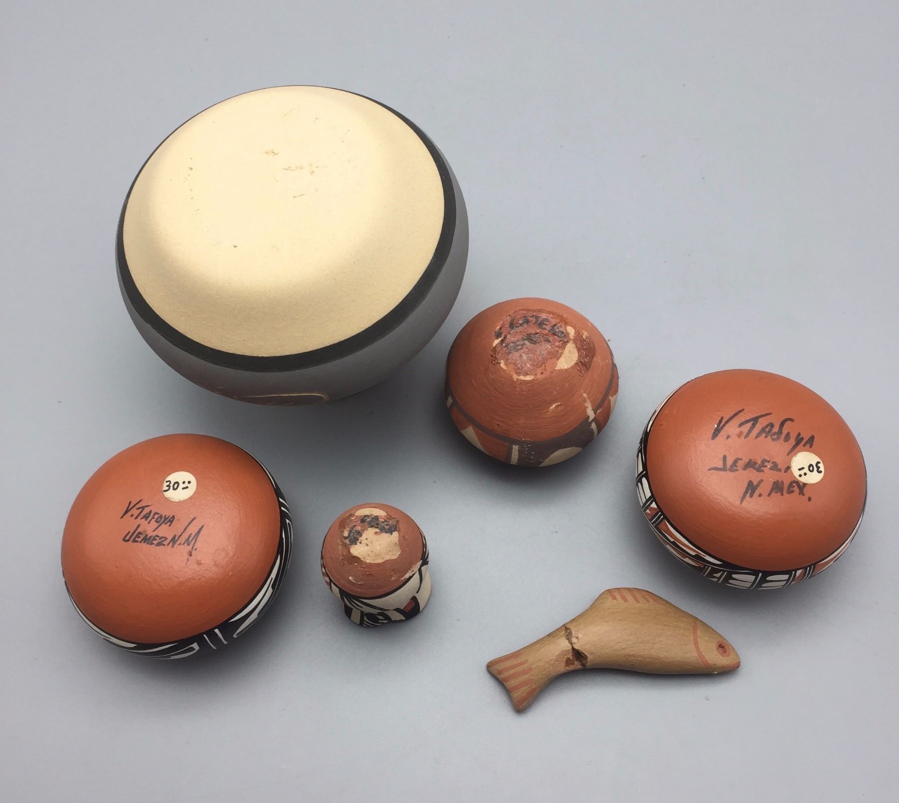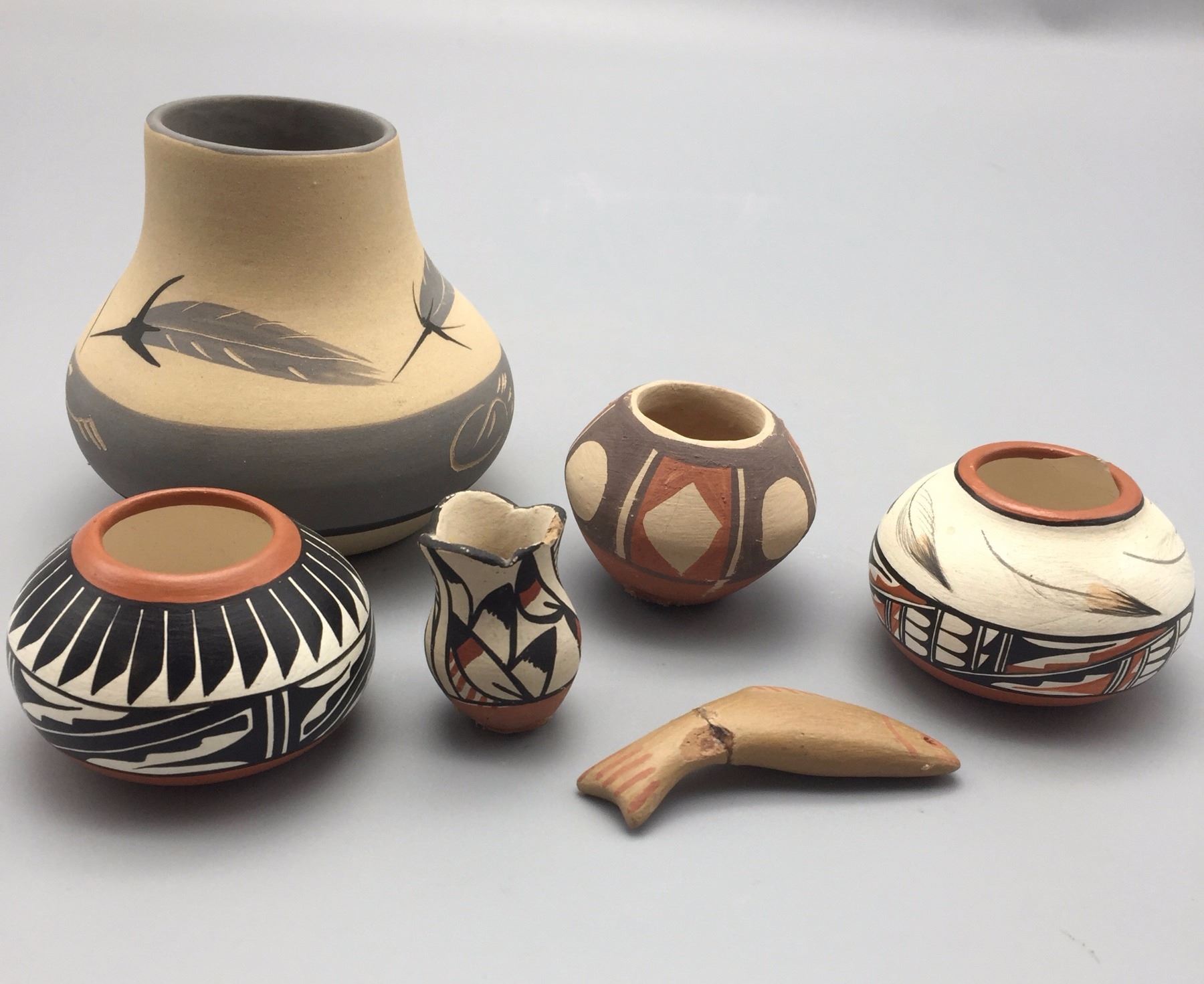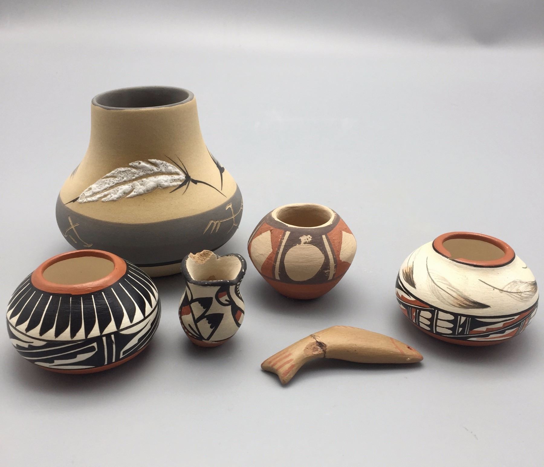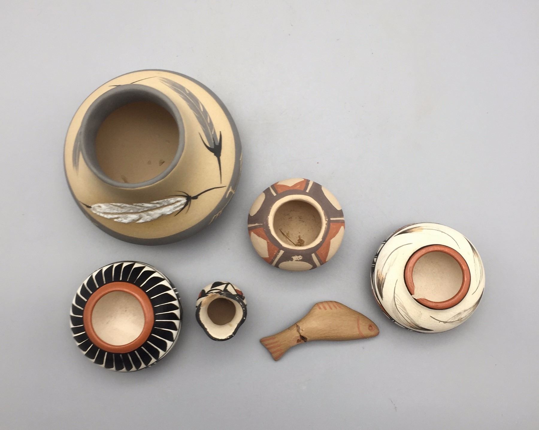 Maker: Various makers. Approx. Age: Vintage to fairly modern. Size: Pots measure 1” to 3 1/2” w x 1 1/4” to 3 1/2” h. Effigy measures 2 1/2” Additional Info: Group of 6 miniature pots. Condition: Pretty good for their age, normal wear expected and a repair on the fish and a chip on the rim of the little Jemez vase. Please look closely at the pictures - they are an important part of our description. Shipping: There will be a $7 handling / packaging fee for shipping this lot. The actual cost of postage will be added on top of that.