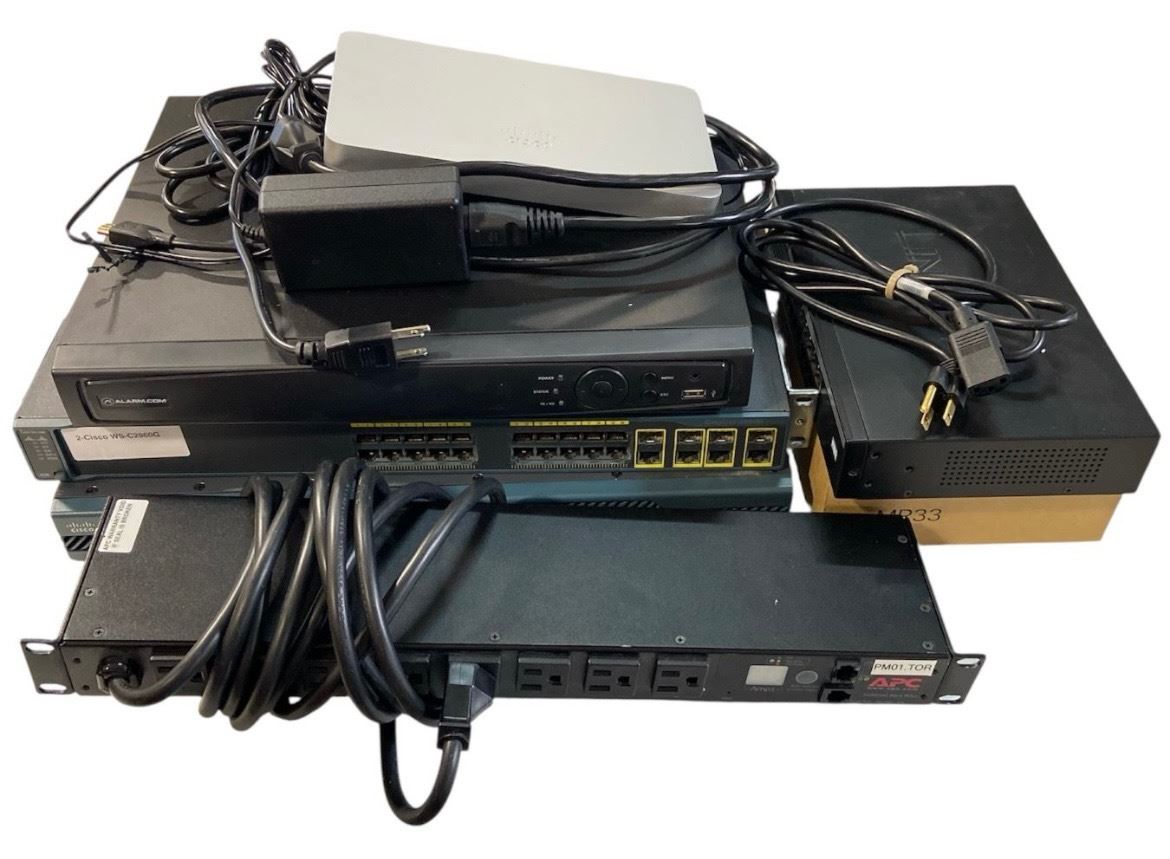 Group of 6 Network Equipment: Video Recorder, Cisco Switches, Meraki MX67, and APC PDU