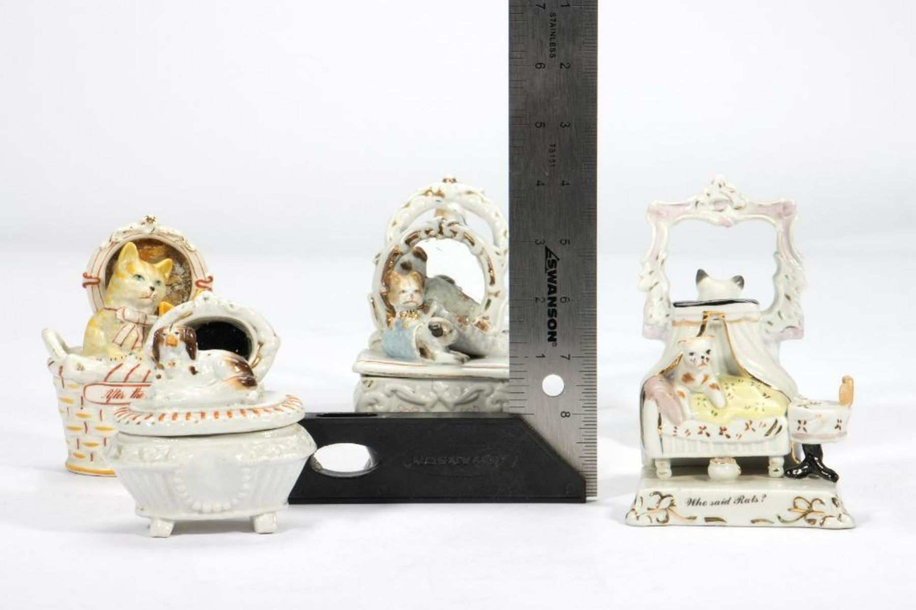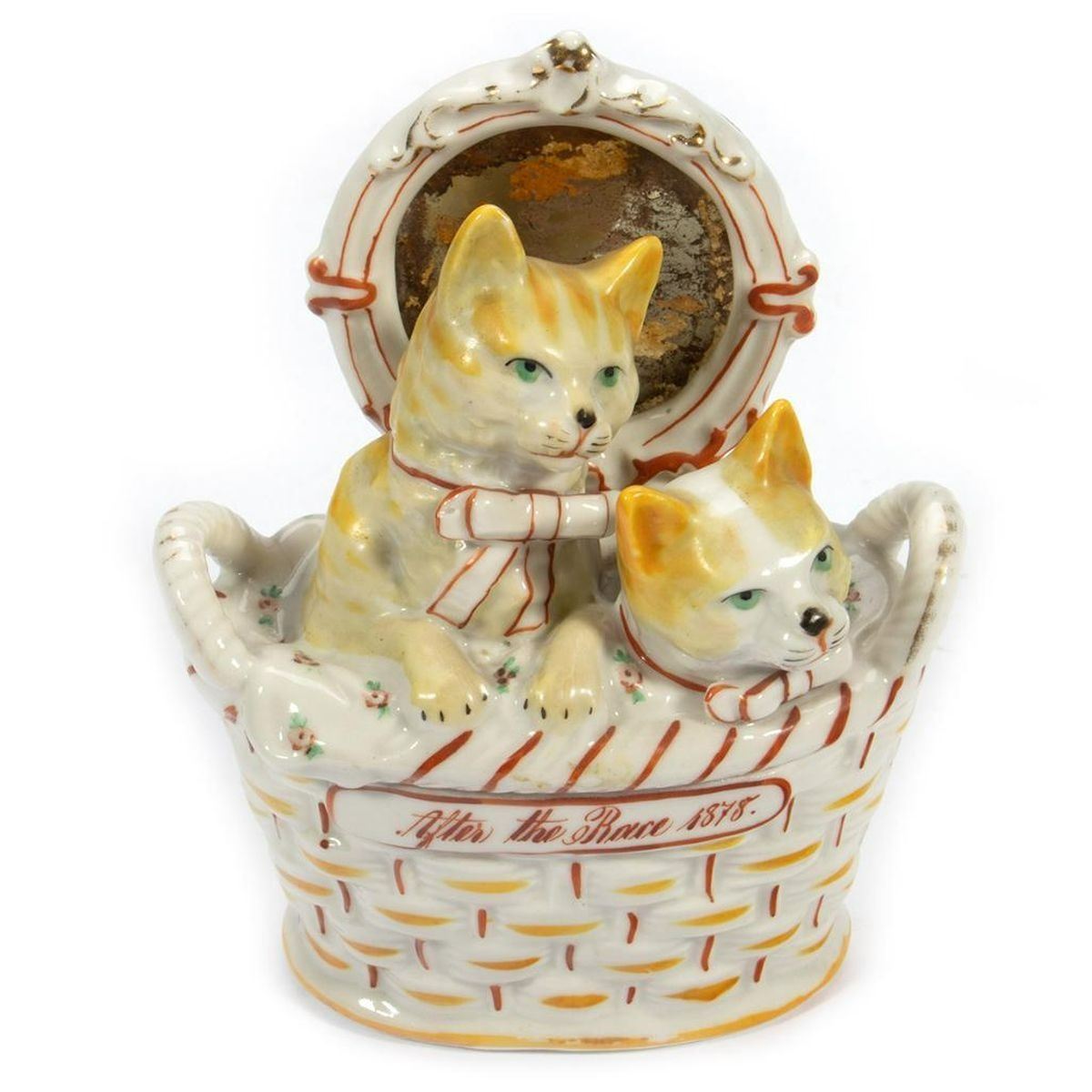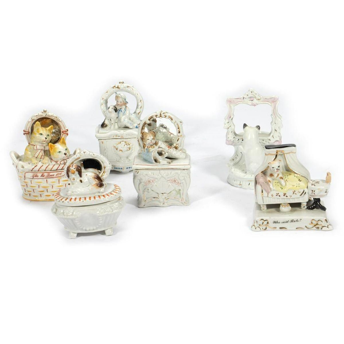 Comprised of a vanity/basket with two cats that reads: "After the Races 1878"; two swaddled dogs on a vanity; a single dog vanity; a boy and dog vanity; a pig vase; and a cat in bed figure that reads: "Who said Rats?". All unmarked or numbers only. Ranging in height from 3 3/4in. to 5 1/2in. Condition: Overall good; one vanity and the pig vase without mirrors; wear to gilt and color.
