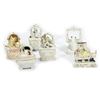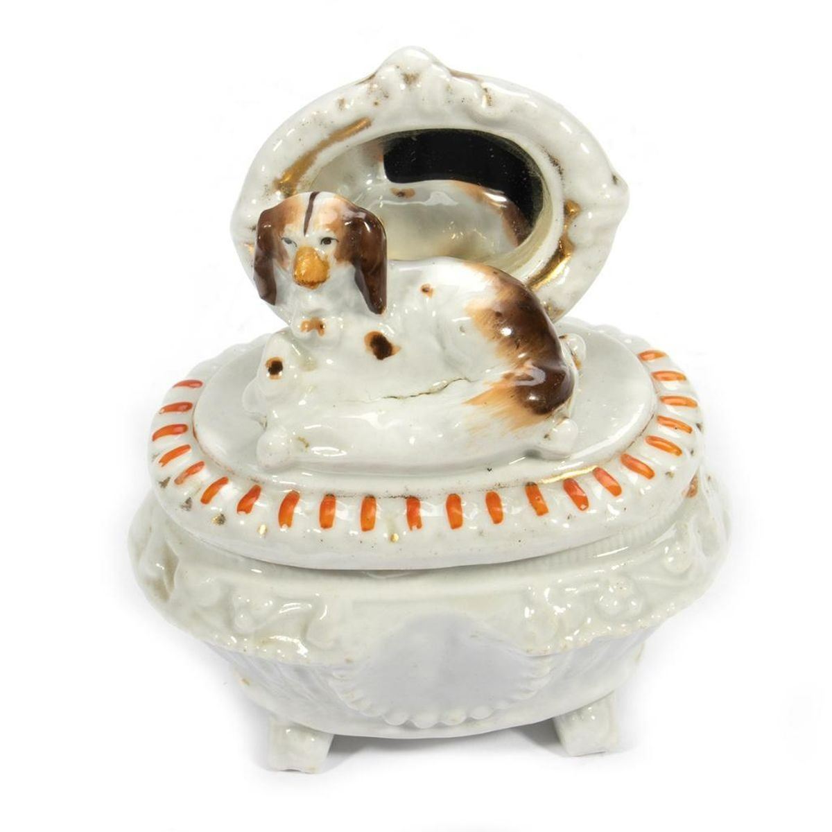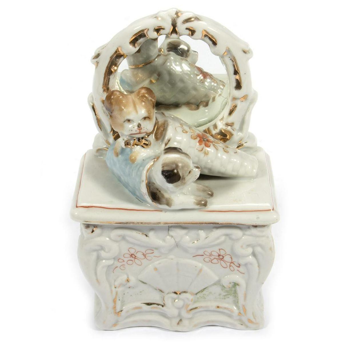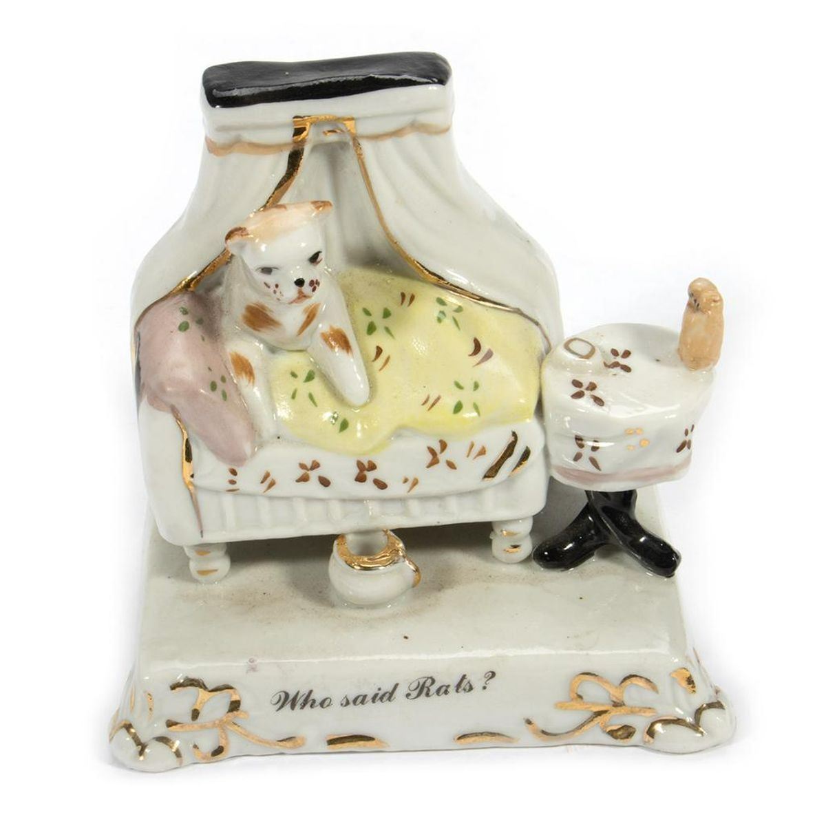 Comprised of a vanity/basket with two cats that reads: "After the Races 1878"; two swaddled dogs on a vanity; a single dog vanity; a boy and dog vanity; a pig vase; and a cat in bed figure that reads: "Who said Rats?". All unmarked or numbers only. Ranging in height from 3 3/4in. to 5 1/2in. Condition: Overall good; one vanity and the pig vase without mirrors; wear to gilt and color.