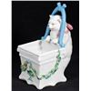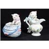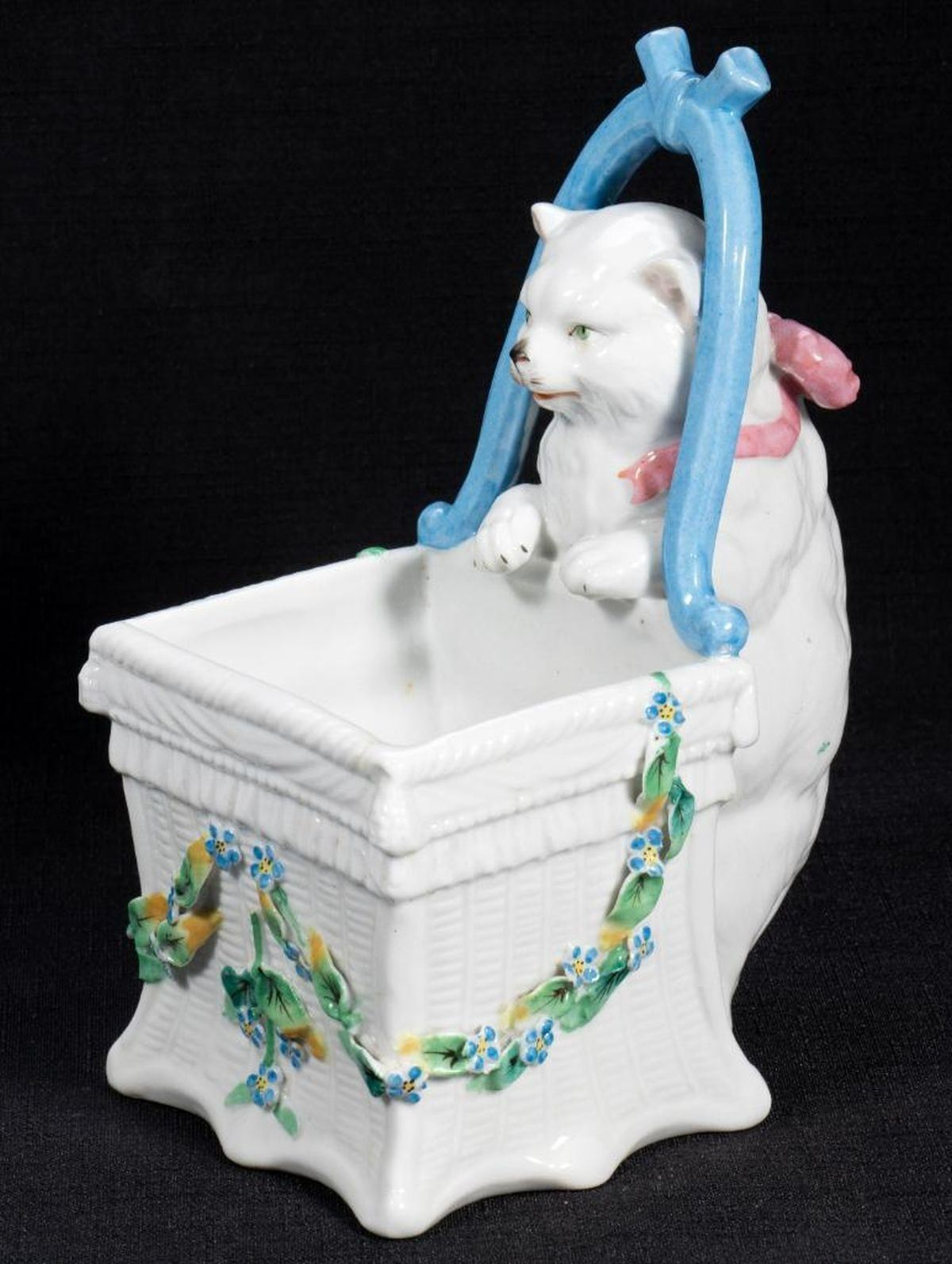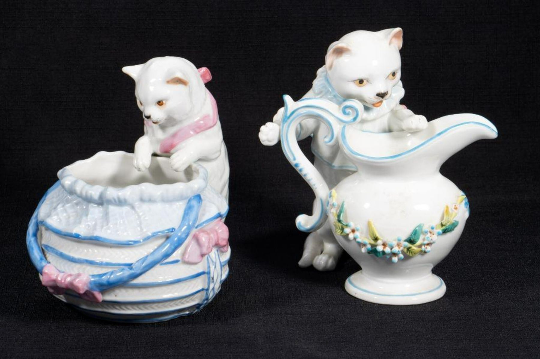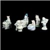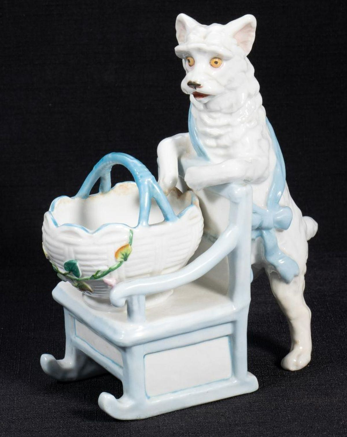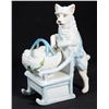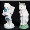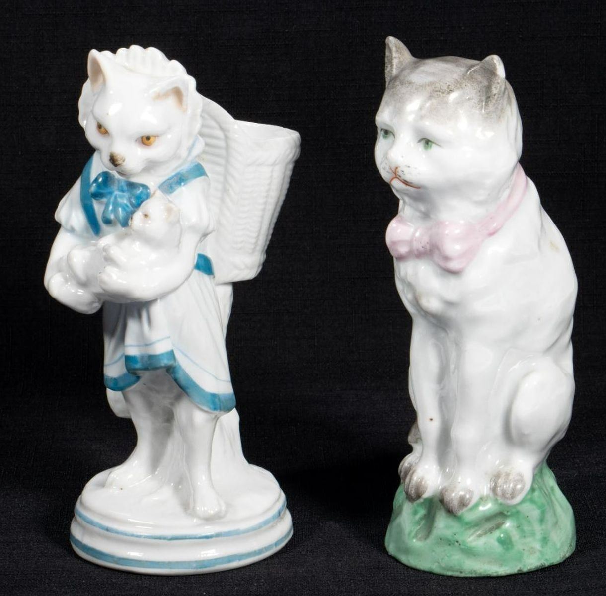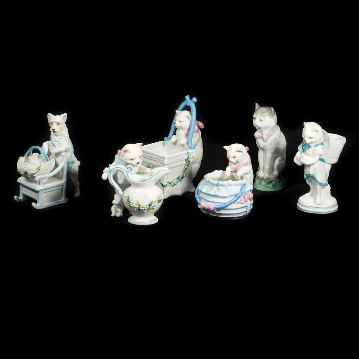 Comprising five cats and one figure of a dog with chair and basket. One unmarked, the rest with number marks. Ranging from 4 1/2in. to 6 1/2in. tall. Condition: Two cats with small chips to ears.