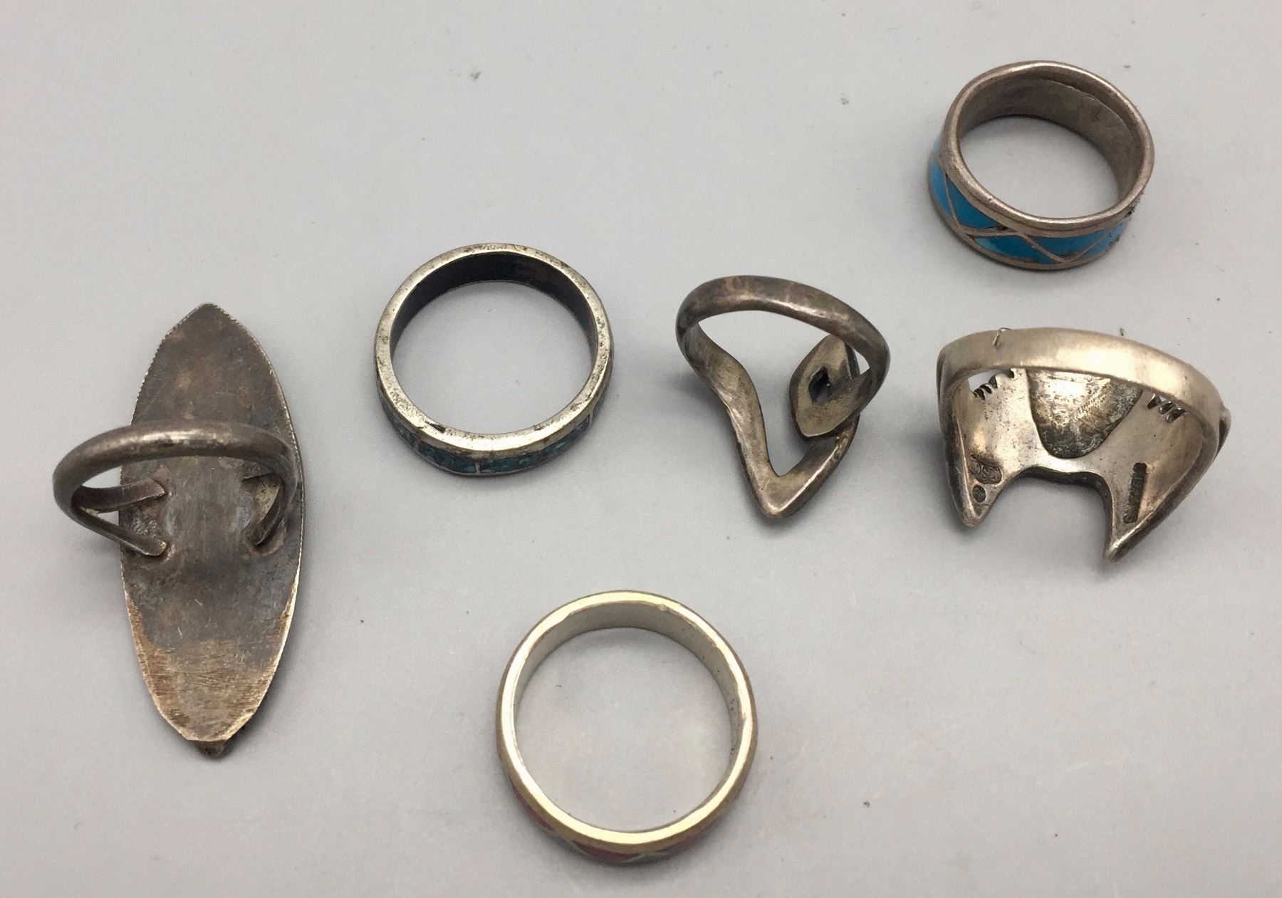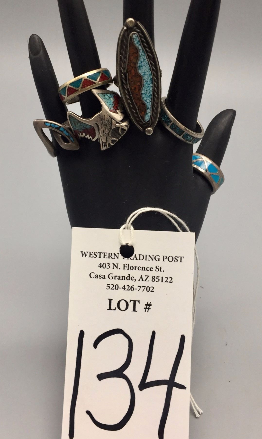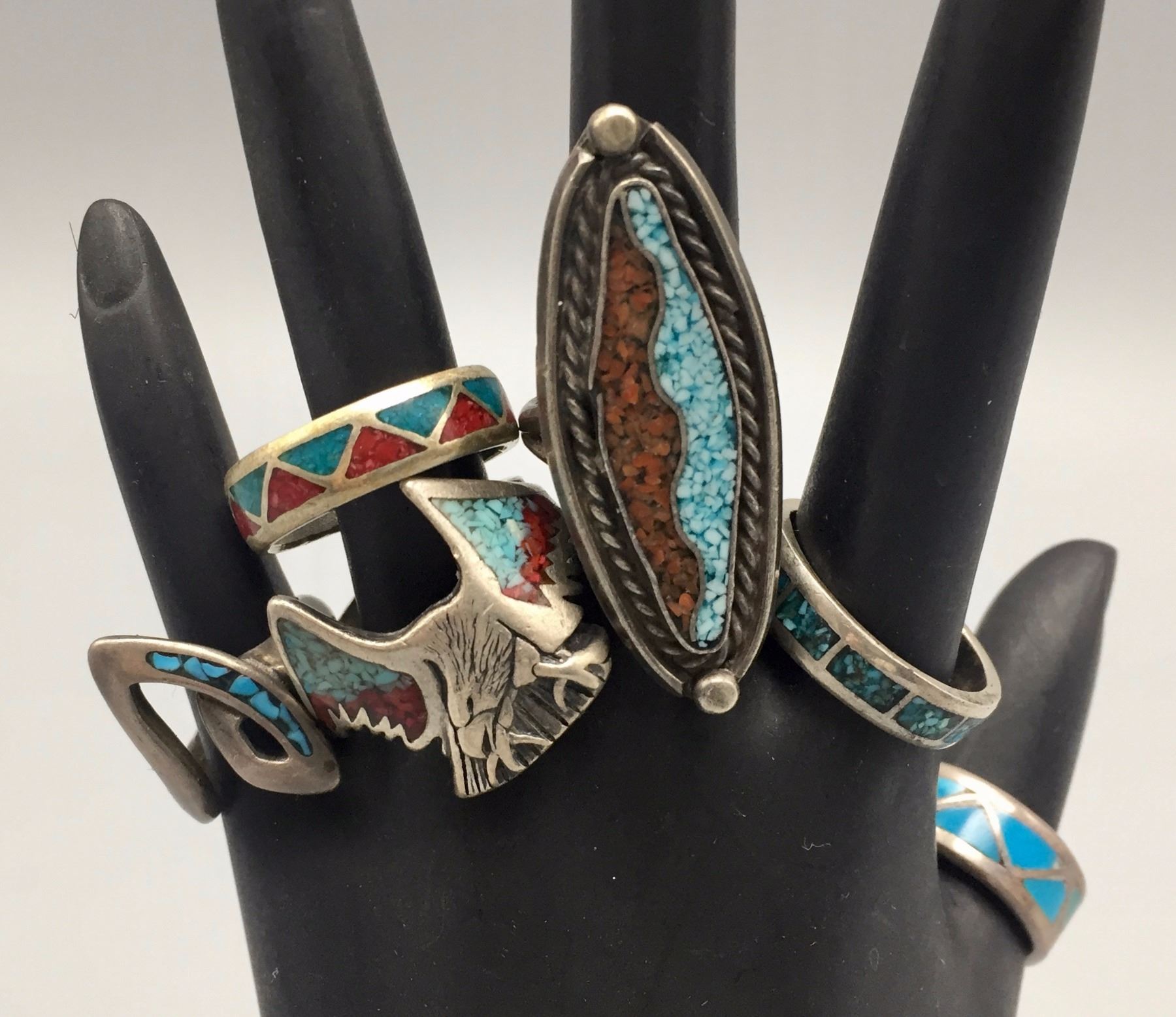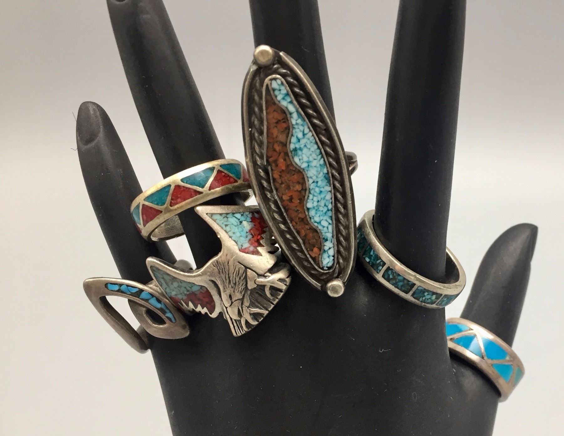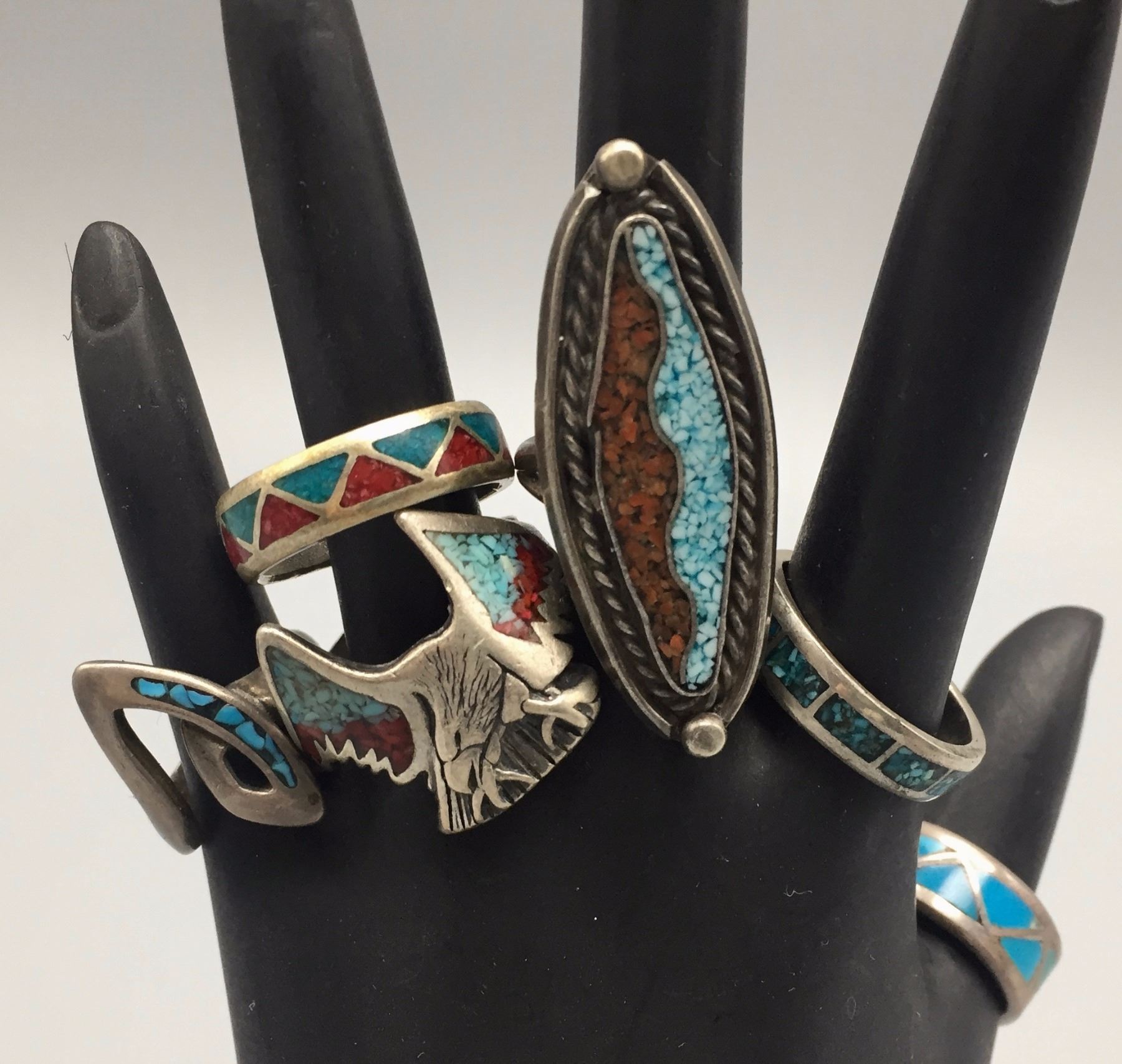 Maker: Various, appear to be Navajo in style. Approx. Age: Circa 1960s - 70s. Size: Various. Weigh 41.2g. Condition: Good for their ages, normal wear expected. Additional Info: 6 vintage inlay rings included, all appear to be set in sterling. Please look closely at the pictures - they are an important part of our description. Shipping: There will be a $5 handling / packaging fee for shipping this lot. The actual cost of postage will be added on top of that.