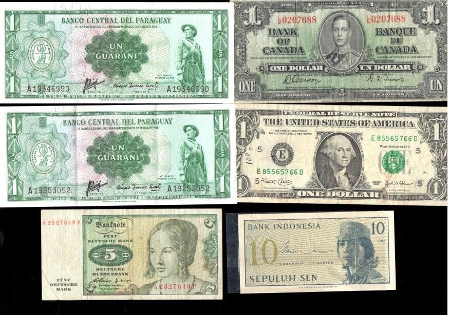 Lot 168; Group of 6 World Paper Money Currency Includes (1) 1937 Canada $1 Gordon-Towers L/M0207688, (1) 2003 $1 United States of America Federal Reserve Note E85565766D, (1) 1960 5 Deutsche Mark A2327649P, (2) 1952 Banco Central Del Paraguay Un Guarani, Condition of Note as Pictured
