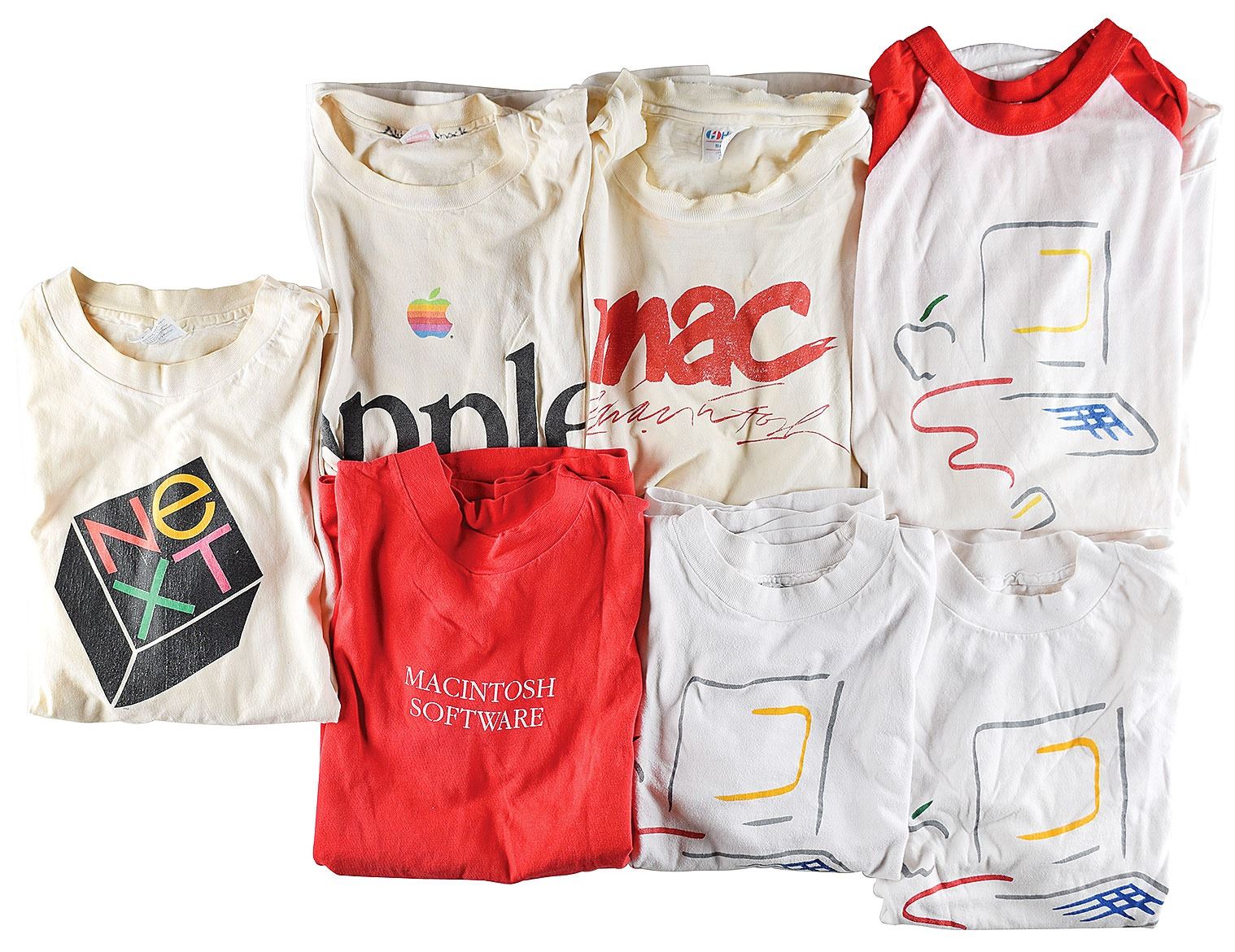 Collection of seven Apple-related t-shirts, including: a staff-originated red t-shirt with "Macintosh Software" on the front and "We Are Not Authorized to Comment on Unannounced Products" on the back (size L); two white t-shirts with the Macintosh 'Picasso' logo on the front and "Macintosh" on the back (no sizes); a white-and-red baseball-style t-shirt with the Macintosh 'Picasso' logo on the front and "1984 won't be like '1984,' Macintosh" on the back (size L); a standard issue white t-shirt with a red "Mac, Macintosh" script logo (size L); a white t-shirt with the rainbow logo and "Apple" on the front (size L); and a white t-shirt with Paul Rand's NeXT Computer logo on the front and "The sign of the NeXT generation of computers… for Education" on the back (size XL). In overall good to very good condition, with light yellow staining to a few of the shirts, wear to the collar of the 'Script' shirt, and scattered small holes to the NeXT shirt.