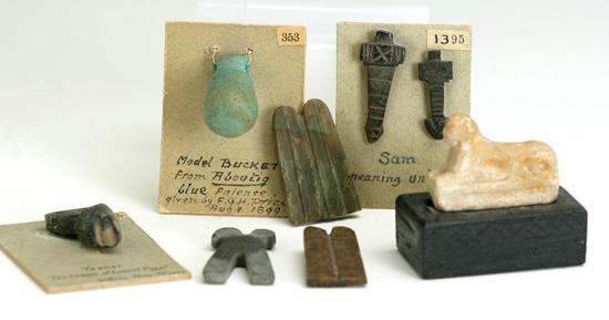 Group of 7 Egyptian Hardstone Amulets. Third Intermediate Period-Late Period, circa 1st millennium B.C. Consists of: Two double plume amulets, height: 30mm; Steatite Pesehkef amulet, height: 34 mm. Three amulets mounted on pieces of card: Blue faience model situla with pierced handles, height: 22 mm. The card inscribed with, 'Model bucket from Aboutig blue faience given by F.G.H. Price, Aug. 1, 1899, collection '353', Black stone red crown of Lower Egypt amulet, pierced, height: 25 mm., card inscribed, 'Tesher the Crown of Lower Egypt Sotheby May 28, 1883, collection '255'. Two brown stone male and female amulets, height: 29 mm (longest) the card inscribed, 'Sam meaning union 4 1924' collection no '1395'. Limestone seated sphinx on wooden stand, length: 31 mm..