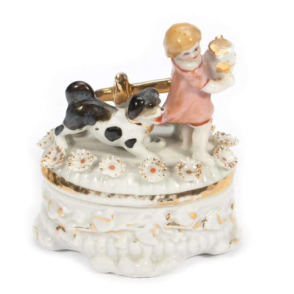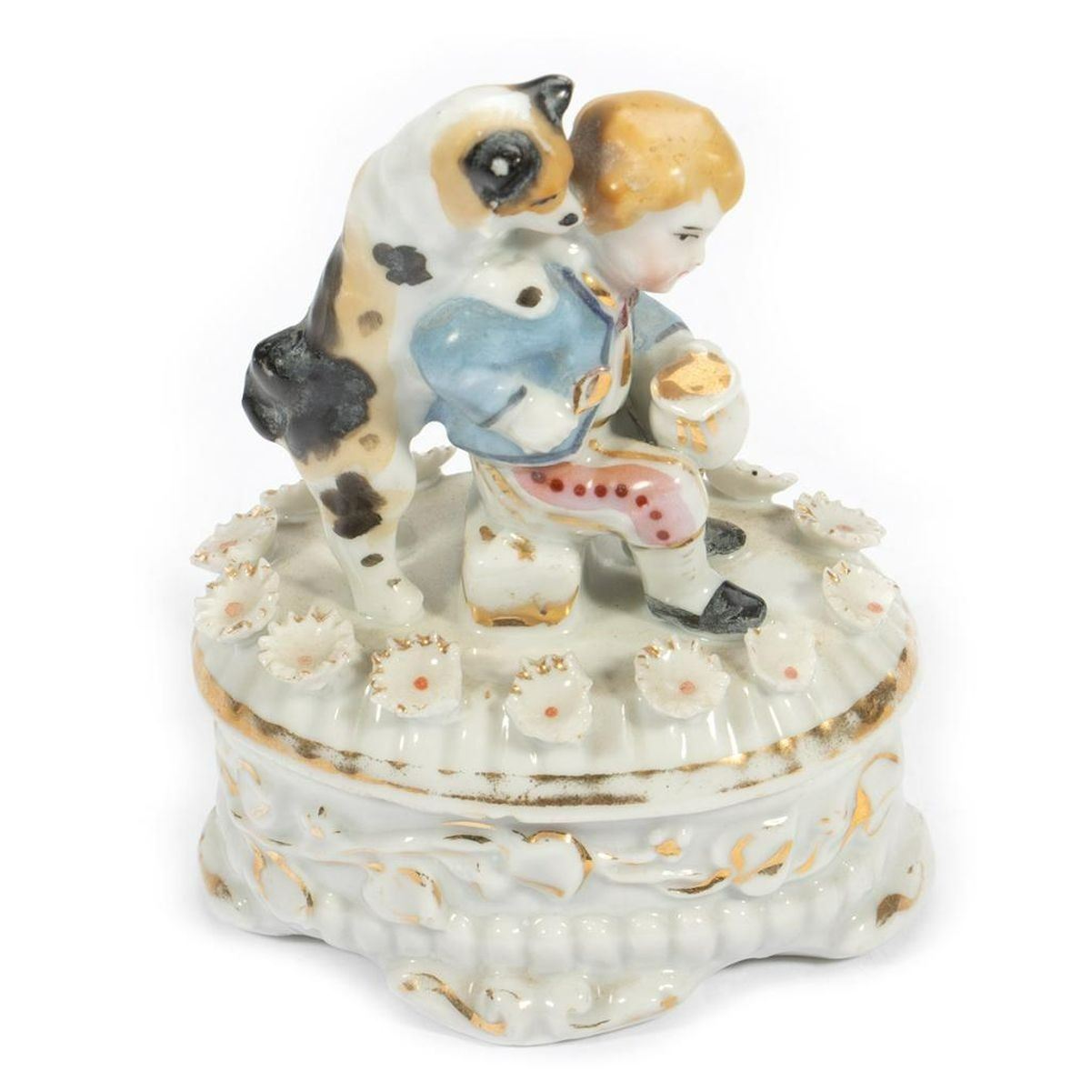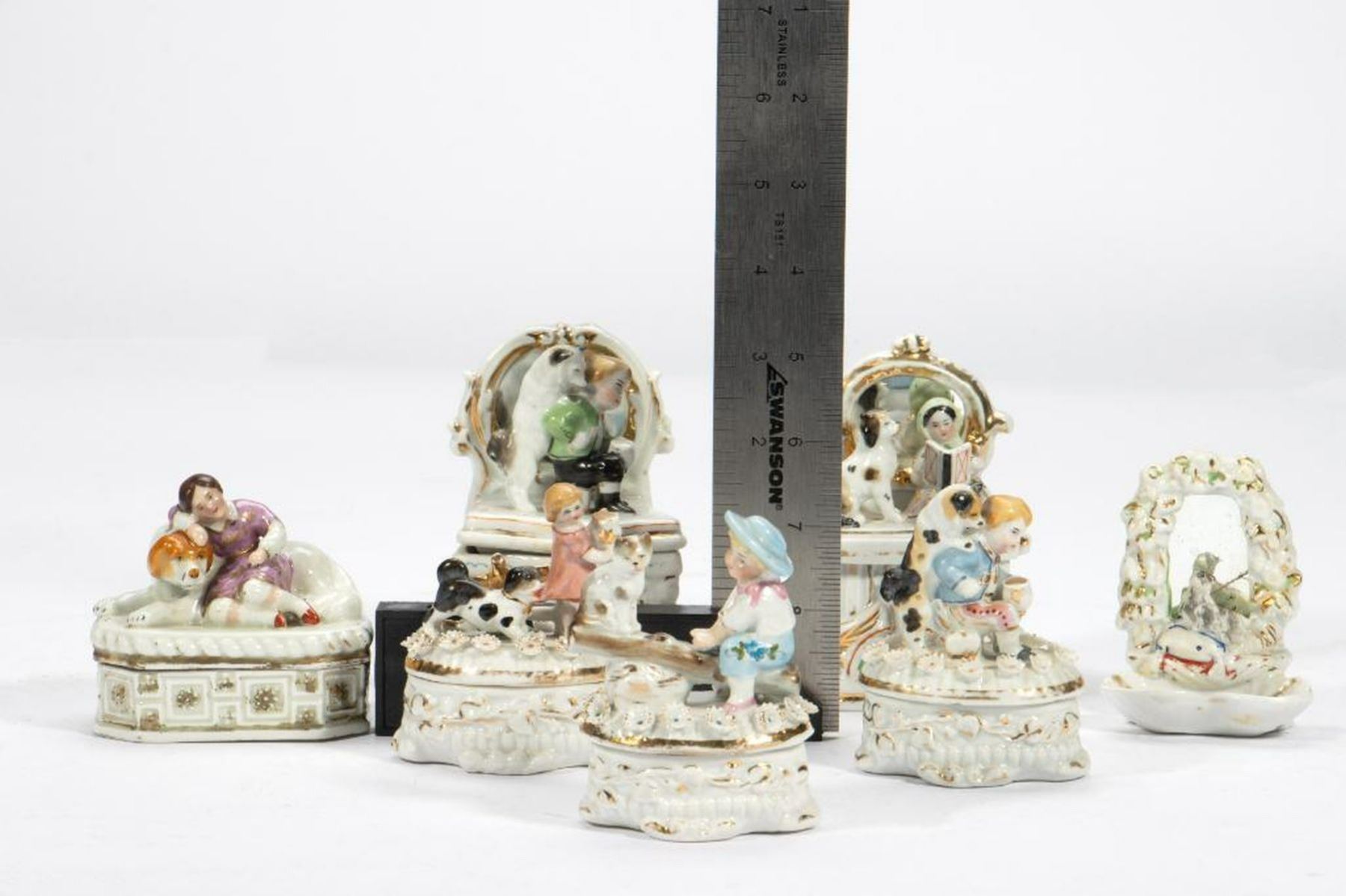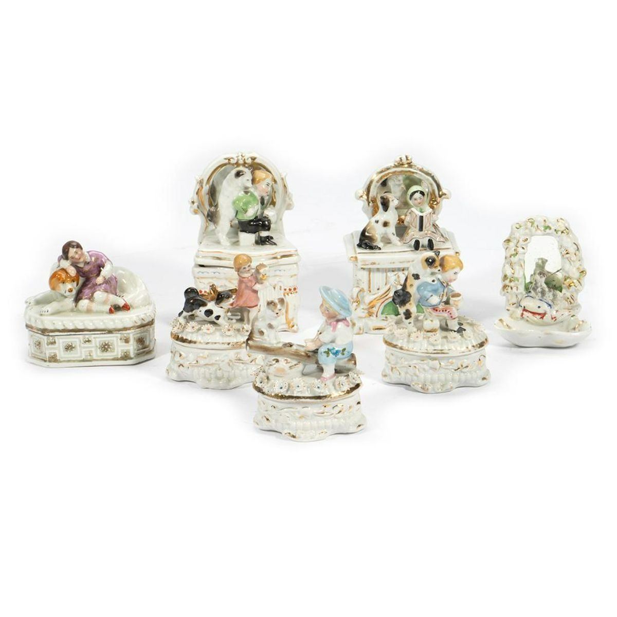 Comprised of two vanity-form and four other boxes with dogs and children, and a mirrored trinket tray with dog. All unmarked or numbers only. Ranging in height from 3 1/4 in. to 4 3/8in. Condition: Overall good; one box with a broken off figure, two with chipped/missing flowers; the tray with cracked mirror, wear to gilt.