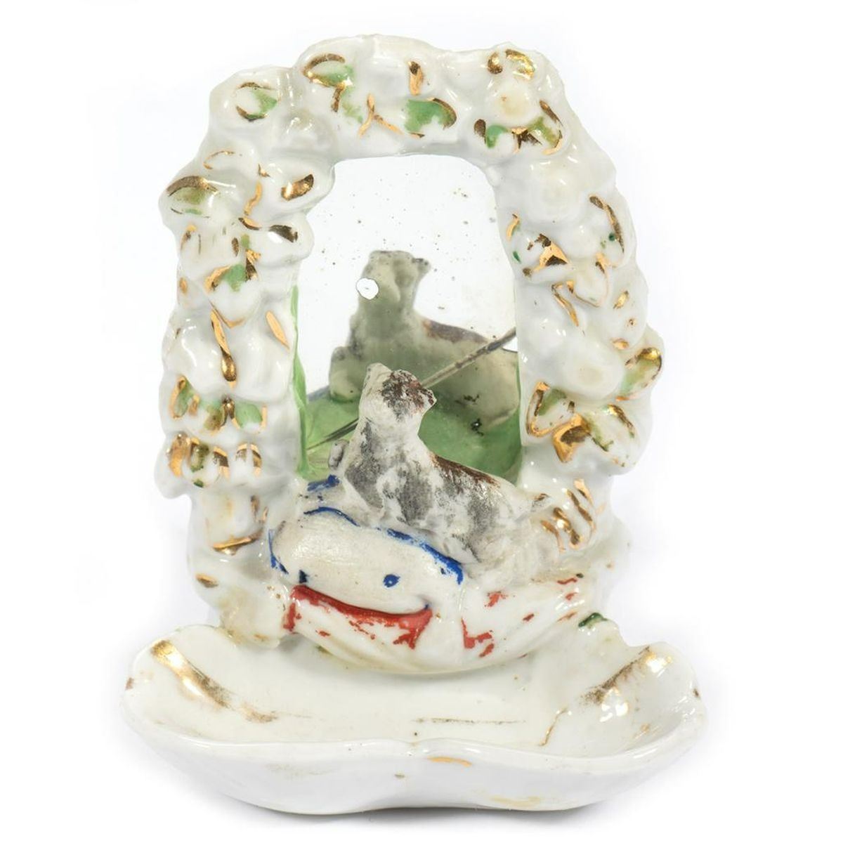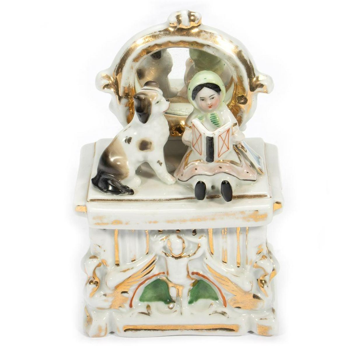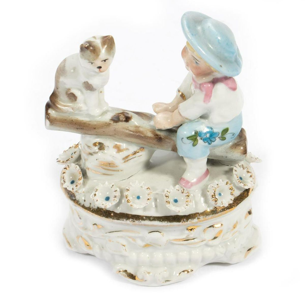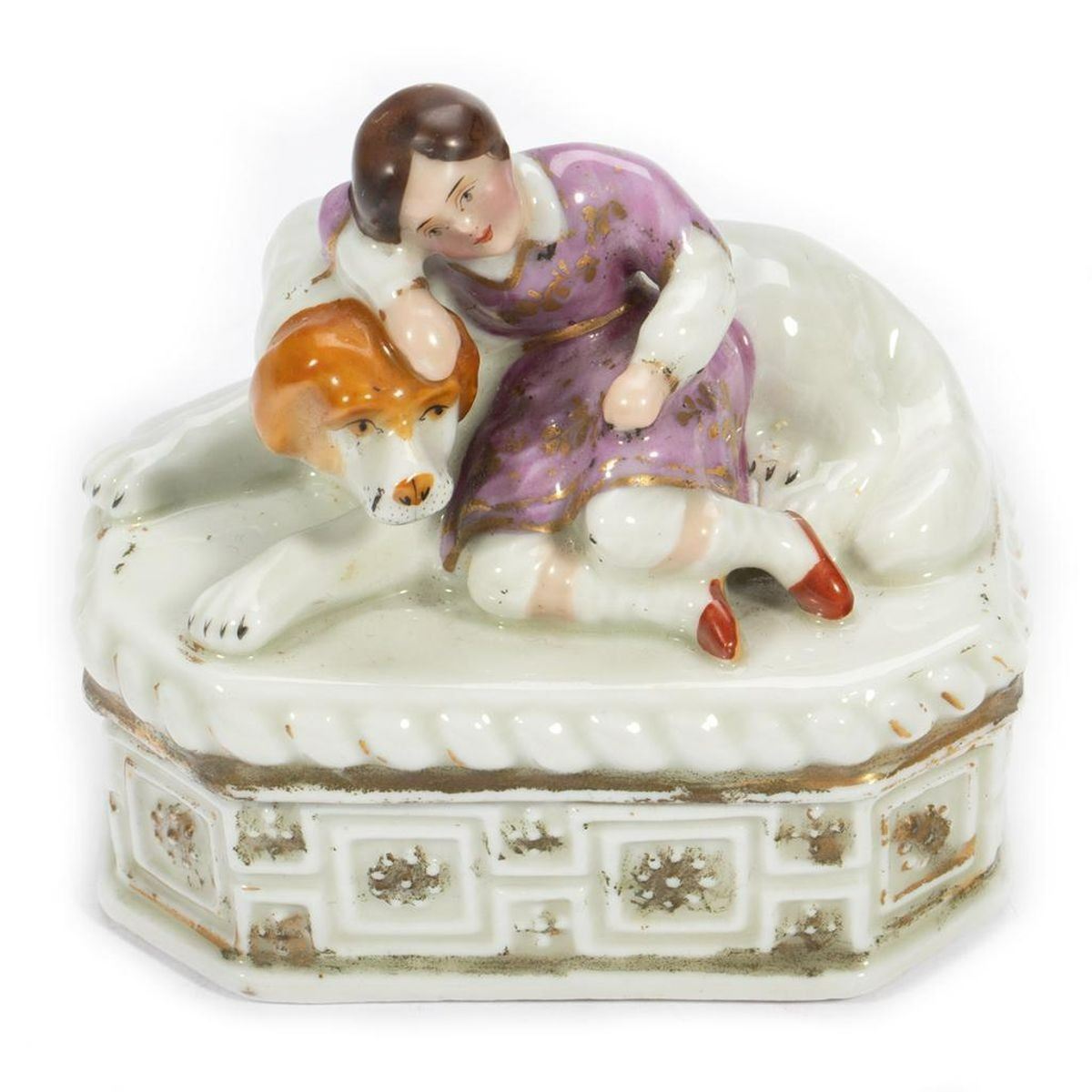 Comprised of two vanity-form and four other boxes with dogs and children, and a mirrored trinket tray with dog. All unmarked or numbers only. Ranging in height from 3 1/4 in. to 4 3/8in. Condition: Overall good; one box with a broken off figure, two with chipped/missing flowers; the tray with cracked mirror, wear to gilt.