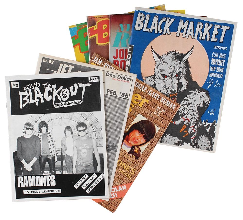 Collection of seven punk-related magazines and fanzines, each approximately 8.5 x 11, covering artists like The Ramones and Johnny Rotten, including: a 1986 copy of Black Market, issue No. 6; a 1984 copy of Beyond the Blackout, issue No. 3; a 1985 copy of Jet Lag, issue No. 52; a 1980 copy of Trouser Press, issue No. 50; a 1984 copy of NY Rocker, issue No. 56; and two copies of Bomp!, dated 1978 and 1979, issues 19 and 20. In overall fine condition. Accompanied by a letter of provenance from Chris Lamy, close friend of The Ramones and guitarist of The Jabbers, formerly GG Allin & The Jabbers.