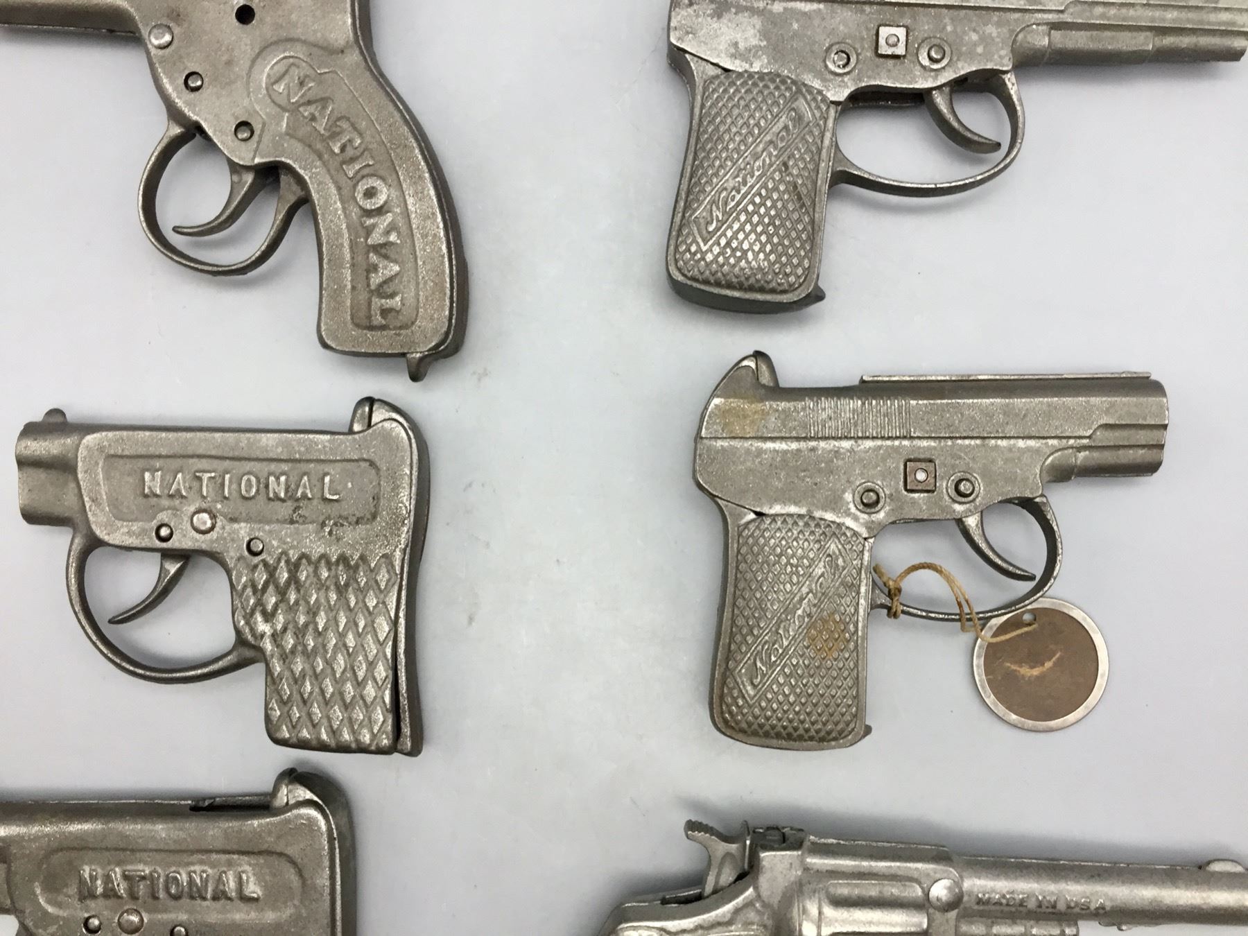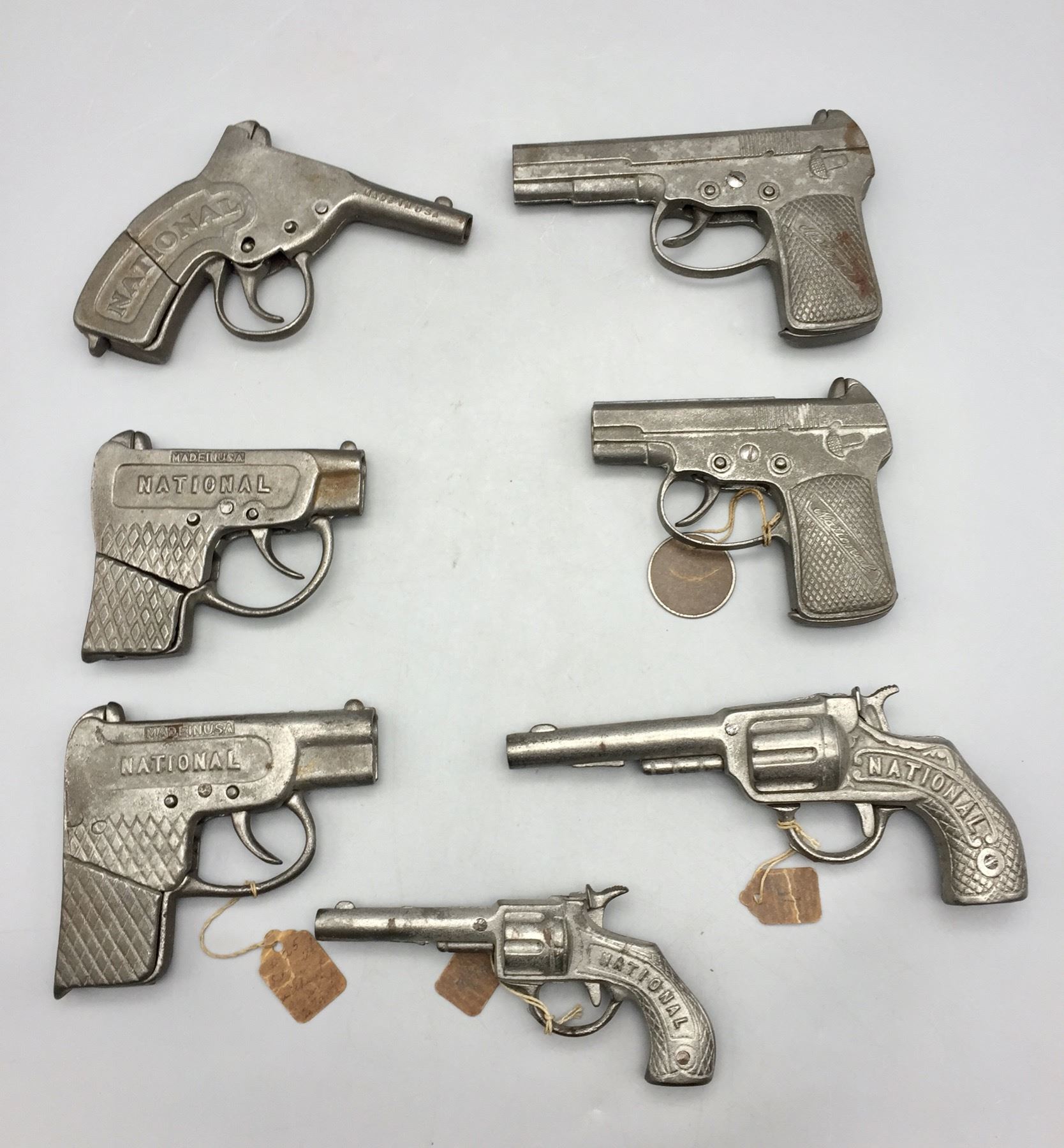 Description: Presented for sale in this lot is a group of 7 National cap guns. There are three sets of two matching ones with a smaller and larger example of each. It has been suggested that the smaller sized ones were salesman samples. All in original condition and some even have original tags. Maker: National. Approx. Age: Circa 1930s - 50. Size: Various. Condition: Good for their ages, normal aging expected. Please look closely at the pictures - they are an important part of our description. Shipping: There will be a $8 handling, packaging fee for shipping this lot. The actual cost of postage will be added on top of that.
