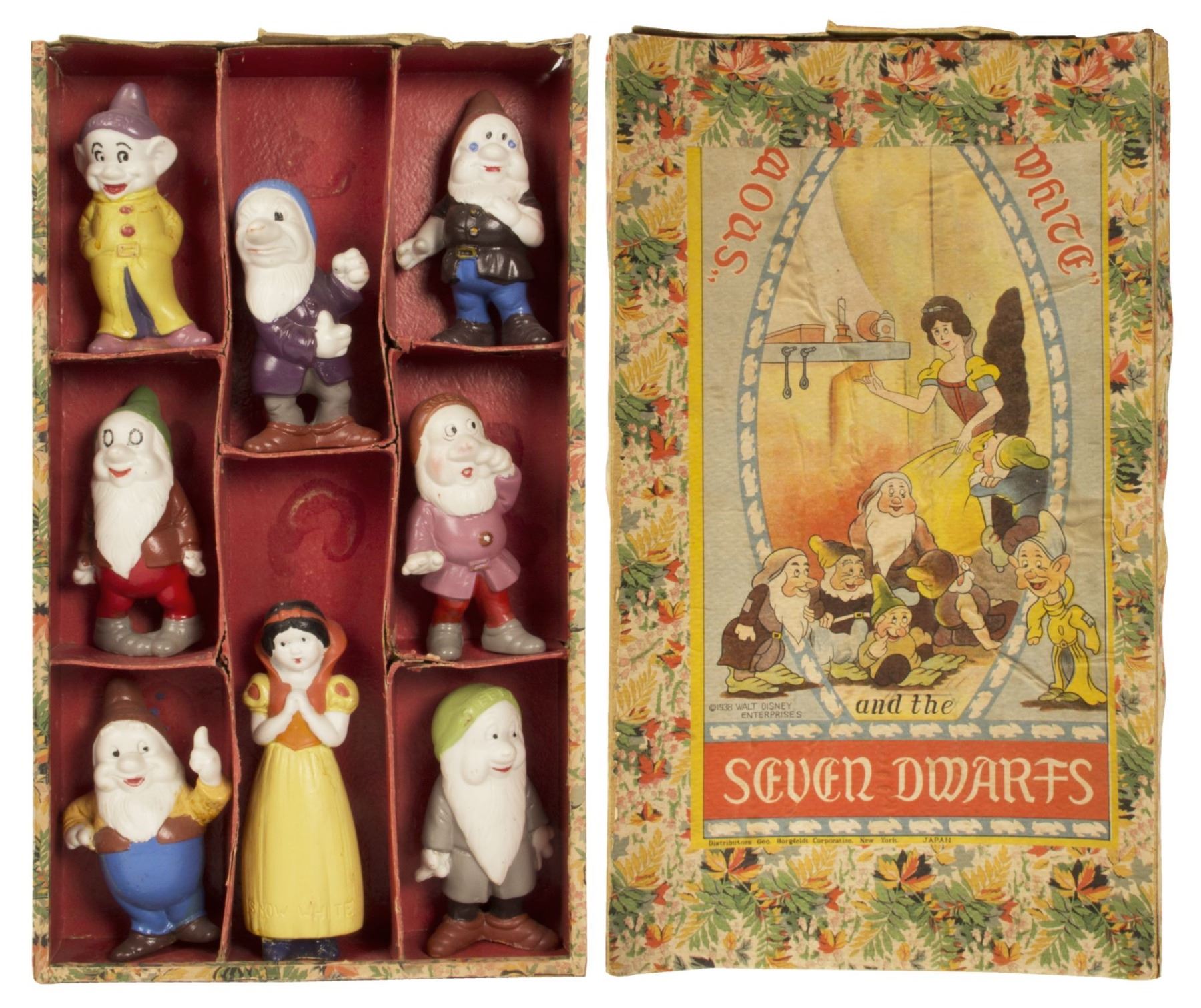 (George Borgfeldt Corporation, 1938) A group of (8) Snow White and the Seven Dwarfs bisque figures with their original box. The figures were imported from Japan by the George Borgfeldt Corporation, and it is clear from the illustration on the box that even under Kay Kamen's watchful eye, quality control from Borgfeldt was not always up to Disney's standards. The 9"x5"x1.5" box is in fair condition. The lid is ripped at the front and back of the box, with some wear on the interior. The figures are in fair condition, and several appear to have been touched up or repainted. There is some wear to the paint, as well as some discoloration and paint transfer due to the apparent repainting, and a few minor chips. Happy has a crack along his nose.