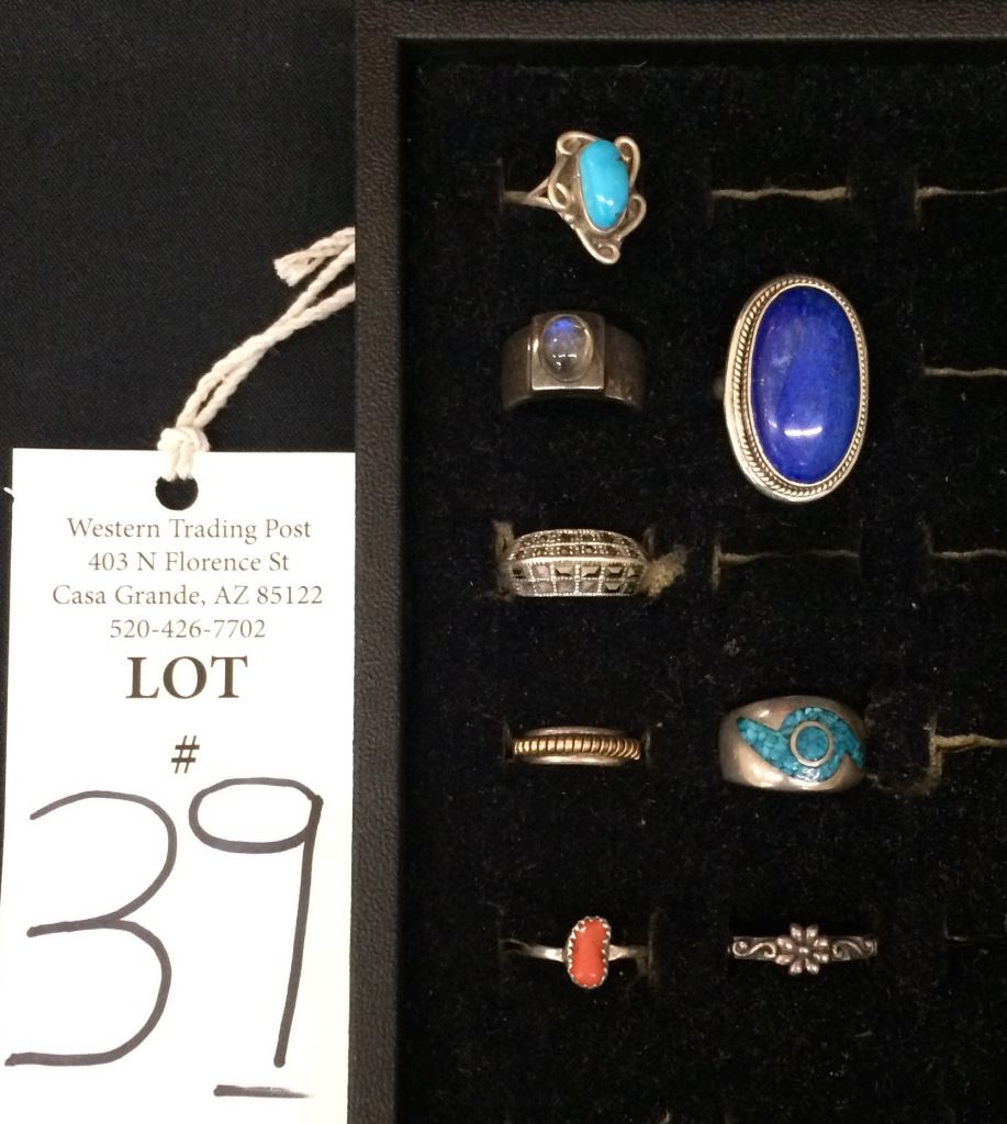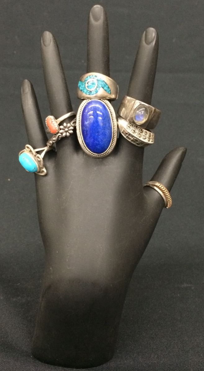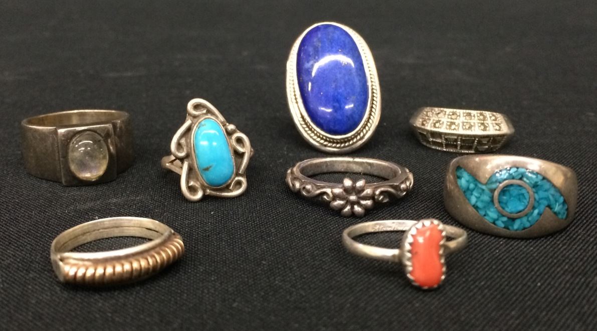 There are 8 sterling rings for 1 money in this lot! Various stones and styles. There are two size 5, one size 6 and five of them are size 8. Collectively they weigh 52.5g