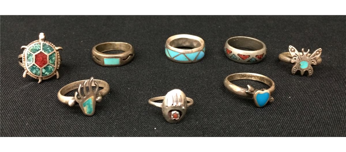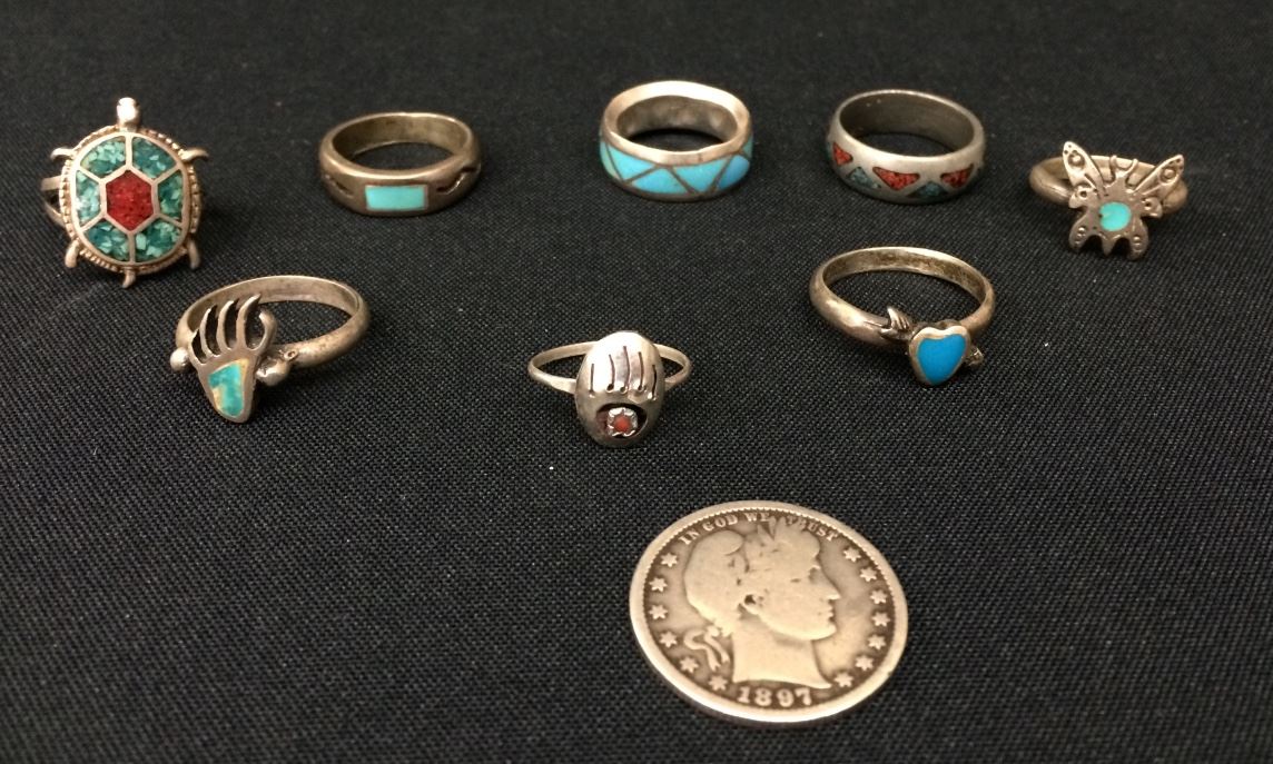 You get all 8 of these vintage rings for 1 money! They are all sterling and unsigned. Sizes are; 3, 4, (three are size 5), 6, 7 and 7.5. Together they weigh 27.5g. Good vintage condition. Shipping: There will be a $5 handling / packaging fee for shipping this lot. The actual cost of postage will be added on top of that.