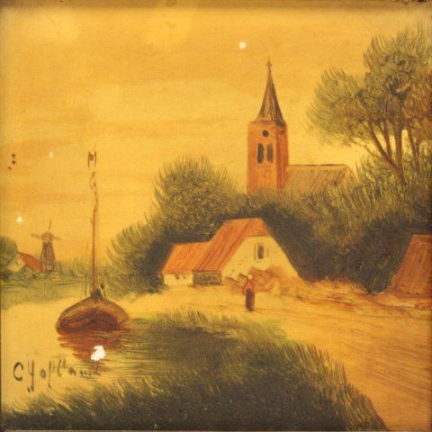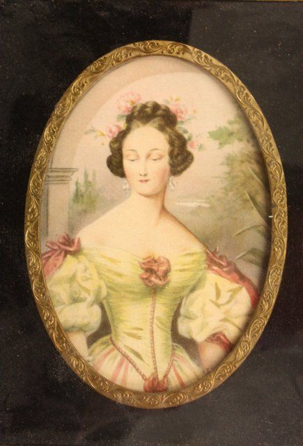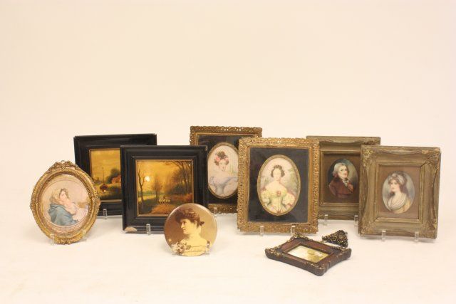 Including: 1- Pair hand painted Dutch tiles, artist signed, approx. 4" square. 1- Pair hand painted portraits on ivorine of "Man" & "Lady", approx. 2.5" x 3". 1- Pair oval portraits of a "Lady" on silk, approx. 4.5" x 3". 1- Button of a