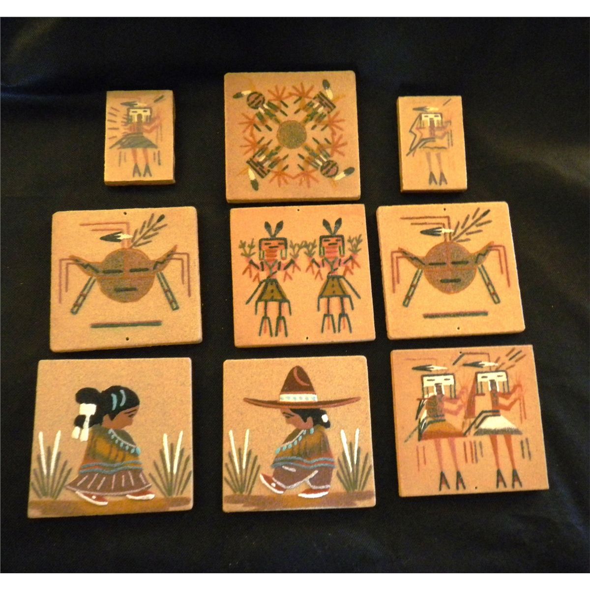 Group of Nine authentic Navajo Sand Painting Measuring 4"x4" and 2"x 3" cc 1970's Shipping $10.50