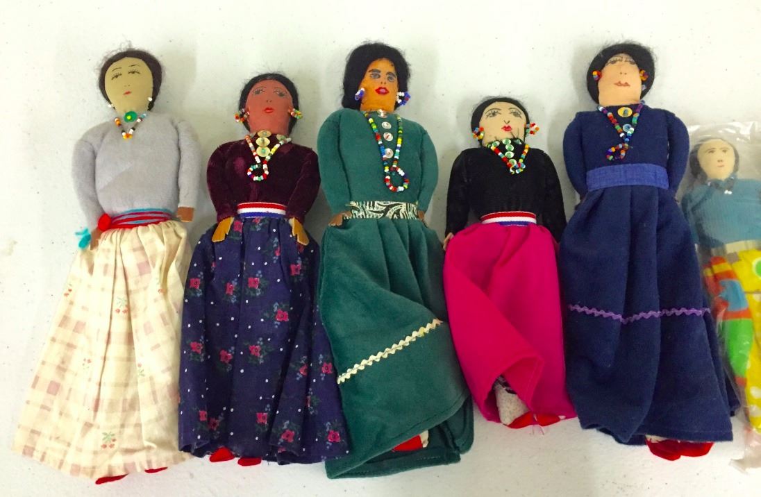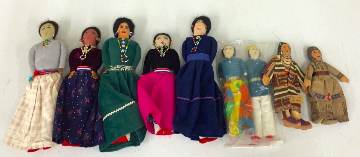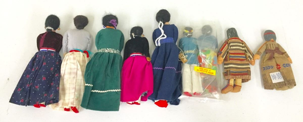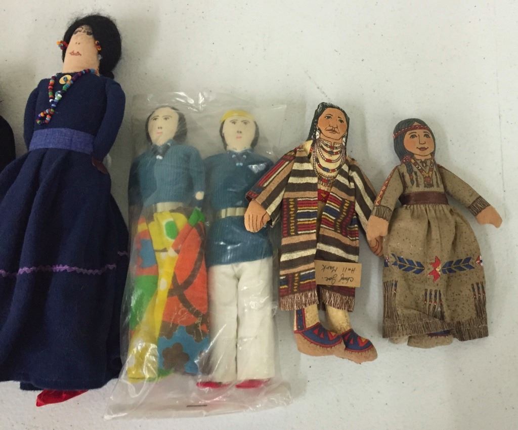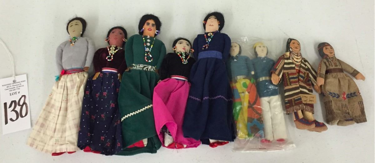 Dolls range from 6” to 10” in height. 7 of them are handmade Native dolls, the two smallest ones are factory made, Native style. Please look closely at pics - they are an important part of our description. Shipping: There will be a $7 handling / packaging fee for shipping this lot. The actual cost of postage will be added on top of that.