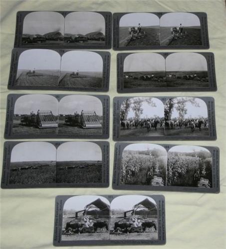Group of 9 stereoscope cards by Keystone View Co. numbered 177-185. Depicting farm scenes in ND, SD, NE, KS. One card entitled Indians in Full Feather. Cards are slightly curved.