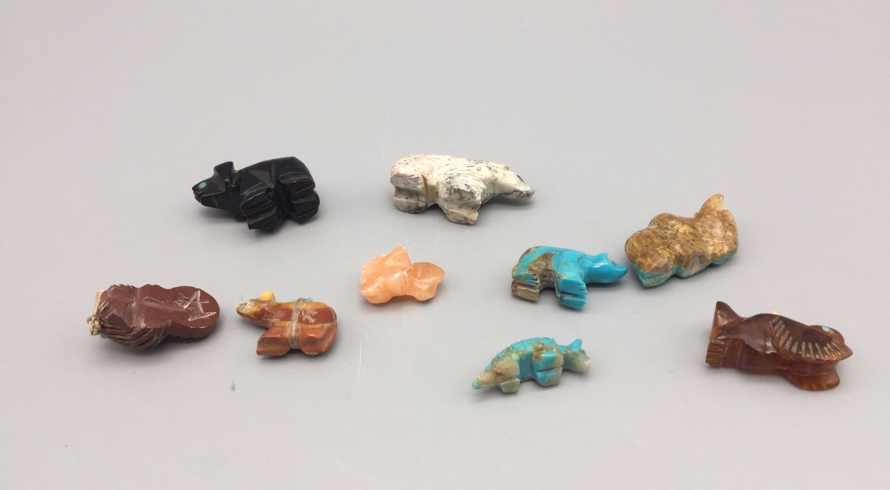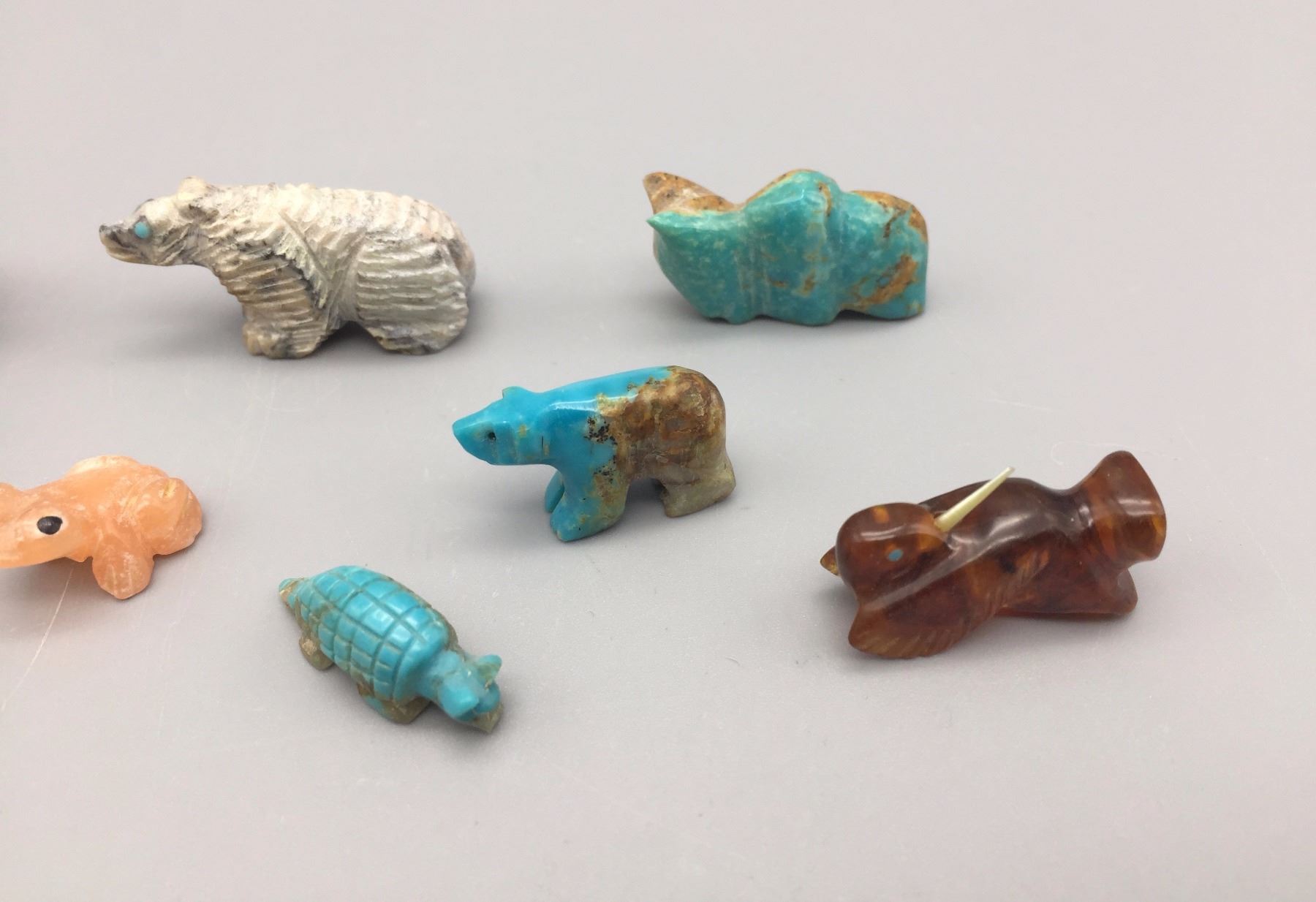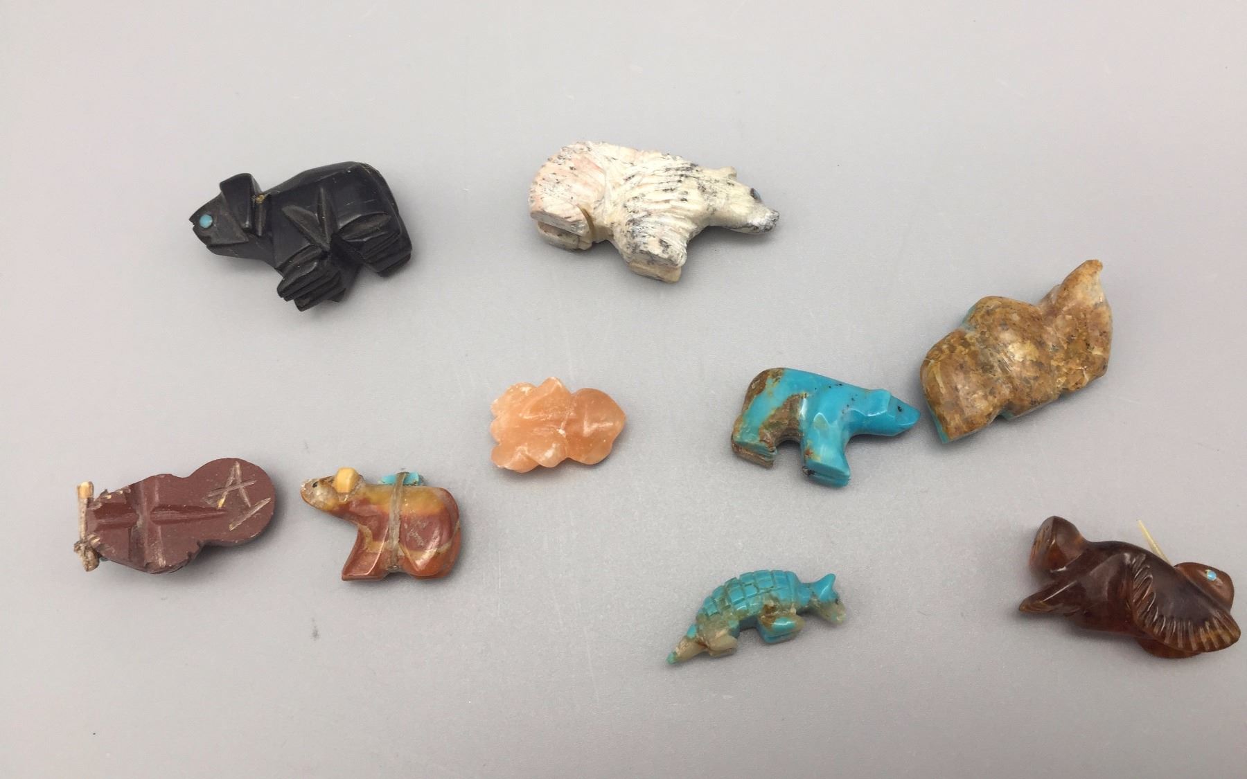 Maker: Various artists. Approx. Age: Circa 1970s or newer. Size: Measure from 5/8” to 1 3/8” l. Additional Info: Group of 9 Zuni fetishes. Condition: Good for their ages, normal wear expected. Please look closely at the pictures - they are an important part of our description. Shipping: There will be a $5 handling / packaging fee for shipping this lot. The actual cost of postage will be added on top of that.