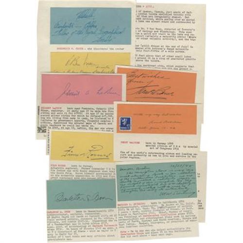 <B>Group of Adventurer and Explorer Signatures</B></I> all on cards, about 5.5 x 2, mounted on stiff paper stock with biographical sketches. The group includes wild animal authority <B>Frank Buck</B></I> signed with his <I>Bring 'em back alive</B></I> catch phrase, <B>V. Ben Meen</B></I> and <B>Frederick W. Chubb</B></I> discovers of the Chubb meteorite crater in Quebec, Canada, <B>Gilbert A. LaBine</B></I> a Canadian prospector and mining mogul, Norwegian <B>Finn Ronne,</B></I> Antarctic explorer, Norwegian <B>Bernt Balchen,</B></I> polar explorer, <B>Matthew W. Stirling,</B></I> ethnologist and archaeologist, and anthropologist <B>Carleton S. Coon,</B></I> Fine. <BR><BR><b>Shipping:</b> Flat Material, Small (<a target="_blank" href="http://www.heritageauctions.com/common/shipping.php">view shipping information</a>)