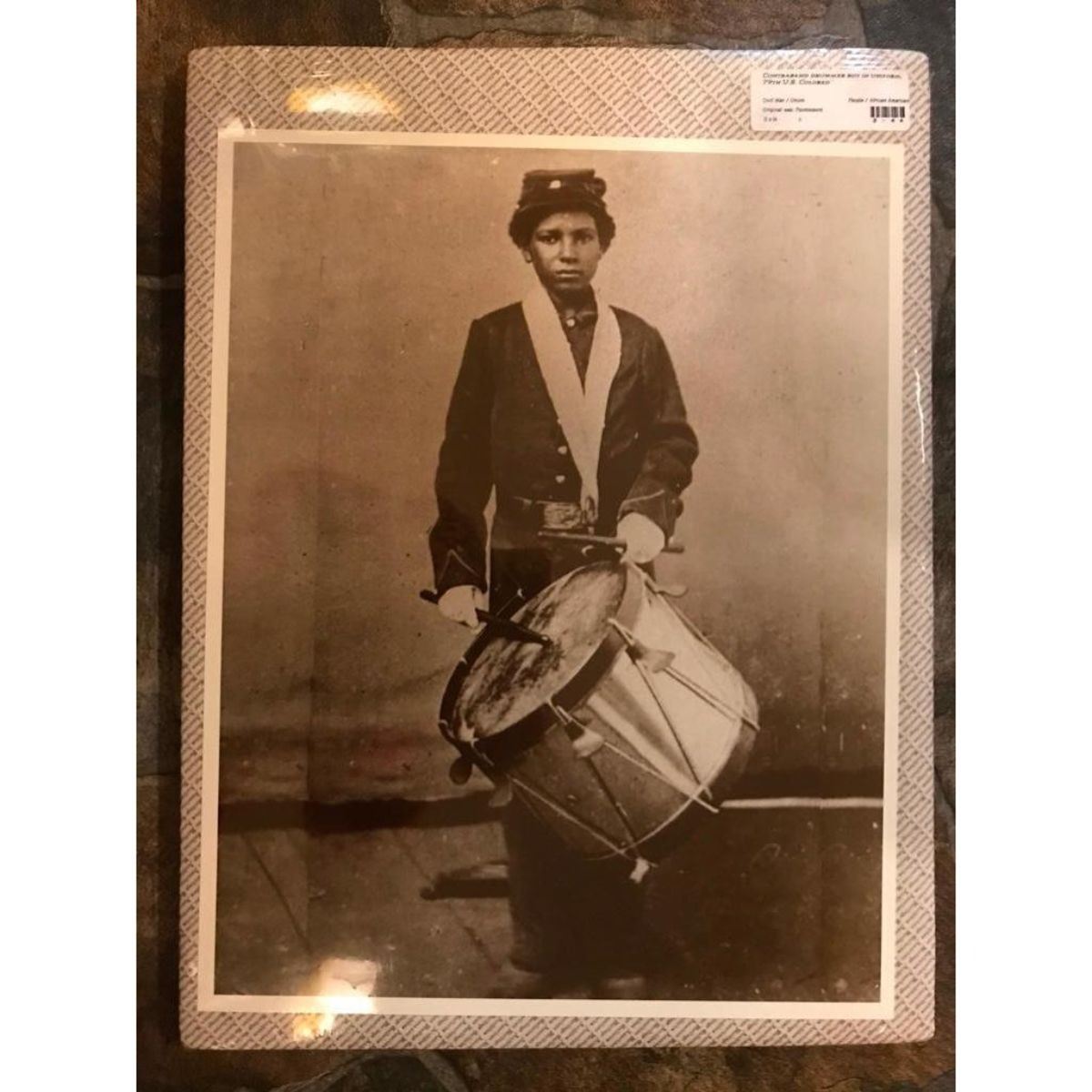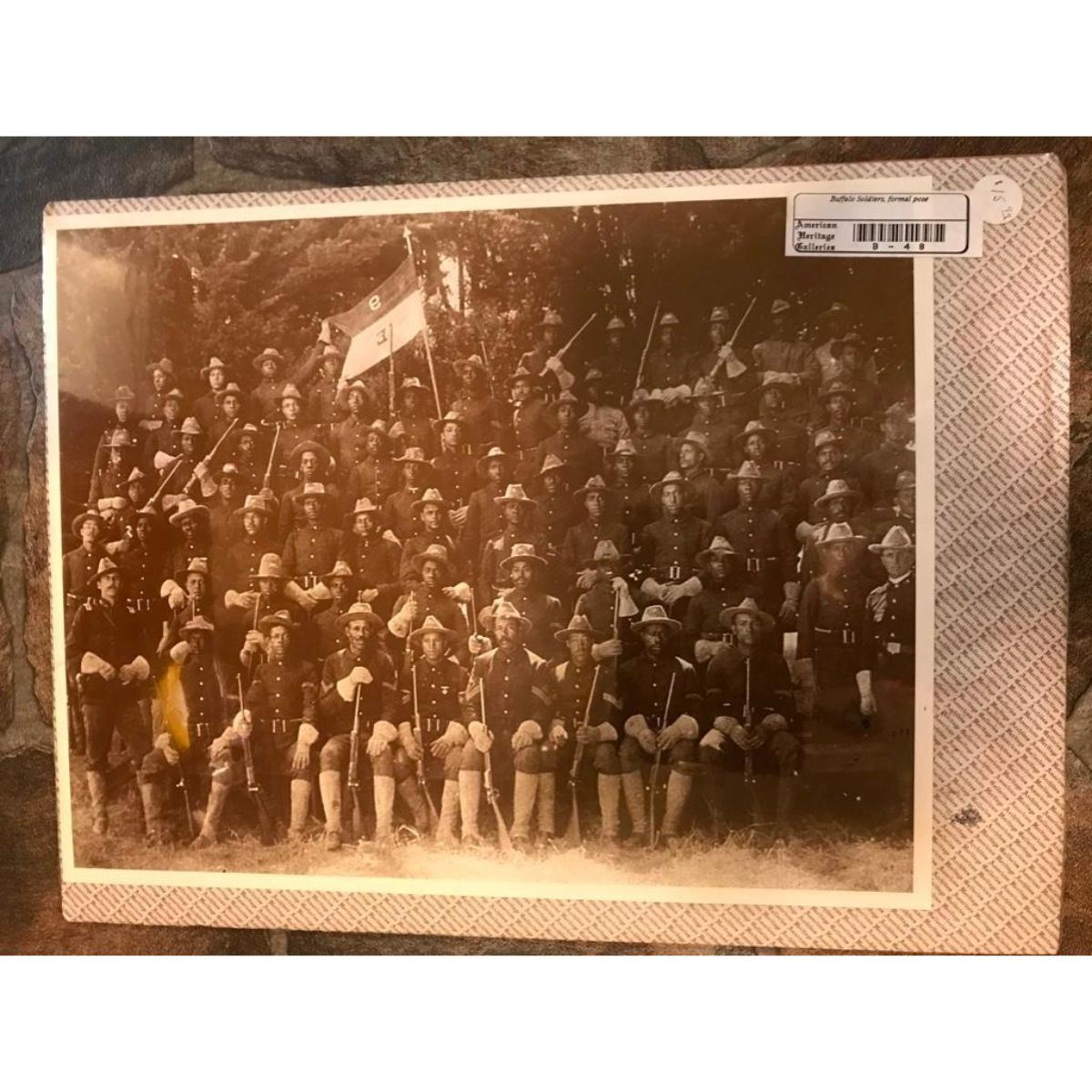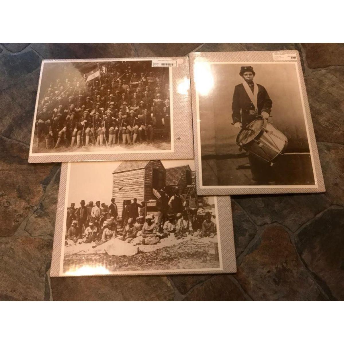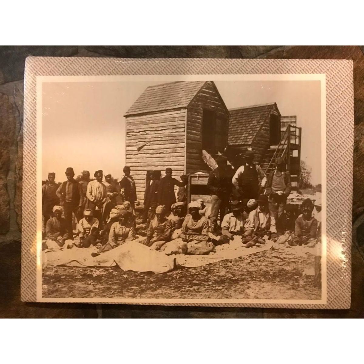 Group of 3 Black Americana, African American history-themed sepia tone photo prints, featuring 19th Century subjects: Buffalo Soldiers in formal pose with rifles, a contraband drummer boy in uniform from the 79th U.S. Colored Troops during the Civil War & a cotton plantation in South Carolina, enslaved people in front of cotton gin. All photo prints created on heavy card stock for sale in the early 1990's for The American Heritage Gallery, all are still shrink wrapped in original packaging. 11" X 14" each.Â