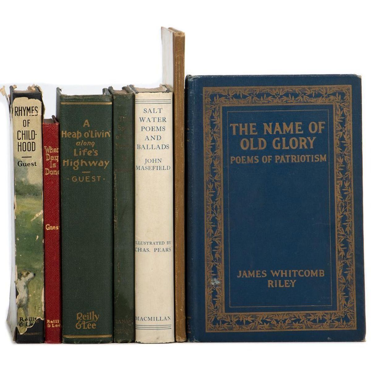 Group of American verse and ballads, seven titles, in generally Good condition: 1.-3. GUEST, EDGAR A. A Heap o'Livin' Along Life's Highway. Chicago: The Reilly & Lee Co., 1916. First edition of this printing. Edgar Guest's Rhymes of Childhood. Chicago: The Reilly & Lee Co., 1924. First edition. Dust jacket in Fair condition. And, When Day Is Done. Chicago: The Reilly & Lee Co., 1921. 4. MASEFIELD, JOHN. Salt Water Poems and Ballads. New York: McMillan Company Publishers, 1934. Dust jacket Good, small tears. 5.-6. RILEY, JAMES WHITCOMB. The Name of Old Glory: Poems of Patriotism. Indianapolis: The Bobbs-Merrill Company Publishers, 1917. Introduction by Booth Tarkington, frontispiece by Howard Chandler Christy. And, Old Fashioned Roses. Indianapolis: The Bobbs-Merrill Company Publishers,1914. Illustrations by Franklin Booth. 7. SERVICE, ROBERT W. The Spell of the Yukon and Other Verses. New York: Barse & Hopkins Publishers, 1907. First edition. Wear and stains to spine, tiny white flecks on top of front cover.