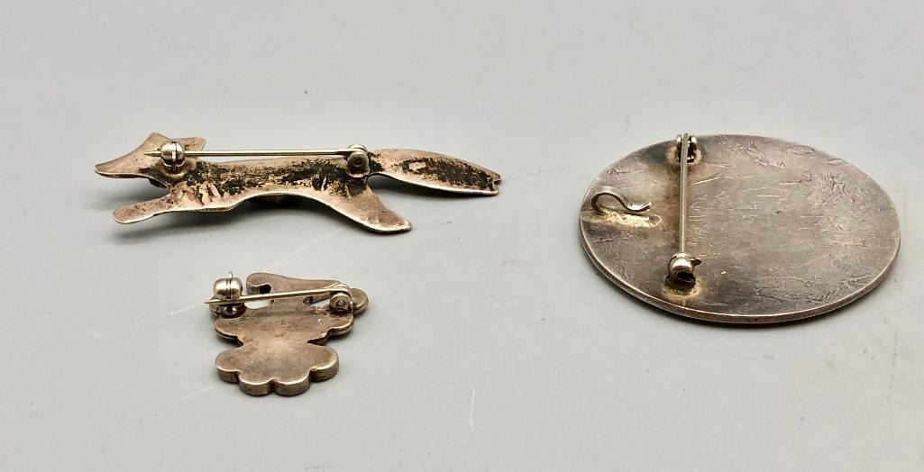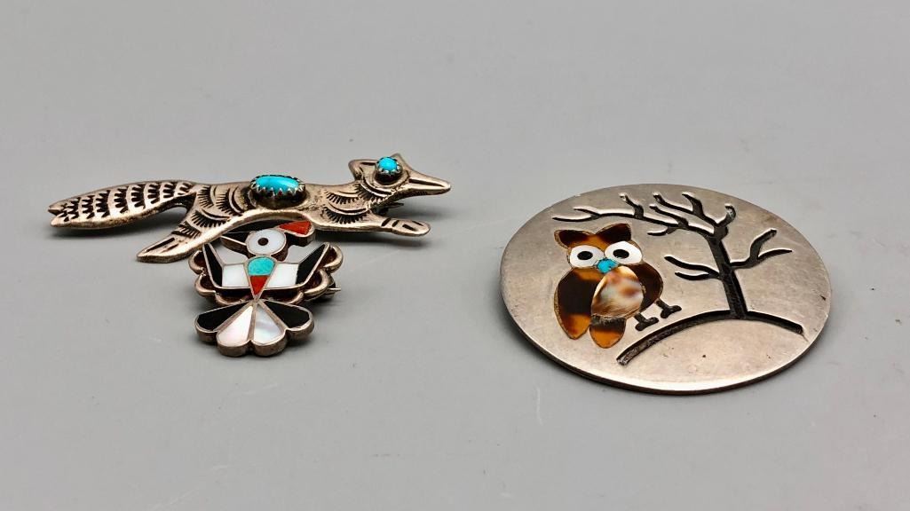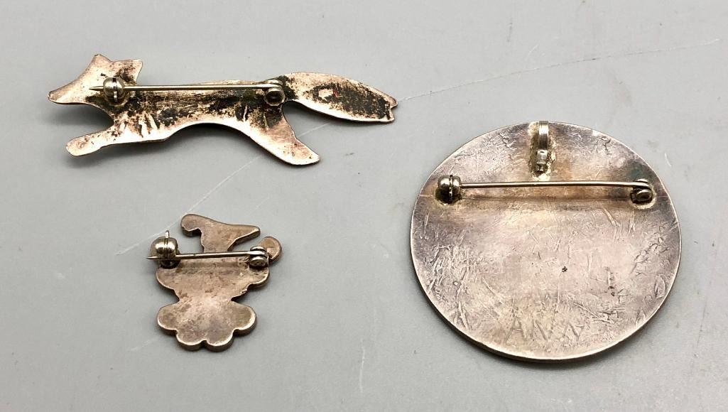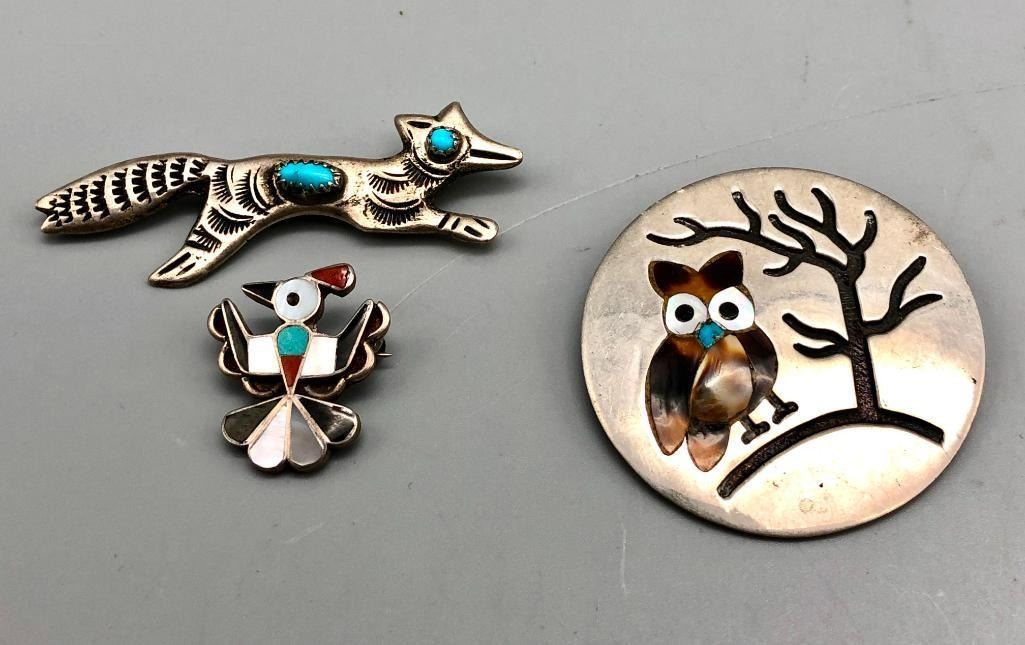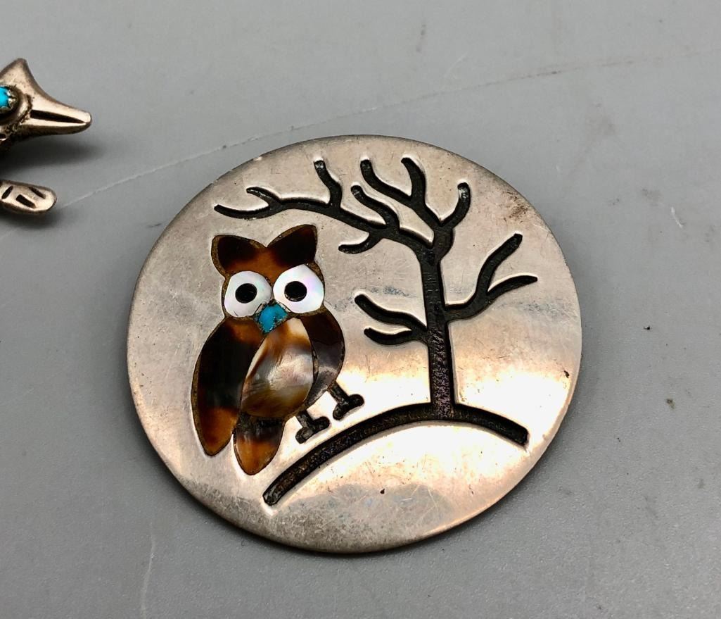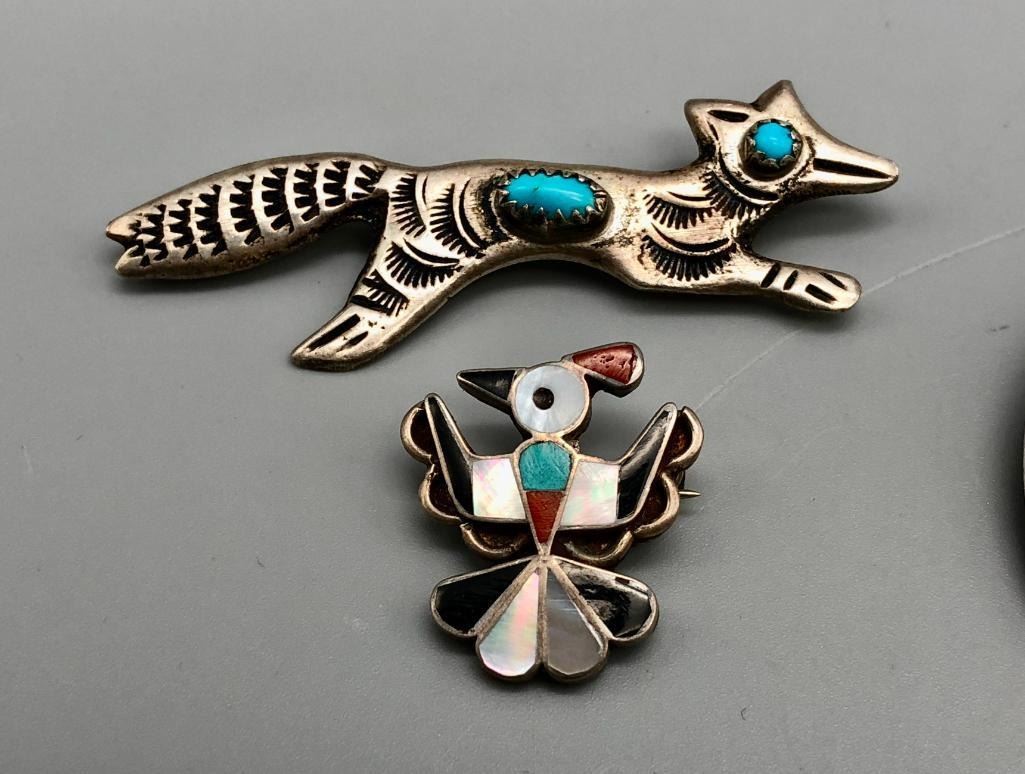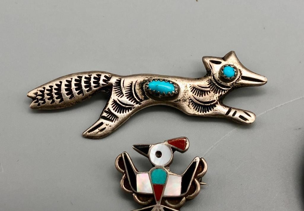 Offered for sale in this lot is a group of angelic animal themed pins. This is a fun group of owl, bird and coyote themed pins. All are set with various stones with either overlay or inlay styles. All are made from sterling silver. MAKER: Unmarked. APPROX AGE: Vintage. SIZE: Various. Combined weight is 28 grams. CONDITION: Good for their age, normal wear expected. Please look closely at the pictures as they are an important part of our description and are hereby incorporated into the description, specifically with regards to condition. SHIPPING: There will be a $5 handling / packaging fee for shipping this lot. The actual cost of postage will be added on top of that. BUY IT NOW: If you would like to buy this item now, without waiting for the auction day to bid on it, we do offer this option (which is available up to 48 hours before the actual auction starts). The “Buy it Now†price is the high estimate of this lot (plus applicable fees and the Buyer's premium is discounted to 10% when using the Buy it Now option). If you would like to exercise this option, you must contact us by email (or phone as long as you talk to someone live). Reference this lot number and your intention to "Buy it Now."