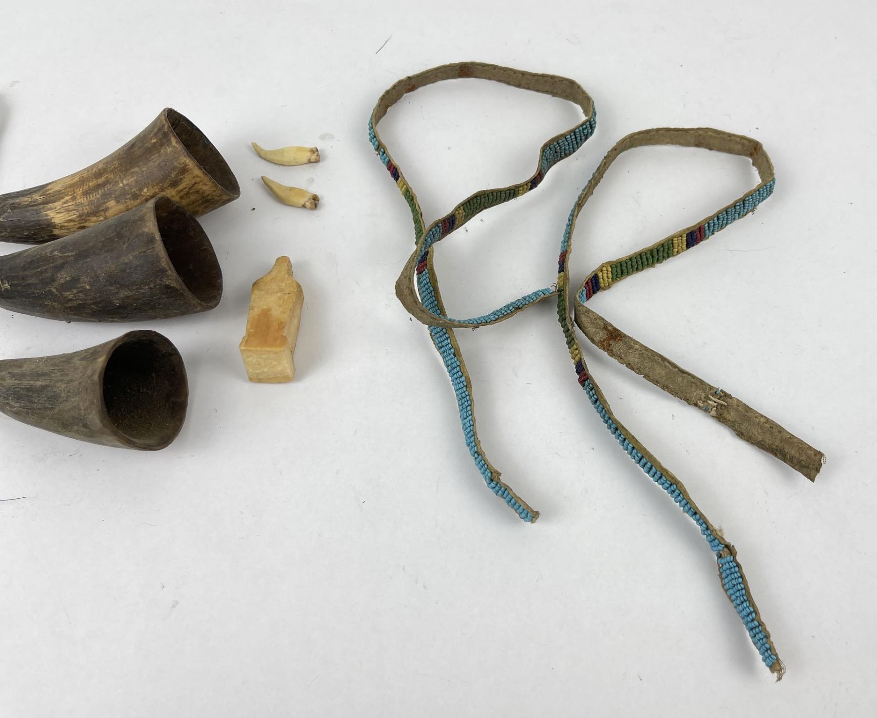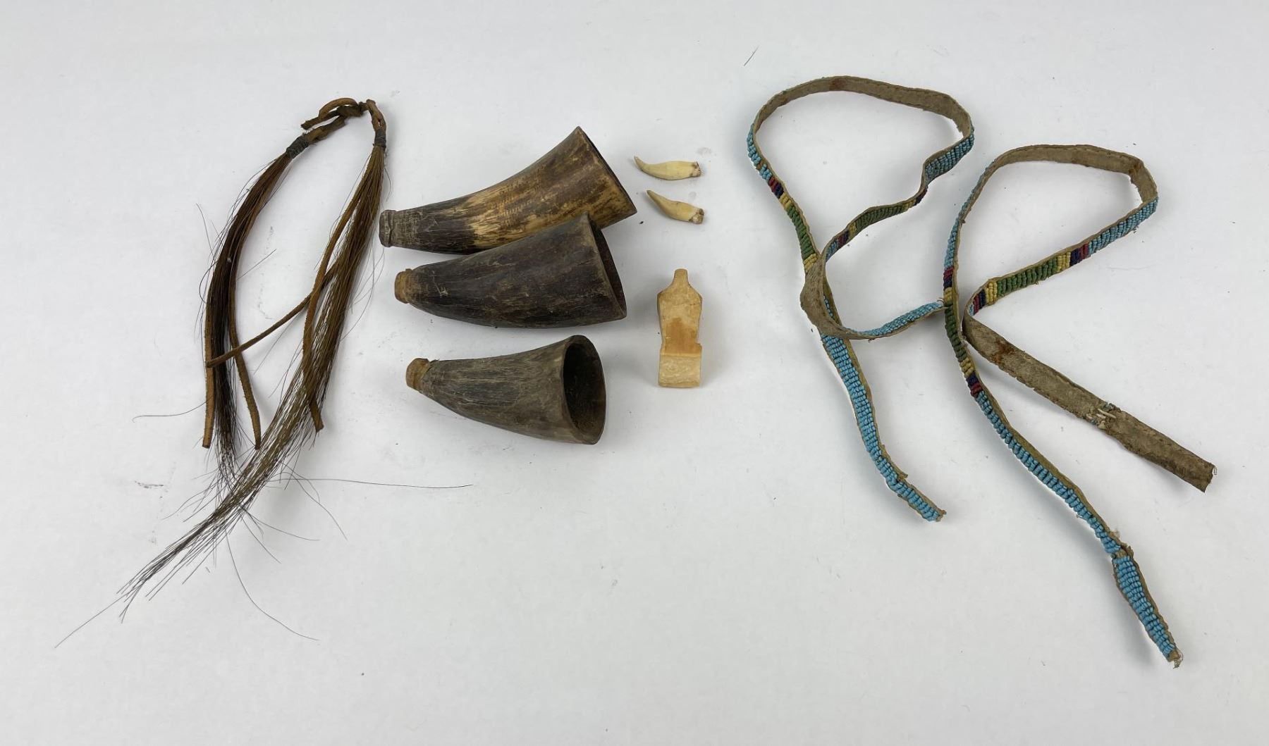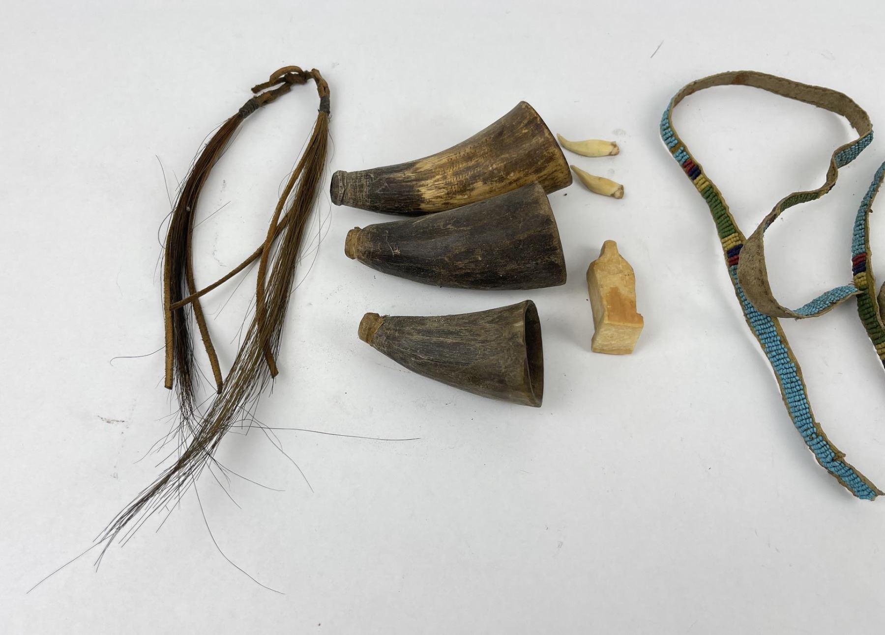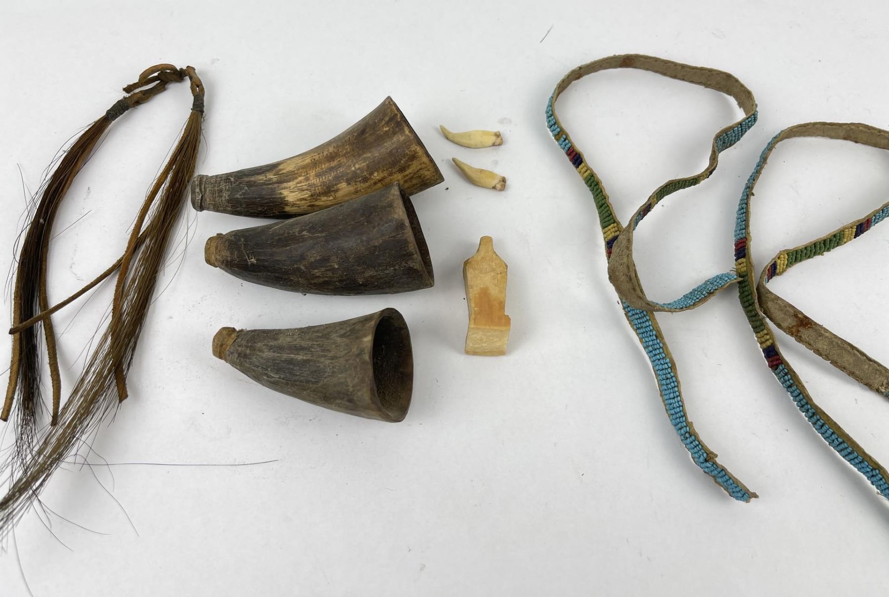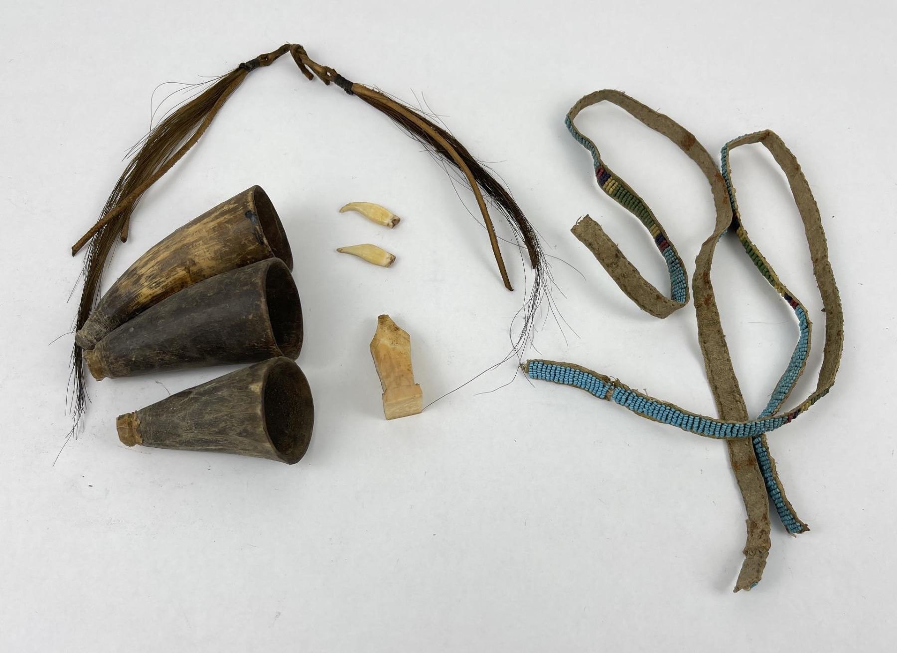 Hair tassel drops. Beaded strip, teeth and buffalo horn caps.