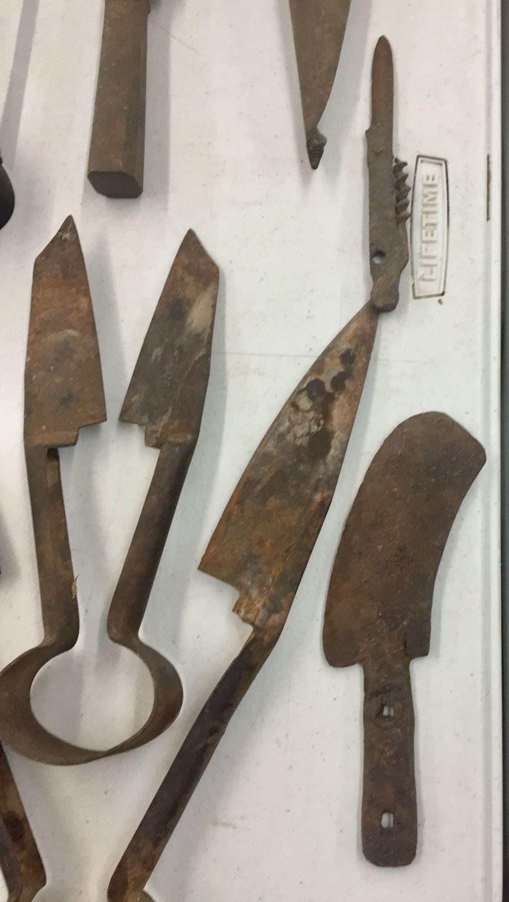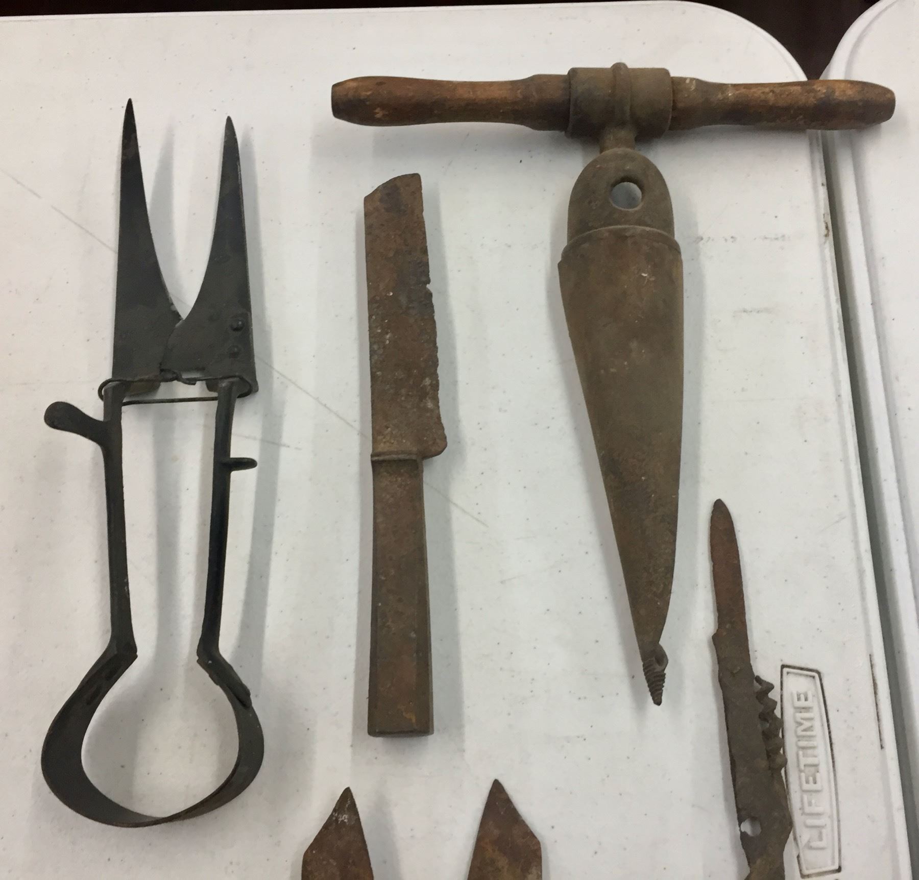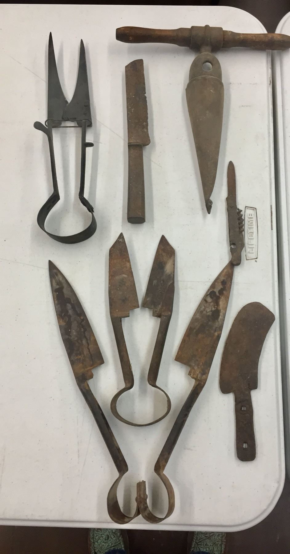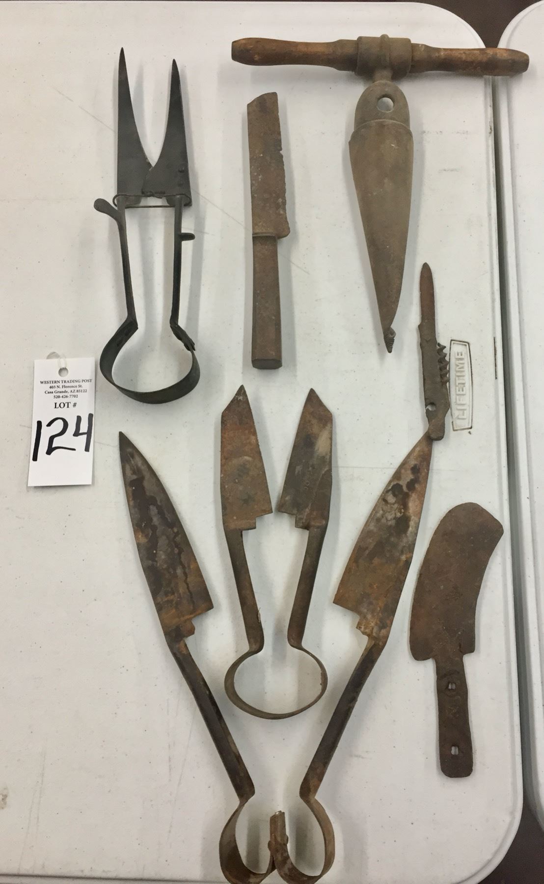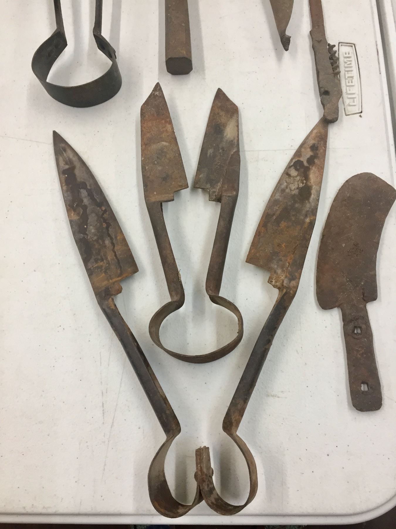 Description: For sale in this lot is a group of antique shears and various devices for cutting. These are all antiques from the Relics Museum. Maker: Various. Approx. Age: Antiquies. Size: From 10-1/2”w x 11-1/2” long to 3/4”w x 6” long. Condition: Moslty fair, some poor. All, as found. Please look closely at the pictures - they are an important part of our description. Shipping: There will be a $8 handling / packaging fee for shipping this lot. The actual cost of postage will be added on top of that.