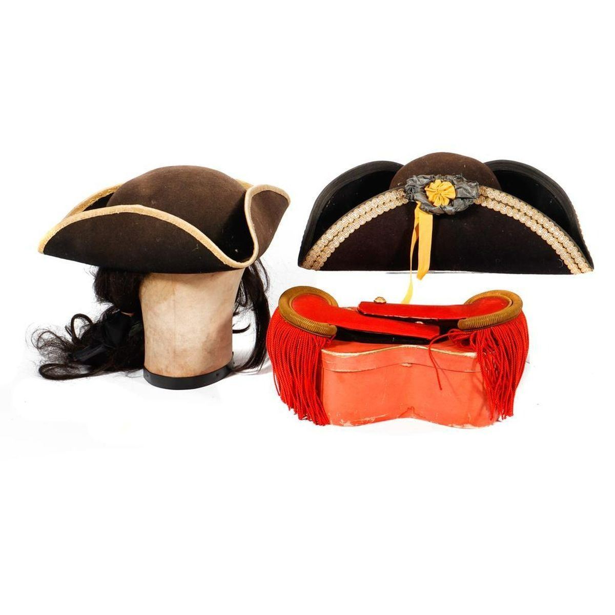 Consisting of two tricorne wool hats, one with label "Classico Semilepre" (hats are soiled but in generally good shape); a vintage canvas hat form (staining)with wig; and a boxed pair of epaulets (good condition). Condition Report: All lots are sold as is and where is. Turner Auctions + Appraisals, LLC provides condition reports upon request to aid in your bidding decision. No statement regarding age, condition, kind, value, or quality of a lot, whether made orally at the auction or at any other time, or in writing in this catalog or elsewhere, shall be construed to be an express or implied warranty, representation, or assumption of liability. All sales are final, Turner Auctions + Appraisals, LLC does not give refunds based on condition. Turner Auctions + Appraisals, LLC does not perform any shipping or packing services. We do have a list of suggested shippers who gladly provide quotes prior to your bidding. Please visit our webpage for a list of recommended shippers.