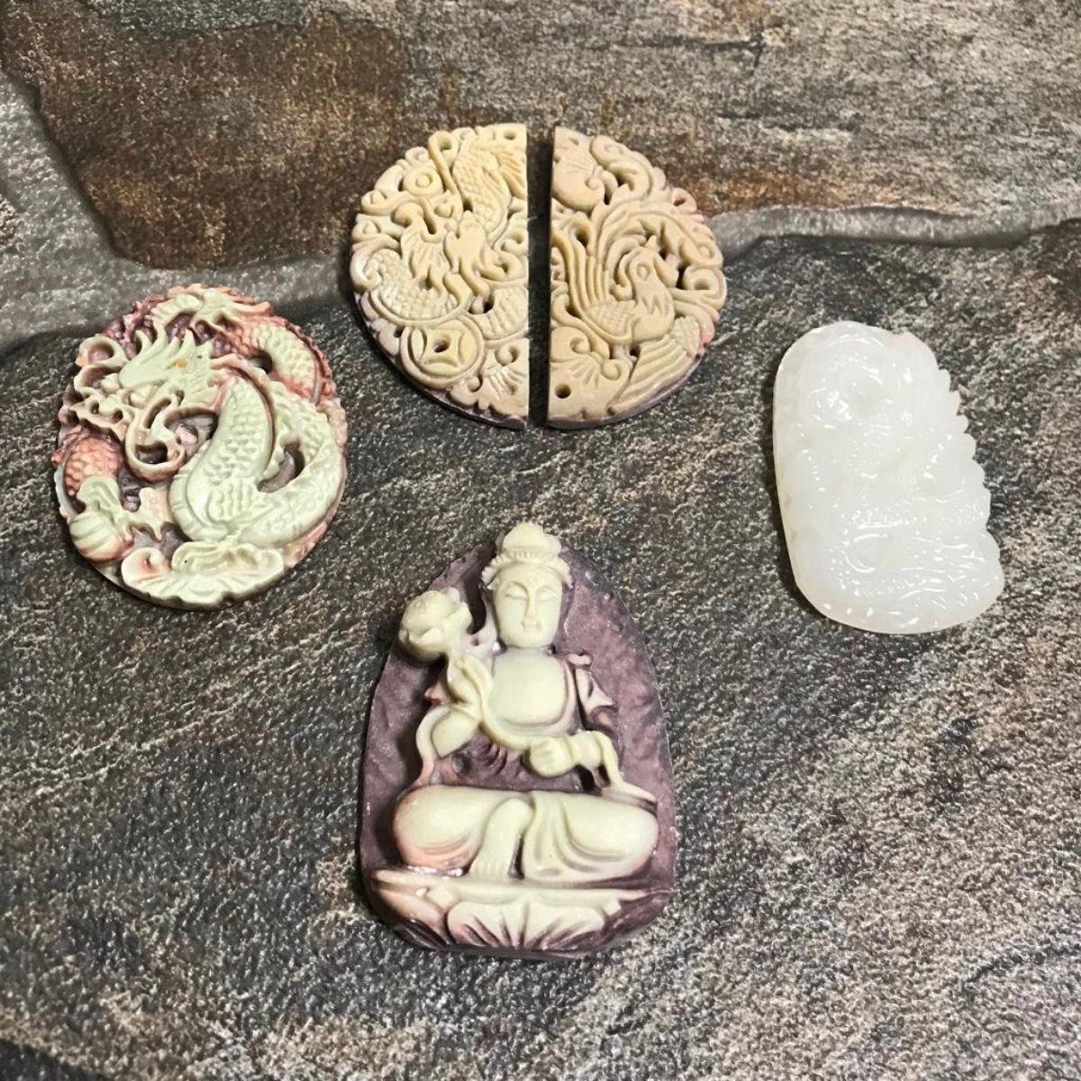 Group of Asian carved pendants, composite & stone, features QuanKuan Yin, dragons & phoenix. 1 3/4" - 2".