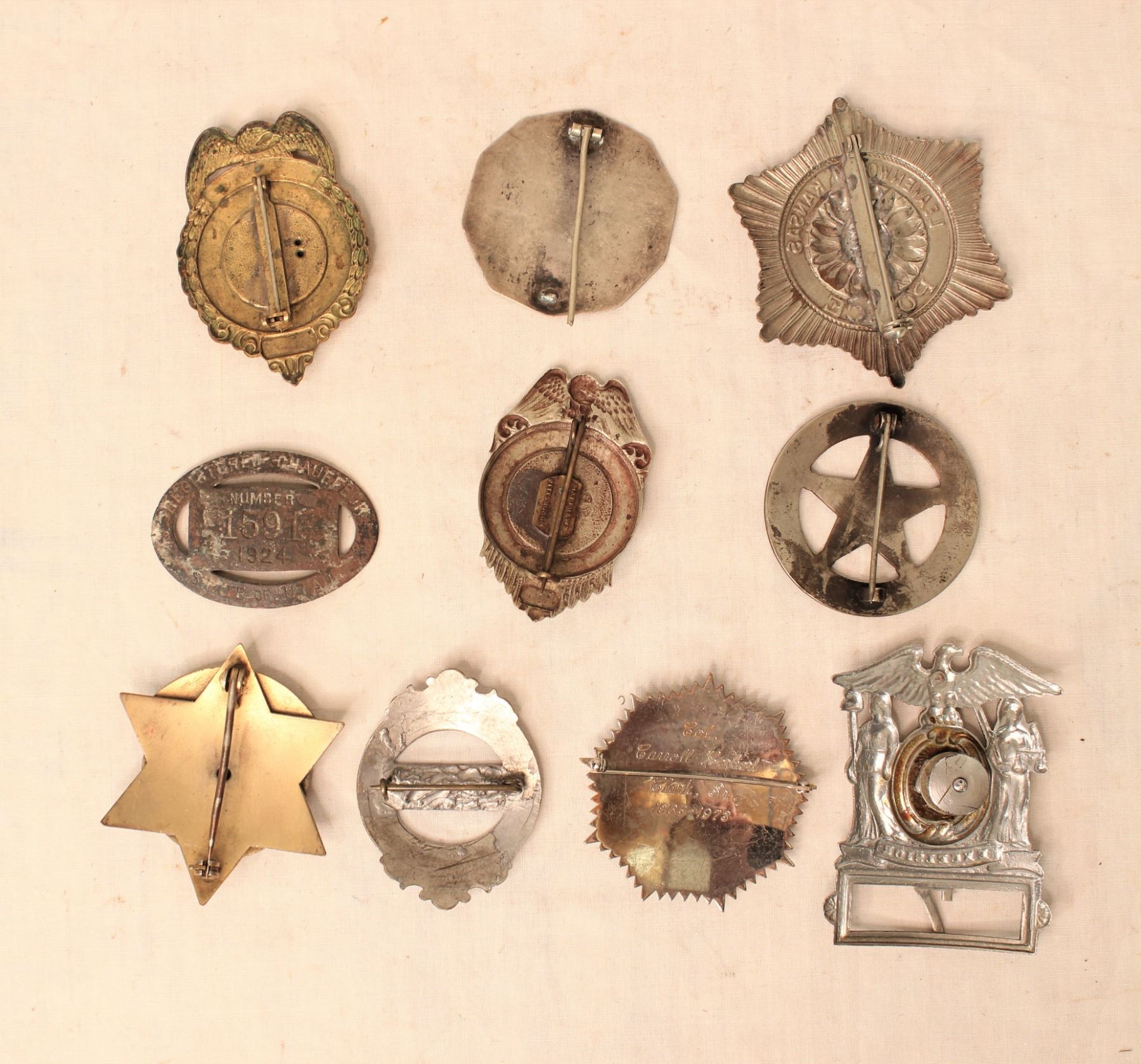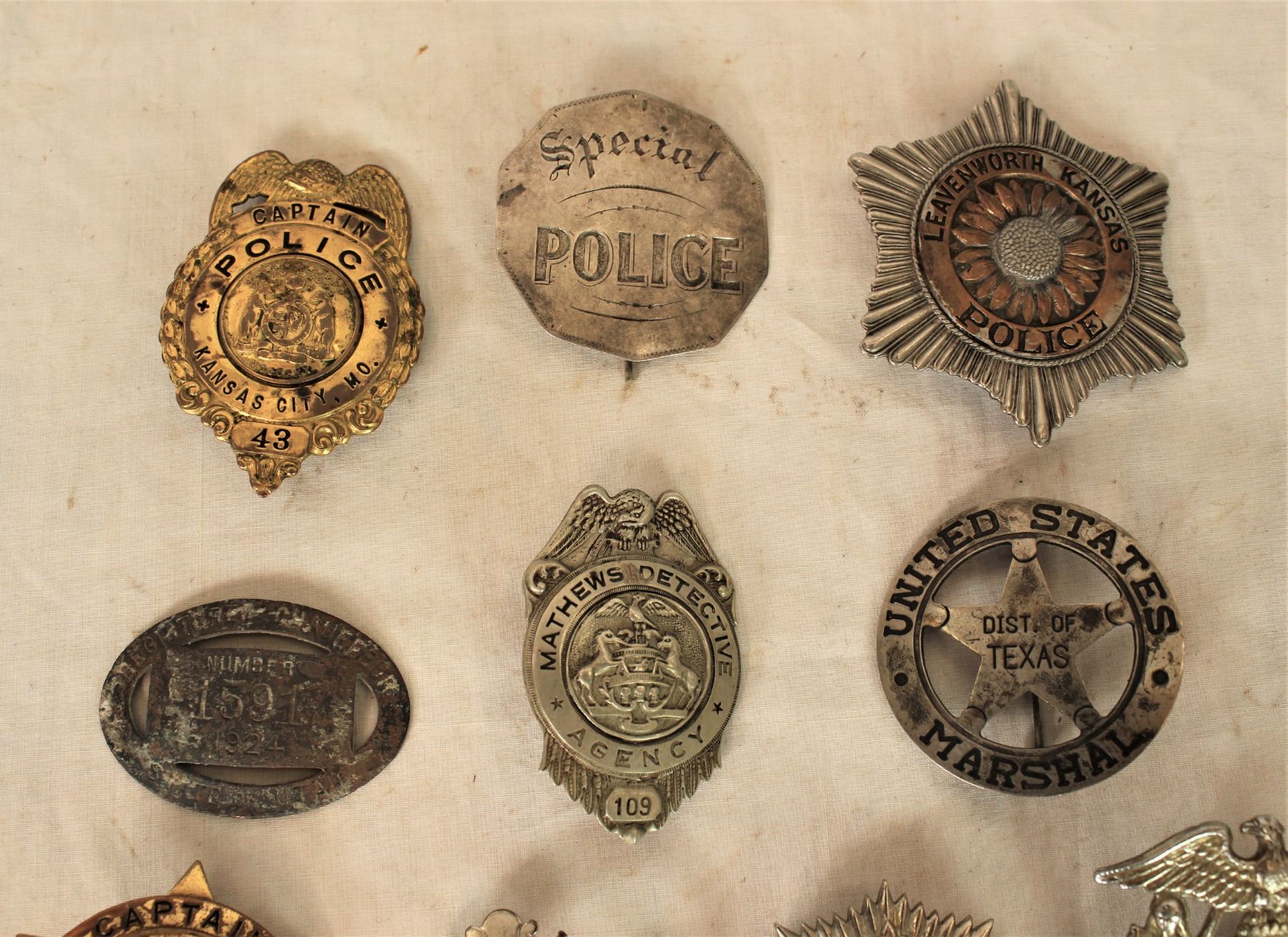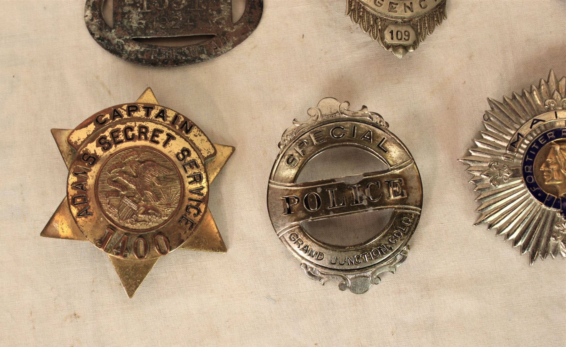 Wonderful group of 9 assorted old police badges, that includes a Texas United States Marshall, Leavenworth Kansas, Adams Secret Service, and other great badges.