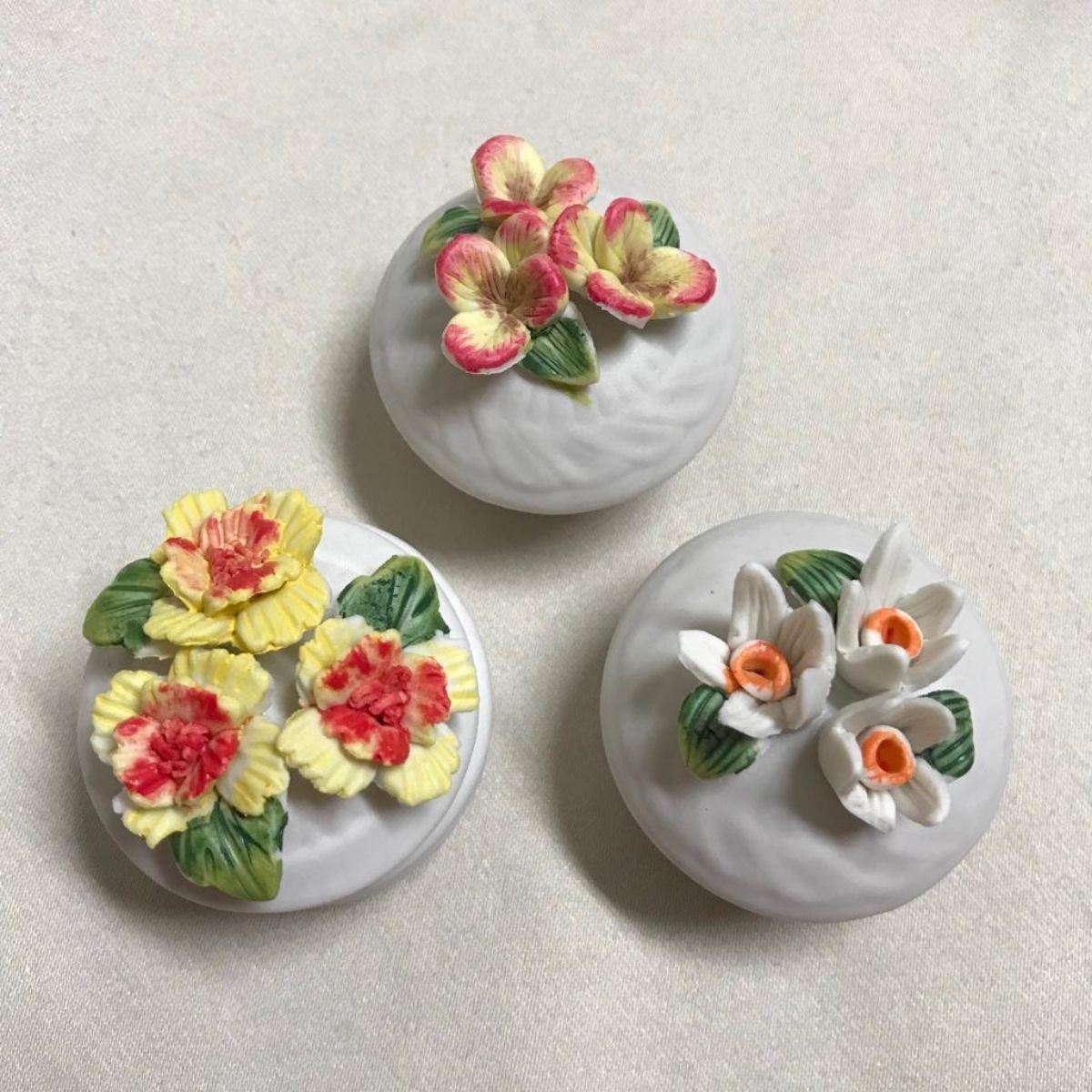 Group of 3 small bisque porcelain hand-painted flower trinket, jewel boxes. 2" each.Â