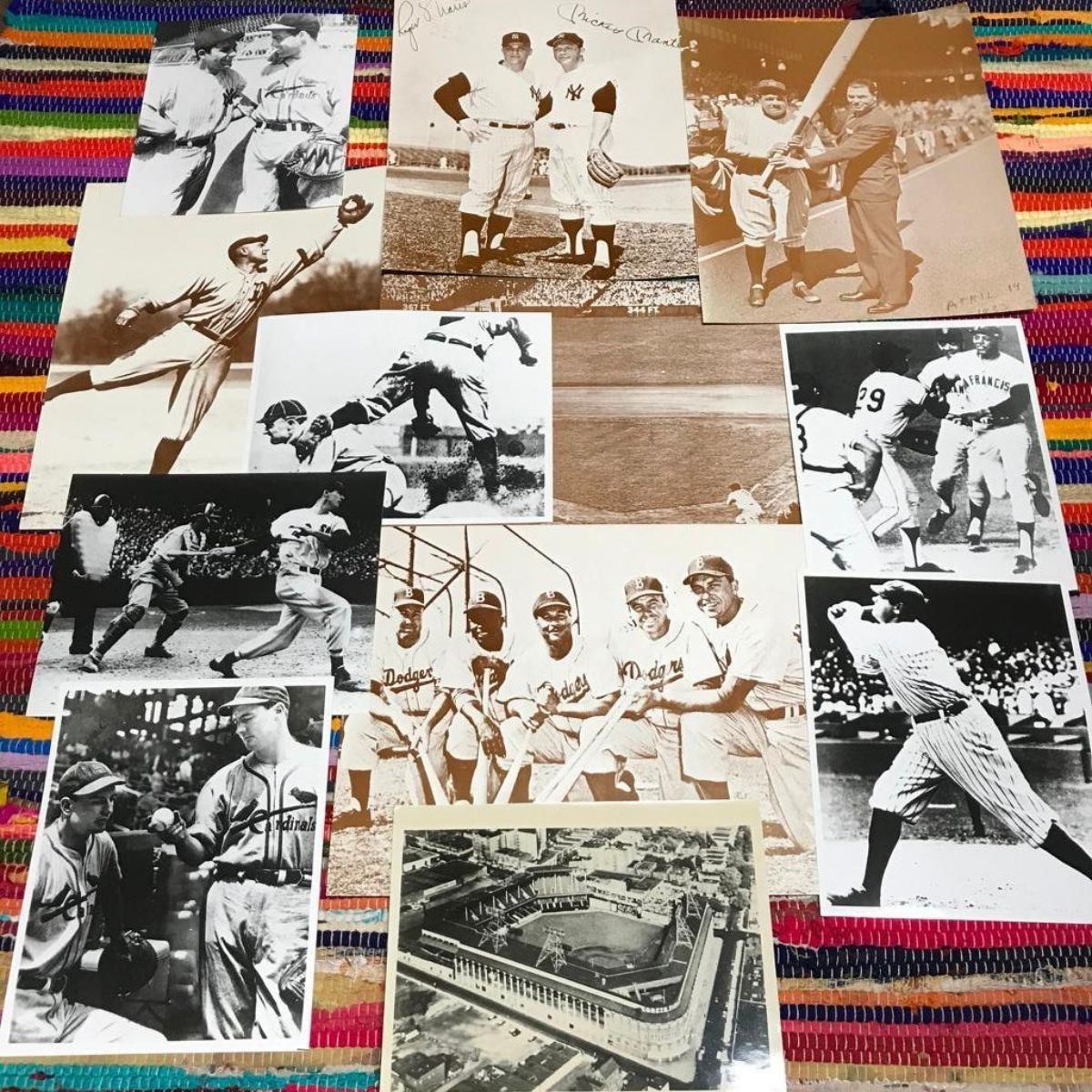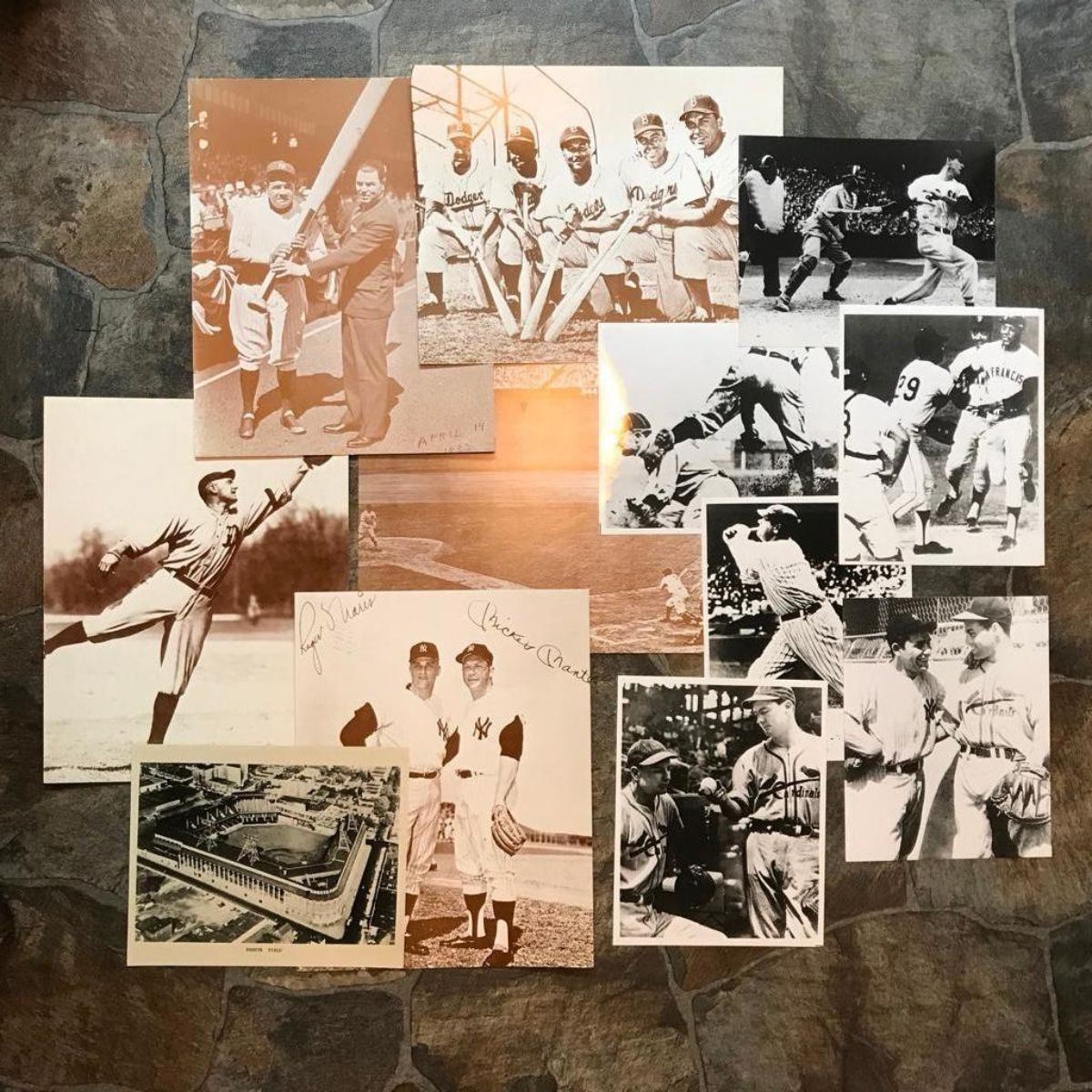 Group of 12 photo images, all baseball subjects from various decades. - 6 black & white photo re-prints on photo paper including; Cooper Brothers ( Waler & Mort ) Cardinals 1943, Babe Ruth - homer # 714 in 1935, Ty Cobb stealing 3rd base  - 1 vintage black & white photo, identified as Ebbets Field - 5 larger 11" X 14" sepia tone photo prints on card stock including; Mickey Mantle, Babe Rusty 1933 & the Dodgers. All photo prints ( except Ebbets Field ) from early 1990's stock of American Heritage Galleries in Atlanta. * tape attached to reverse side of one photo & several with minor losses along edges.Â