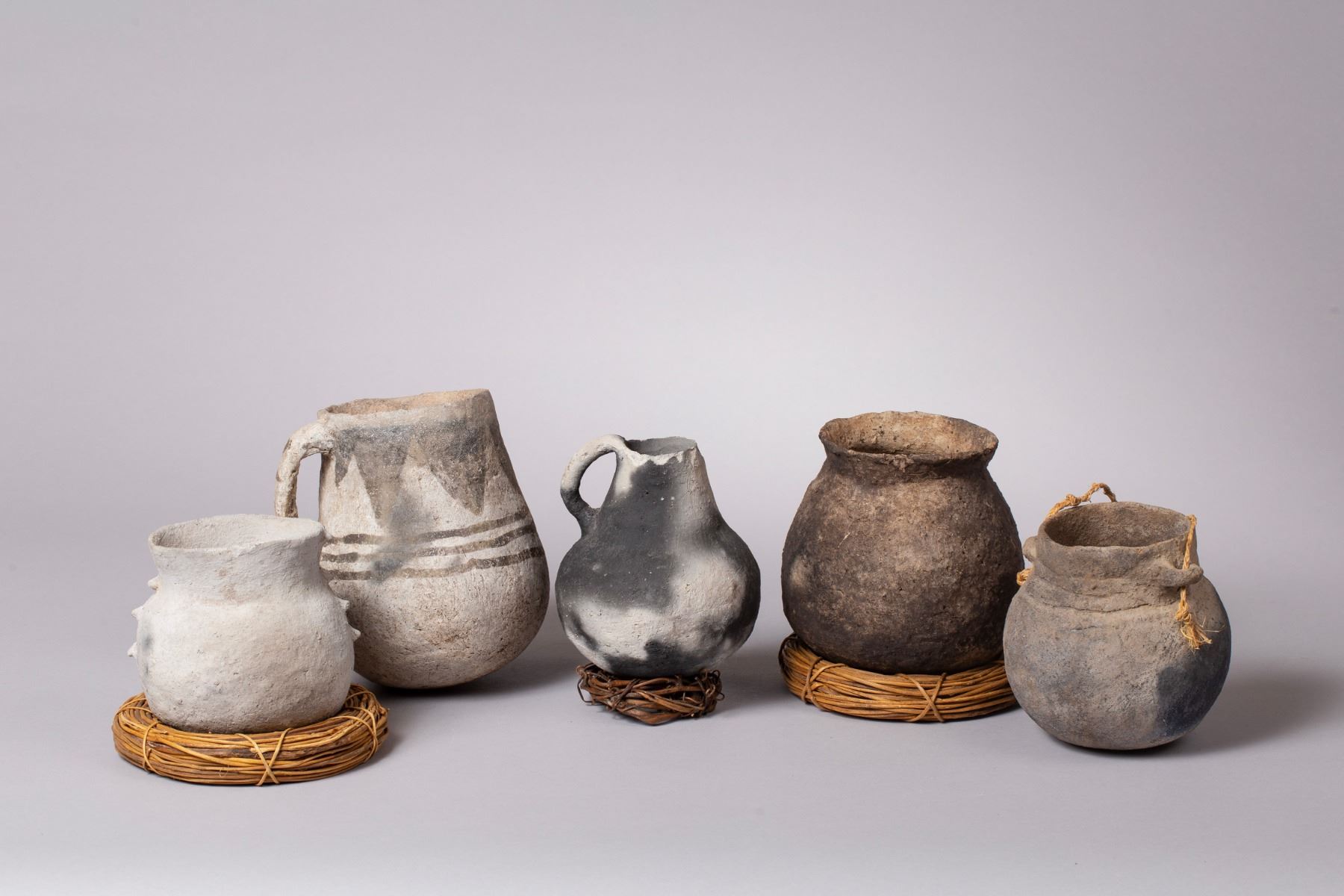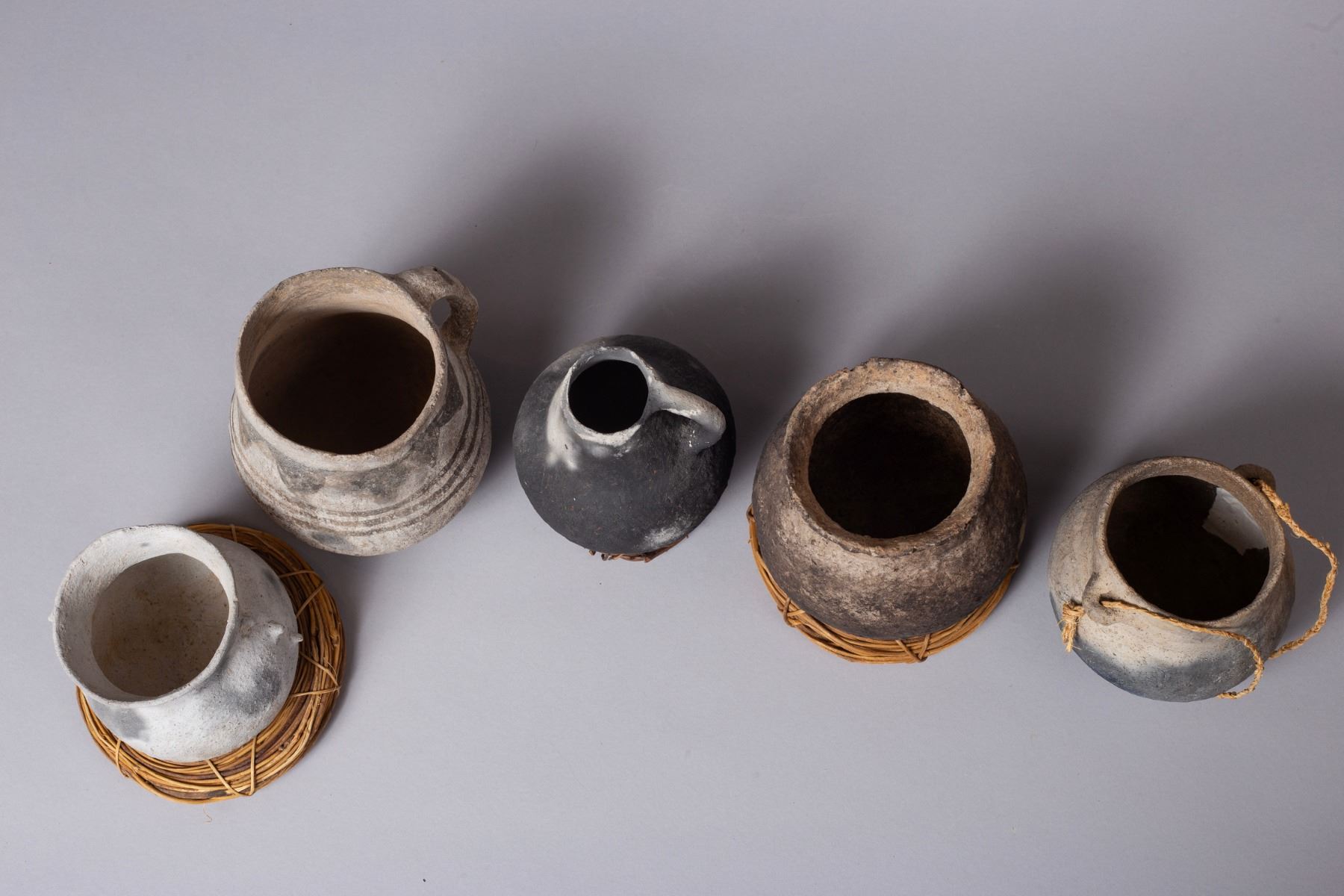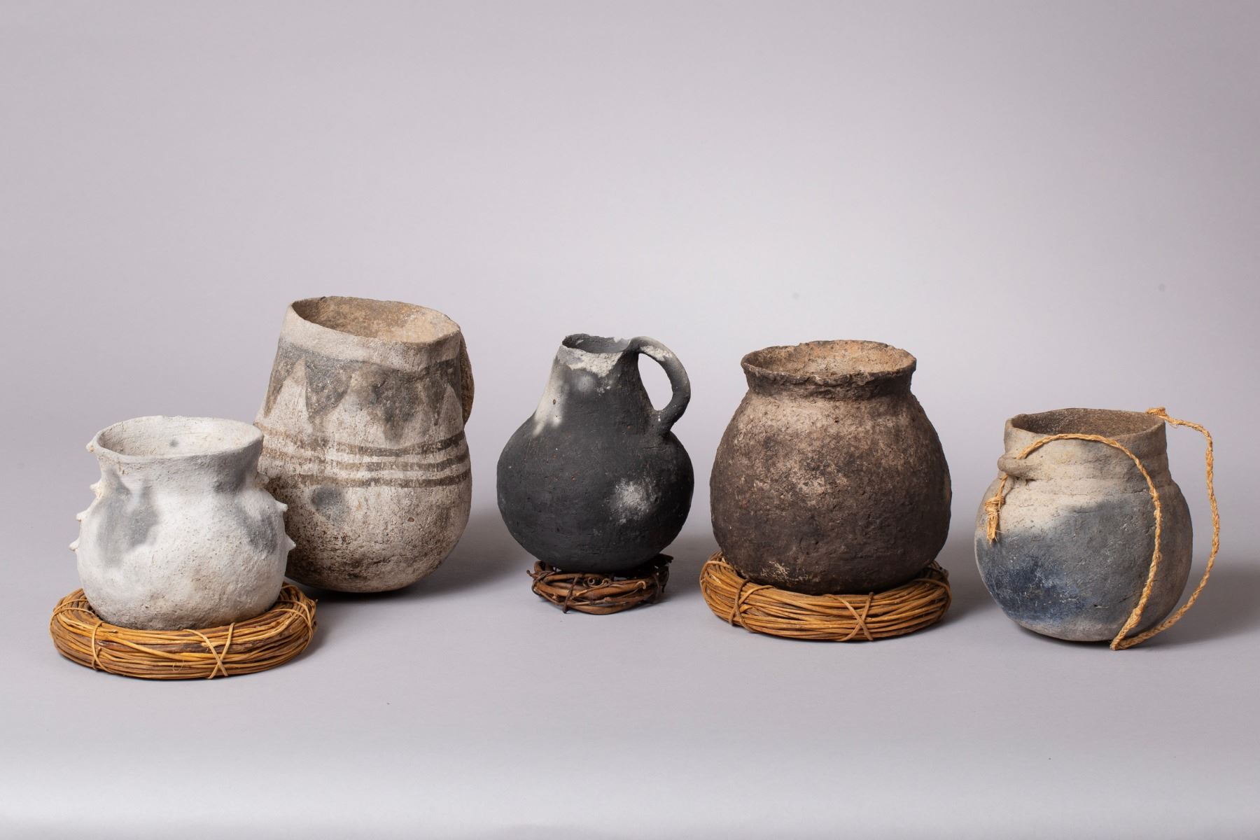 A wonderful group of five pots in various state of condition, the majority just re-glued and one intact: