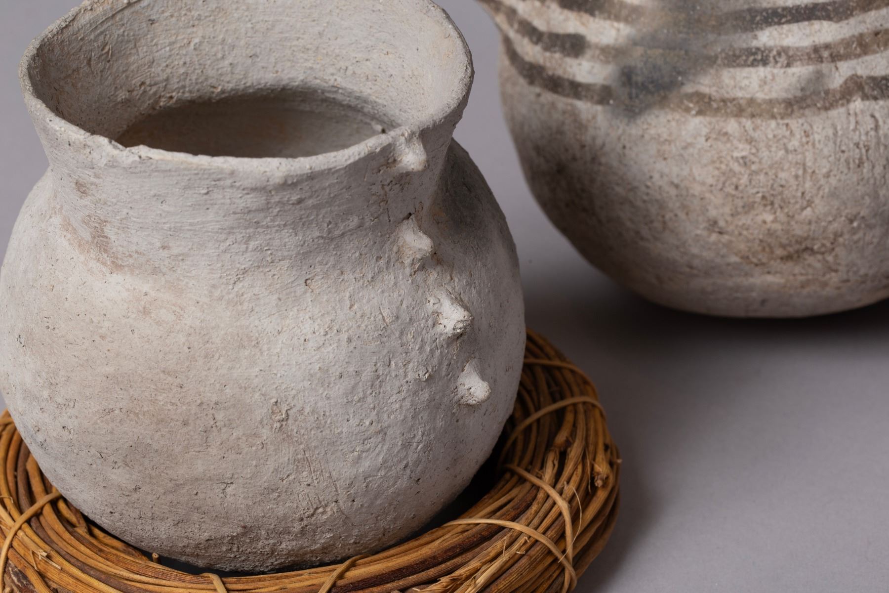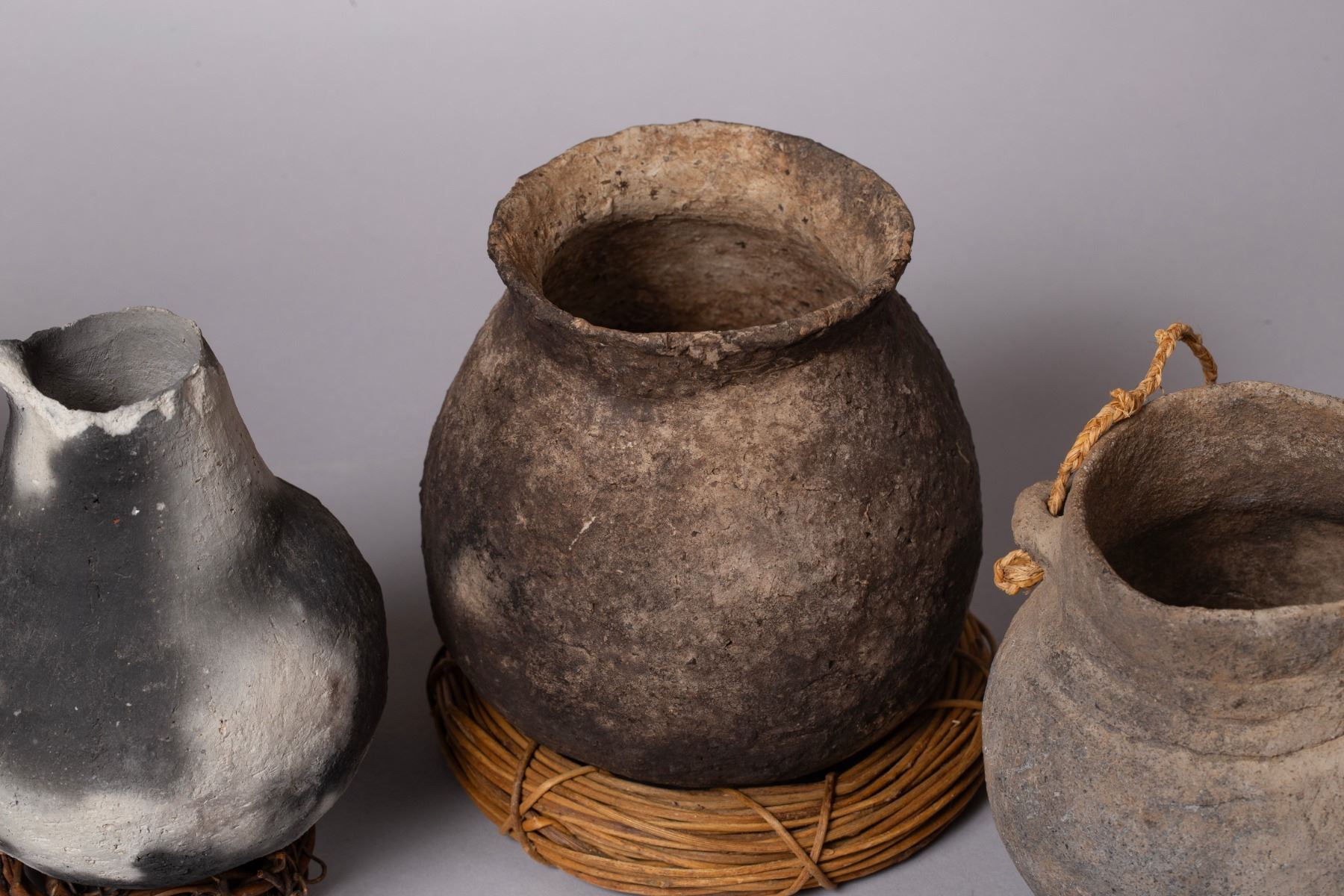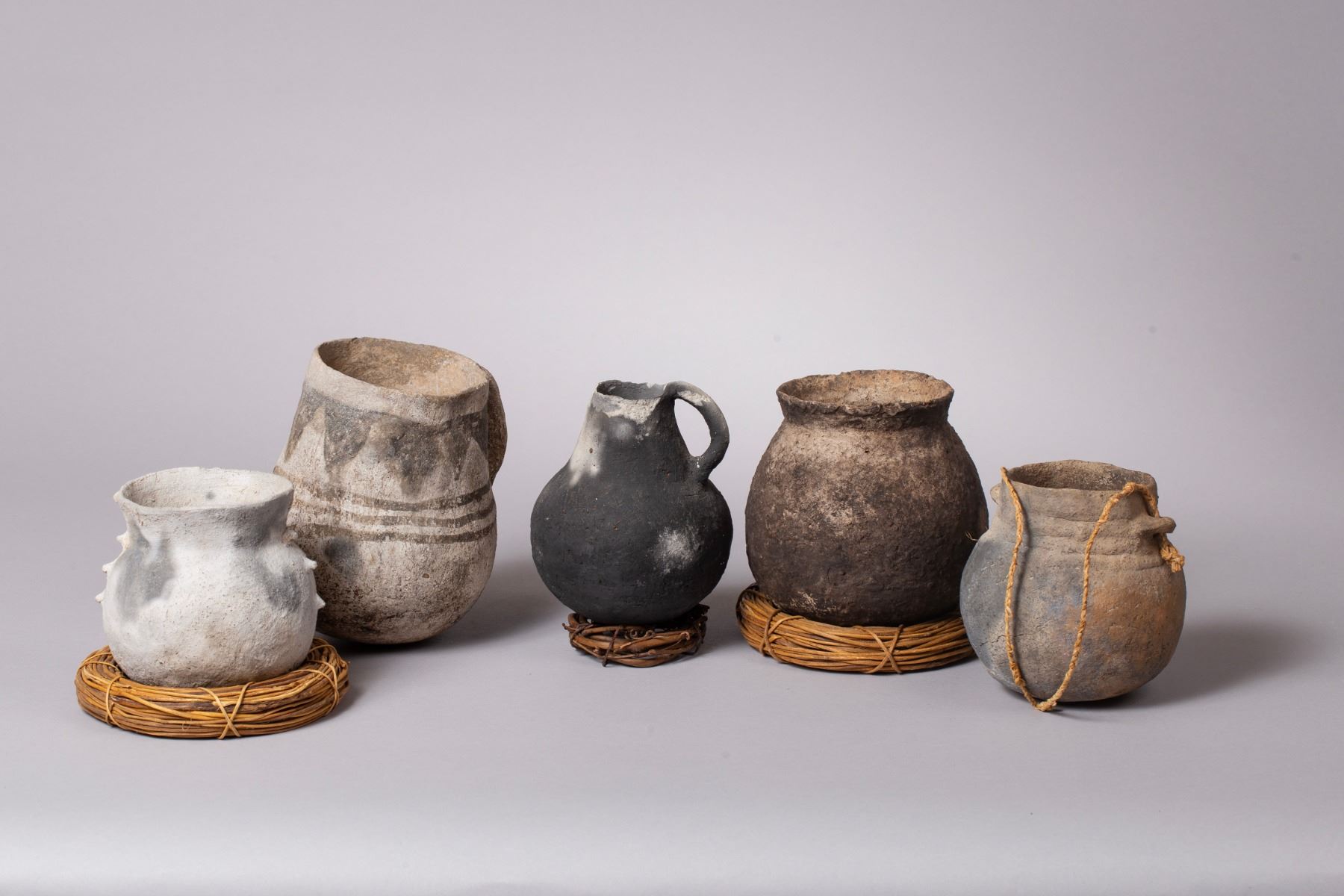 A wonderful group of five pots in various state of condition, the majority just re-glued and one intact: