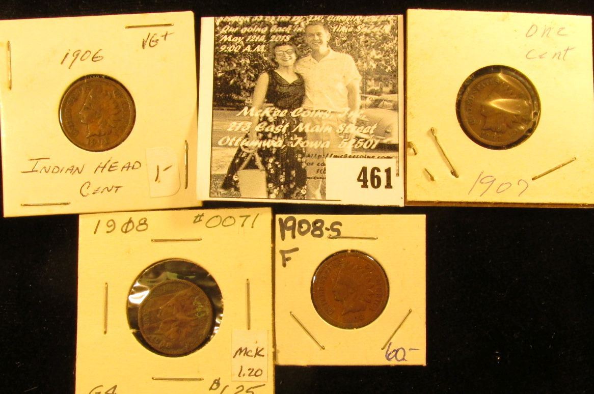 Group of Carded Indian Head Cents: 1906 VG, 07 G+, 08 Good, & 1908 S Fine.