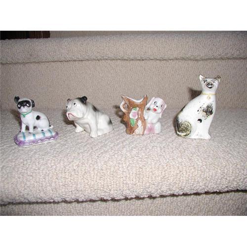 This is a group of Ceramic animals. Three dogs and a Staffordshire Cat. The dog on the pillow has a small nick on one ear. The other dogs have no chips or cracks. The dog with the vase (toothpick holder) has Japan marked on bottom. Most outstanding is the bulldog with the bee on it's head. The Staffordshire Cat is very old. The right ear looks to have been repaired. Nice group of animal ceramics.