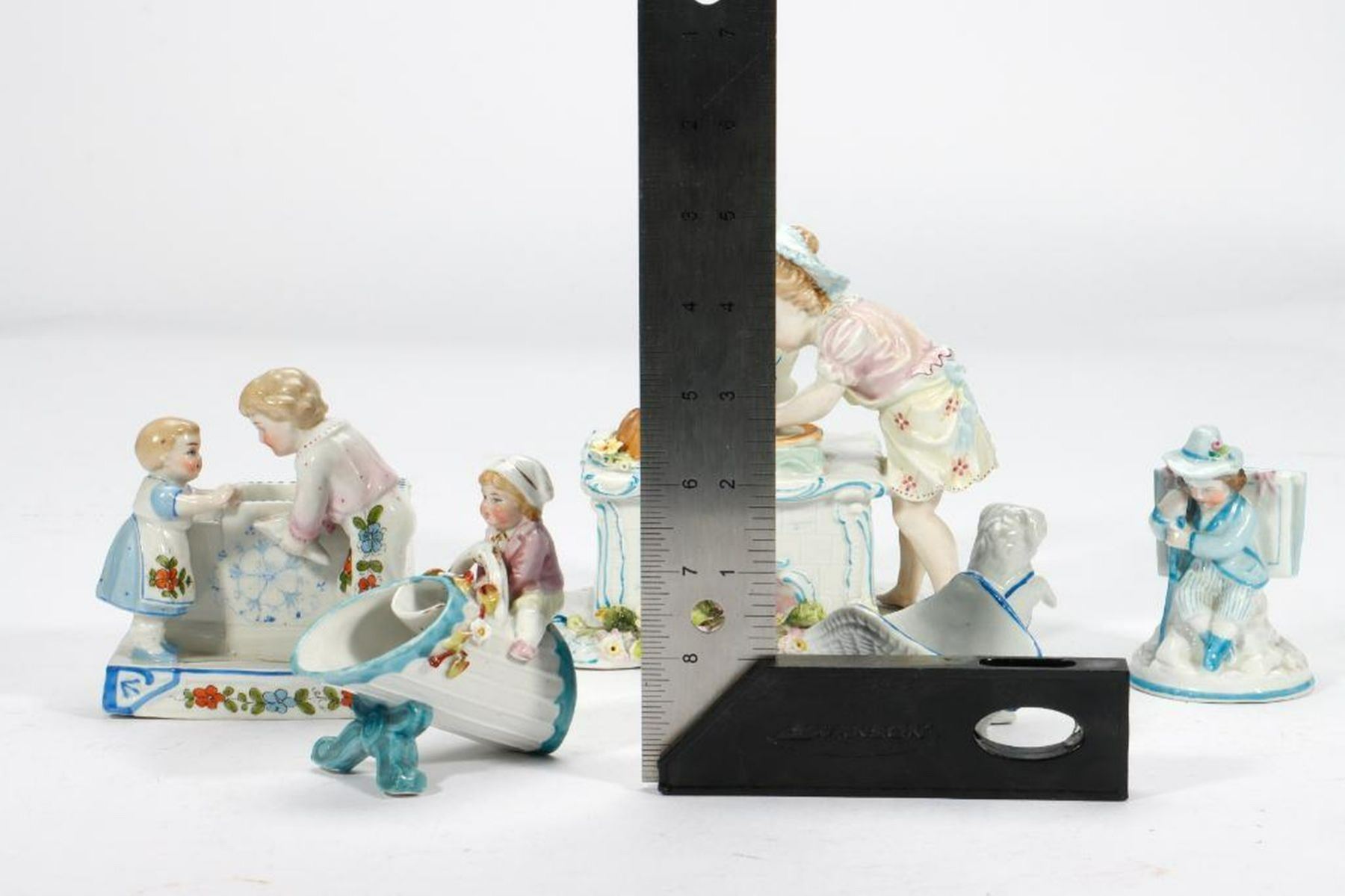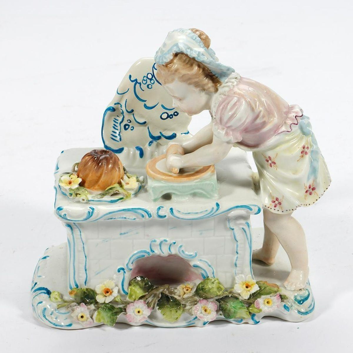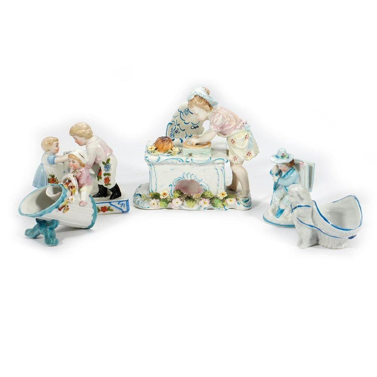 Including a figurine of a girl baking, a place card holder, and three bud vases/trinket dishes; all unmarked/numbers only. Ranging in height from 2 1/2in. to 5 3/4in. Condition: The baking girl with old repairs on her back, some broken-off flower leaves.