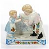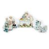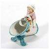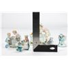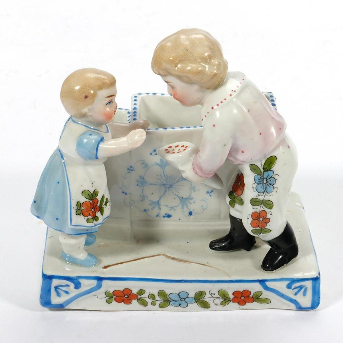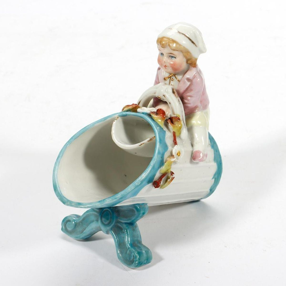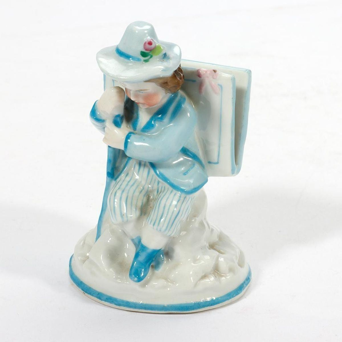Including a figurine of a girl baking, a place card holder, and three bud vases/trinket dishes; all unmarked/numbers only. Ranging in height from 2 1/2in. to 5 3/4in. Condition: The baking girl with old repairs on her back, some broken-off flower leaves.